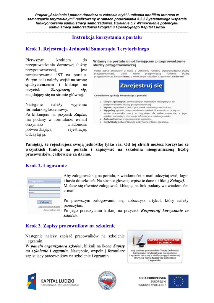 Projekt „Szkolenia i pomoc doradcza w zakresie etyki i unikania konfliktu interesu w samorządzie terytorialnym” realizowany w ramach poddziałania 5.2.2 Systemowego wsparcia funkcjonowania administracji samorządowej, Działanie 5.2 Wzmocnienie potencjału administracji samorządowej Programu Operacyjnego Kapitał Ludzki ----------------------------------------------------------------------------------------------------------------- Instrukcja korzystania z portalu Krok 1. Rejestracja Jednostki Samorządu Terytorialnego Pierwszym krokiem do przeprowadzania darmowej służby przygotowawczej, jest zarejestrowanie JST na portalu. W tym celu należy wejść na stronę sp.4system.com i kliknąć na przycisk Zarejestruj się, znajdujący się na stronie głównej. Następnie należy wypełnić formularz zgłoszeniowy. Po kliknięciu na przycisk Zapisz, ma podany w formularzu e-mail otrzymasz wiadomość potwierdzającą rejestrację. Odczytaj ją. Pamiętaj, że rejestrujesz swoją jednostkę tylko raz. Od tej chwili możesz korzystać ze wszystkich funkcji na portalu i zapisywać na szkolenia nieograniczoną liczbę pracowników, całkowicie za darmo. Krok 2. Logowanie Aby zalogować się na portalu, z wiadomości e-mail odczytaj swój login i hasło do szkoleń. Na stronie głównej wpisz te dane i kliknij Zaloguj. Możesz się również zalogować, klikając na link podany we wiadomości e-mail. Po pierwszym zalogowaniu się, zobaczysz artykuł, który należy przeczytać. Po jego przeczytaniu kliknij na przycisk Rozpocznij korzystanie ze szkoleń. Krok 3. Zapisy pracowników na szkolenie Następnie należy zapisać pracowników na szkolenie i egzamin. W panelu organizatora szkoleń, kliknij na ikonę Zapisy na szkolenie i egzamin. Następnie, wypełnij formularz zapisujący pracowników na szkolenie i egzamin. ----------------------------------------------------------------------------------------------------------------- Od tej chwili pracownik jest już zapisany na szkolenie i egzamin, a Ty nie musisz nic więcej robić. Pracownik będzie przechodził szkolenie na swoim stanowisku pracy w dogodnym dla siebie momencie. Pamiętaj, zapisując pracownika na szkolenie będzie on również zapisany na egzamin. Krok 4. Raport ze szkolenia W czasie trwania szkolenia, możesz monitorować postępy w nauce pracowników. W tym celu, w panelu organizatora szkoleń, kliknij na ikonę Raport ze szkolenia. Z listy wybierz nazwisko pracownika i kliknij Dalej. Na kolejnym ekranie zobaczysz raport ze szkolenia. Krok 5. Egzamin Aby pracownik mógł zadawać egzamin, musisz go udostępnić. W tym celu skorzystaj z Raportu z egzaminu. Z listy wybierz nazwisko pracownika i kliknij Dalej. Obok danych pracownika, kliknij Odblokuj. Pracownik, po zalogowanie się, uruchamia egzamin klikając na jego nazwę. Krok 6. Raport z egzaminu Po skończeniu egzaminu możesz zobaczyć raport. W tym celu, również skorzystaj z Raportu z egzaminu. Znajduje się w nim wynik uzyskany przez pracownika oraz data zdawania egzaminu. Możesz także zobaczyć odpowiedzi udzielone przez pracownika na poszczególne pytania. W tym celu obok danych pracownika kliknij Szczegóły. W nowym oknie otworzy się szczegółowy raport z egzaminu. Krok 7. Certyfikat Dla pracowników, którzy zdali egzamin można wydrukować certyfikat potwierdzający pozytywne zaliczenie egzaminu. W tym celu, w panelu organizatora szkoleń, kliknij na ikonę Certyfikat. Wybierz nazwisko pracownika i na następnym ekranie kliknij Pobierz. Szczegółowa instrukcja korzystania z portalu znajduje się na sp.4system.com.