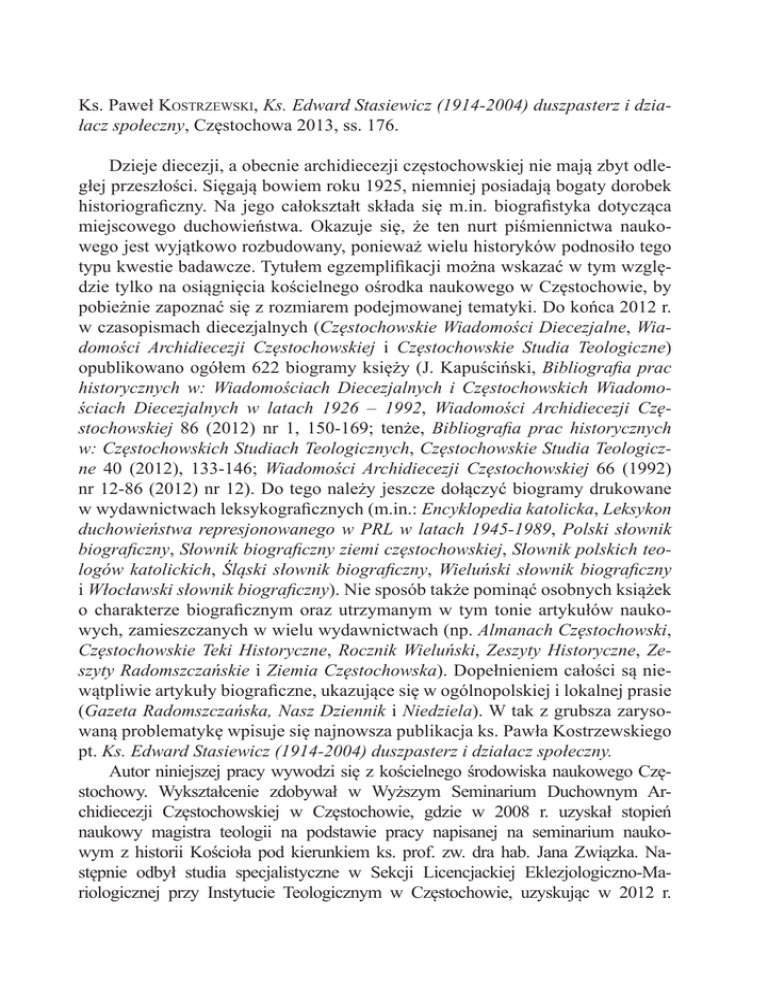 Ks. Paweł Kostrzewski, Ks. Edward Stasiewicz (1914-2004) duszpasterz i działacz społeczny, Częstochowa 2013, ss. 176. Dzieje diecezji, a obecnie archidiecezji częstochowskiej nie mają zbyt odległej przeszłości. Sięgają bowiem roku 1925, niemniej posiadają bogaty dorobek historiograficzny. Na jego całokształt składa się m.in. biografistyka dotycząca miejscowego duchowieństwa. Okazuje się, że ten nurt piśmiennictwa naukowego jest wyjątkowo rozbudowany, ponieważ wielu historyków podnosiło tego typu kwestie badawcze. Tytułem egzemplifikacji można wskazać w tym względzie tylko na osiągnięcia kościelnego ośrodka naukowego w Częstochowie, by pobieżnie zapoznać się z rozmiarem podejmowanej tematyki. Do końca 2012 r. w czasopismach diecezjalnych (Częstochowskie Wiadomości Diecezjalne, Wiadomości Archidiecezji Częstochowskiej i Częstochowskie Studia Teologiczne) opublikowano ogółem 622 biogramy księży (J. Kapuściński, Bibliografia prac historycznych w: Wiadomościach Diecezjalnych i Częstochowskich Wiadomościach Diecezjalnych w latach 1926 – 1992, Wiadomości Archidiecezji Częstochowskiej 86 (2012) nr 1, 150-169; tenże, Bibliografia prac historycznych w: Częstochowskich Studiach Teologicznych, Częstochowskie Studia Teologiczne 40 (2012), 133-146; Wiadomości Archidiecezji Częstochowskiej 66 (1992) nr 12-86 (2012) nr 12). Do tego należy jeszcze dołączyć biogramy drukowane w wydawnictwach leksykograficznych (m.in.: Encyklopedia katolicka, Leksykon duchowieństwa represjonowanego w PRL w latach 1945-1989, Polski słownik biograficzny, Słownik biograficzny ziemi częstochowskiej, Słownik polskich teologów katolickich, Śląski słownik biograficzny, Wieluński słownik biograficzny i Włocławski słownik biograficzny). Nie sposób także pominąć osobnych książek o charakterze biograficznym oraz utrzymanym w tym tonie artykułów naukowych, zamieszczanych w wielu wydawnictwach (np. Almanach Częstochowski, Częstochowskie Teki Historyczne, Rocznik Wieluński, Zeszyty Historyczne, Zeszyty Radomszczańskie i Ziemia Częstochowska). Dopełnieniem całości są niewątpliwie artykuły biograficzne, ukazujące się w ogólnopolskiej i lokalnej prasie (Gazeta Radomszczańska, Nasz Dziennik i Niedziela). W tak z grubsza zarysowaną problematykę wpisuje się najnowsza publikacja ks. Pawła Kostrzewskiego pt. Ks. Edward Stasiewicz (1914-2004) duszpasterz i działacz społeczny. Autor niniejszej pracy wywodzi się z kościelnego środowiska naukowego Częstochowy. Wykształcenie zdobywał w Wyższym Seminarium Duchownym Archidiecezji Częstochowskiej w Częstochowie, gdzie w 2008 r. uzyskał stopień naukowy magistra teologii na podstawie pracy napisanej na seminarium naukowym z historii Kościoła pod kierunkiem ks. prof. zw. dra hab. Jana Związka. Następnie odbył studia specjalistyczne w Sekcji Licencjackiej Eklezjologiczno-Mariologicznej przy Instytucie Teologicznym w Częstochowie, uzyskując w 2012 r. Recenzje 541 stopień naukowy licencjata teologii. Od 2011 r. podjął studia doktoranckie z zakresu historii w Akademii im. Jana Długosza w Częstochowie. Jest autorem wielu publikacji historycznych, zazwyczaj z problematyki regionalnej. Zarówno specjalistyczne wykształcenie, jak i wielość fachowo opracowanych publikacji, świadczą o jego kompetentnym warsztacie naukowym. Stąd recenzowana praca prezentuje wysokie walory historyczne. Impulsem do napisania niniejszego opracowania, jak sam Autor uzasadnił, była w pierwszej kolejności przypadająca na rok 2014 setna rocznica urodzin bohatera książki, a także próba odpowiedzi na apel jednego z księży rodaków o napisanie „biografii zasłużonego dla ziemi krzepickiej duszpasterza” (s. 11). Oczywiście, nie należy w tym wszystkim pomijać osobistych względów Autora, który znał prywatnie ks. E. Stasiewicza. Ponadto dotychczasowa o nim literatura nie podejmowała wielu wnikliwych i wielopłaszczyznowych wątków, stąd dobrze się stało, że Autor podjął zakrojone na szeroką skalę badania naukowe, by w konsekwencji dać wyczerpujący opis jego życia i działalności. Walor naukowy pracy zdecydowanie został podniesiony przez recenzję wydawniczą, którą przygotował prof. zw. dr hab. Tadeusz Dubicki. Całość opracowania otwiera przedmowa autorstwa ks. prof. zw. dra hab. Jana Związka, który stwierdził: „Książka została napisana poprawnym językiem polskim, dzięki czemu jej lektura wciąga czytelnika w omawianą problematykę i budzi coraz większe zainteresowanie. Wobec powyższego powinna znaleźć licznych odbiorców tak wśród starszych jak i młodzieży dla której życie i działalność ks. Stasiewicza mogą być wzorem do naśladowania” (s. 9). Wywód ten w pełni posiada uzasadnienie w zamieszczonej treści. Korpus pracy Autor podzielił na sześć rozdziałów, które chronologicznie przedstawiają życiorys opisywanego bohatera. W rozdziale pierwszym (s. 17-20) ukazano środowisko rodzinne i młodość ks. Stasiewicza. Warto podkreślić, że urodził się na Nowogródczyźnie, gdzie jego rodzice pracowali w majątku ordynata Adama Marii Jana Branickiego. W czasie wojny polsko-bolszewickiej Stasiewiczowie opuścili rodzime tereny i osiedlili się w Radomsku. Tam ks. Stasiewicz uzyskał wykształcenie w zakresie szkoły powszechnej i gimnazjalnej. Jego katechetą był m.in. ks. Bogumił Kasprzak, obdarzony wyjątkowym talentem pedagogicznym, dzięki któremu młody Edward podjął decyzję o wstąpieniu do seminarium duchownego. Cały okres formacji do kapłaństwa Autor opisał w rozdziale drugim (s. 2128), zatytułowanym: „Studia teologiczne w Krakowie (1932-1937)”. Edukację filozoficzno-teologiczną ks. Edward Stasiewicz odbył w Częstochowskim Seminarium Duchownym w Krakowie. Należy w tym miejscu nadmienić, że miejscowi alumni wykształcenie intelektualne zdobywali na Wydziale Teologicznym Uniwersytetu Jagiellońskiego; wśród