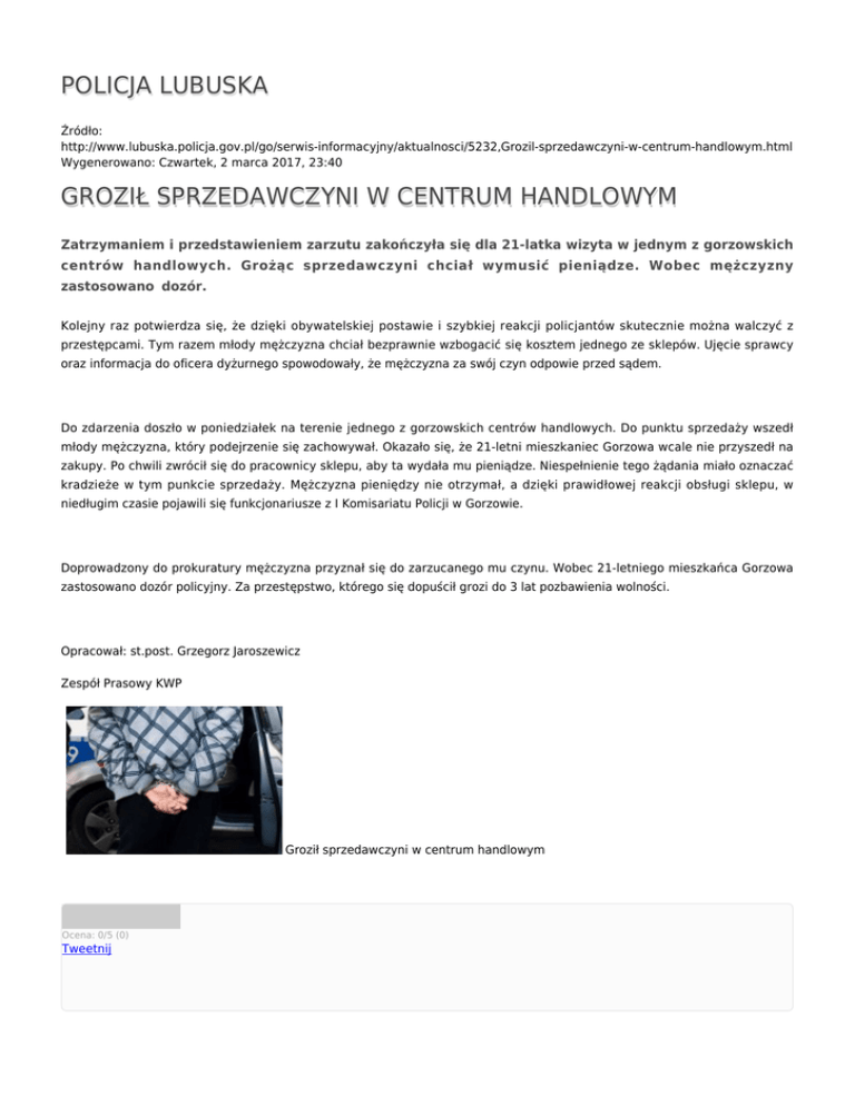 POLICJA LUBUSKA Źródło: http://www.lubuska.policja.gov.pl/go/serwis-informacyjny/aktualnosci/5232,Grozil-sprzedawczyni-w-centrum-handlowym.html Wygenerowano: Czwartek, 2 marca 2017, 23:40 GROZIŁ SPRZEDAWCZYNI W CENTRUM HANDLOWYM Zatrzymaniem i przedstawieniem zarzutu zakończyła się dla 21-latka wizyta w jednym z gorzowskich centrów handlowych. Grożąc sprzedawczyni chciał wymusić pieniądze. Wobec mężczyzny zastosowano dozór. Kolejny raz potwierdza się, że dzięki obywatelskiej postawie i szybkiej reakcji policjantów skutecznie można walczyć z przestępcami. Tym razem młody mężczyzna chciał bezprawnie wzbogacić się kosztem jednego ze sklepów. Ujęcie sprawcy oraz informacja do oficera dyżurnego spowodowały, że mężczyzna za swój czyn odpowie przed sądem. Do zdarzenia doszło w poniedziałek na terenie jednego z gorzowskich centrów handlowych. Do punktu sprzedaży wszedł młody mężczyzna, który podejrzenie się zachowywał. Okazało się, że 21-letni mieszkaniec Gorzowa wcale nie przyszedł na zakupy. Po chwili zwrócił się do pracownicy sklepu, aby ta wydała mu pieniądze. Niespełnienie tego żądania miało oznaczać kradzieże w tym punkcie sprzedaży. Mężczyzna pieniędzy nie otrzymał, a dzięki prawidłowej reakcji obsługi sklepu, w niedługim czasie pojawili się funkcjonariusze z I Komisariatu Policji w Gorzowie. Doprowadzony do prokuratury mężczyzna przyznał się do zarzucanego mu czynu. Wobec 21-letniego mieszkańca Gorzowa zastosowano dozór policyjny. Za przestępstwo, którego się dopuścił grozi do 3 lat pozbawienia wolności. Opracował: st.post. Grzegorz Jaroszewicz Zespół Prasowy KWP Groził sprzedawczyni w centrum handlowym Ocena: 0/5 (0) Tweetnij