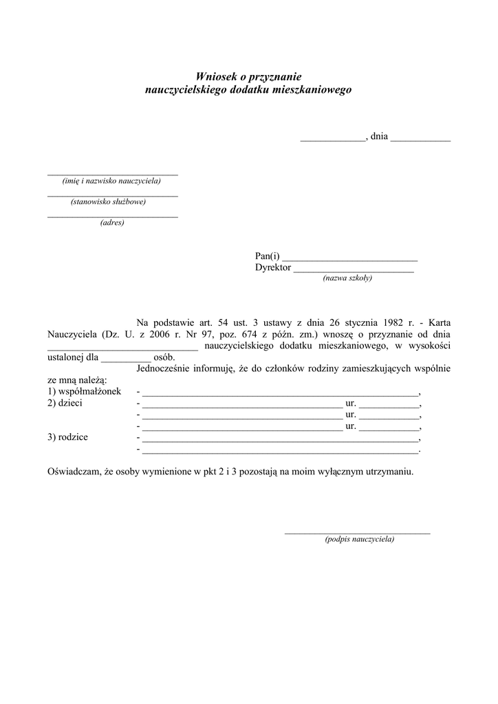 Wniosek o przyznanie nauczycielskiego dodatku mieszkaniowego _____________, dnia ____________ __________________________ (imię i nazwisko nauczyciela) __________________________ (stanowisko służbowe) __________________________ (adres) Pan(i) ___________________________ Dyrektor ________________________ (nazwa szkoły) Na podstawie art. 54 ust. 3 ustawy z dnia 26 stycznia 1982 r. - Karta Nauczyciela (Dz. U. z 2006 r. Nr 97, poz. 674 z późn. zm.) wnoszę o przyznanie od dnia ______________________________ nauczycielskiego dodatku mieszkaniowego, w wysokości ustalonej dla __________ osób. Jednocześnie informuję, że do członków rodziny zamieszkujących wspólnie ze mną należą: 1) współmałżonek - _______________________________________________________, 2) dzieci - ________________________________________ ur. ____________, - ________________________________________ ur. ____________, - ________________________________________ ur. ____________, 3) rodzice - _______________________________________________________, - _______________________________________________________. Oświadczam, że osoby wymienione w pkt 2 i 3 pozostają na moim wyłącznym utrzymaniu. _____________________________ (podpis nauczyciela)