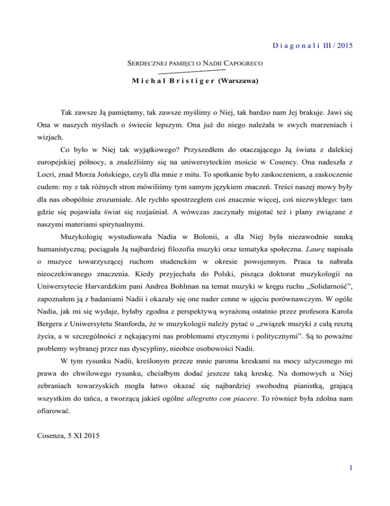 D i a g o n a l i III / 2015 SERDECZNEJ PAMIĘCI O NADII CAPOGRECO M i c h a ł B r i s t i g e r (Warszawa) Tak zawsze Ją pamiętamy, tak zawsze myślimy o Niej, tak bardzo nam Jej brakuje. Jawi się Ona w naszych myślach o świecie lepszym. Ona już do niego należała w swych marzeniach i wizjach. Co było w Niej tak wyjątkowego? Przyszedłem do otaczającego Ją świata z dalekiej europejskiej północy, a znaleźliśmy się na uniwersyteckim moście w Cosency. Ona nadeszła z Locri, znad Morza Jońskiego, czyli dla mnie z mitu. To spotkanie było zaskoczeniem, a zaskoczenie cudem: my z tak różnych stron mówiliśmy tym samym językiem znaczeń. Treści naszej mowy były dla nas obopólnie zrozumiałe. Ale rychło spostrzegłem coś znacznie więcej, coś niezwykłego: tam gdzie się pojawiała świat się rozjaśniał. A wówczas zaczynały migotać też i plany związane z naszymi materiami spirytualnymi. Muzykologię wystudiowała Nadia w Bolonii, a dla Niej była niezawodnie nauką humanistyczną; pociągała Ją najbardziej filozofia muzyki oraz tematyka społeczna. Laurę napisała o muzyce towarzyszącej ruchom studenckim w okresie powojennym. Praca ta nabrała nieoczekiwanego znaczenia. Kiedy przyjechała do Polski, pisząca doktorat muzykologii na Uniwersytecie Harvardzkim pani Andrea Bohlman na temat muzyki w kręgu ruchu „Solidarność”, zapoznałem ją z badaniami Nadii i okazały się one nader cenne w ujęciu porównawczym. W ogóle Nadia, jak mi się wydaje, byłaby zgodna z perspektywą wyrażoną ostatnio przez profesora Karola Bergera z Uniwersytetu Stanforda, że w muzykologii należy pytać o „związek muzyki z całą resztą życia, a w szczególności z nękającymi nas problemami etycznymi i politycznymi”. Są to poważne problemy wybranej przez nas dyscypliny, nieobce osobowości Nadii. W tym rysunku Nadii, kreślonym przeze mnie paroma kreskami na mocy użyczonego mi prawa do chwilowego rysunku, chciałbym dodać jeszcze taką kreskę. Na domowych u Niej zebraniach towarzyskich mogła łatwo okazać się najbardziej swobodną pianistką, grającą wszystkim do tańca, a tworzącą jakieś ogólne allegretto con piacere. To również była zdolna nam ofiarować. Cosenza, 5 XI 2015 1