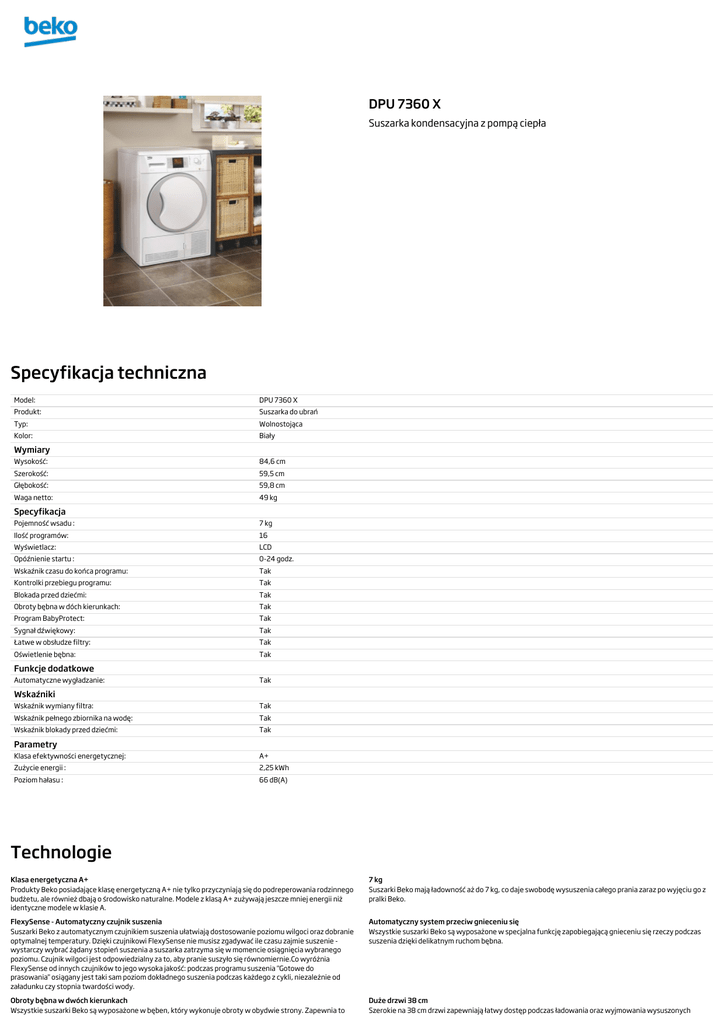 DPU 7360 X Suszarka kondensacyjna z pompą ciepła Specyfikacja techniczna Model: DPU 7360 X Produkt: Suszarka do ubrań Typ: Wolnostojąca Kolor: Biały Wymiary Wysokość: 84,6 cm Szerokość: 59,5 cm Głębokość: 59,8 cm Waga netto: 49 kg Specyfikacja Pojemność wsadu : 7 kg Ilość programów: 16 Wyświetlacz: LCD Opóźnienie startu : 0-24 godz. Wskaźnik czasu do końca programu: Tak Kontrolki przebiegu programu: Tak Blokada przed dziećmi: Tak Obroty bębna w dóch kierunkach: Tak Program BabyProtect: Tak Sygnał dźwiękowy: Tak Łatwe w obsłudze filtry: Tak Oświetlenie bębna: Tak Funkcje dodatkowe Automatyczne wygładzanie: Tak Wskaźniki Wskaźnik wymiany filtra: Tak Wskaźnik pełnego zbiornika na wodę: Tak Wskaźnik blokady przed dziećmi: Tak Parametry Klasa efektywności energetycznej: A+ Zużycie energii : 2,25 kWh Poziom hałasu : 66 dB(A) Technologie Klasa energetyczna A+ Produkty Beko posiadające klasę energetyczną A+ nie tylko przyczyniają się do podreperowania rodzinnego budżetu, ale również dbają o środowisko naturalne. Modele z klasą A+ zużywają jeszcze mniej energii niż identyczne modele w klasie A. 7 kg Suszarki Beko mają ładowność aż do 7 kg, co daje swobodę wysuszenia całego prania zaraz po wyjęciu go z pralki Beko. FlexySense - Automatyczny czujnik suszenia Suszarki Beko z automatycznym czujnikiem suszenia ułatwiają dostosowanie poziomu wilgoci oraz dobranie optymalnej temperatury. Dzięki czujnikowi FlexySense nie musisz zgadywać ile czasu zajmie suszenie wystarczy wybrać żądany stopień suszenia a suszarka zatrzyma się w momencie osiągnięcia wybranego poziomu. Czujnik wilgoci jest odpowiedzialny za to, aby pranie suszyło się równomiernie.Co wyróżnia FlexySense od innych czujników to jego wysoka jakość: podczas programu suszenia "Gotowe do prasowania" osiągany jest taki sam poziom dokładnego suszenia podczas każdego z cykli, niezależnie od załadunku czy stopnia twardości wody. Automatyczny system przeciw gnieceniu się Wszystkie suszarki Beko są wyposażone w specjalna funkcję zapobiegającą gnieceniu się rzeczy podczas suszenia dzięki delikatnym ruchom bębna. Obroty bębna w dwóch kierunkach Wszystkie suszarki Beko są wyposażone w bęben, który wykonuje obroty w obydwie strony. Zapewnia to Duże drzwi 38 cm Szerokie na 38 cm drzwi zapewniają łatwy dostęp podczas ładowania oraz wyjmowania wysuszonych jednolite suszenie oraz zapobiega gnieceniu się rzeczy. rzeczy, nawet tak dużych jak pościel czy koce. Sygnał dźwiękowy Dźwiękowy sygnał rozlega się w momencie zakończenia się suszenia. Można go wyłączyć w każdej chwili. Program do suszenia koszul Podczas suszenia koszul mogą one ulec zniszczeniu a ich kolor może wyblaknąć. Program Shirt został specjalnie stworzony aby uniknąć tych problemów. Jest to delikatny cykl suszenia koszul w niskiej temperaturze co zapobiega zniszczeniom tkaniny oraz zachowuje kolor. Dzięki temu możesz cieszyć się ubraniami przez długi czas. Program Mini Ten specjalny program pozawala wysuszyć 1 kg prania w jedynie 30 minut, co zapobiegnie czasochłonnemu oczekiwaniu na suche rzeczy. 16 programów W tym m.in. programy.: Bawełna, BabyProtect, Daily Express, Dark Care, Self Clean, Pranie ręczne, Wełna, Syntetyki i inne. Program Mix Nowy program oferowany przez suszarki Beko umożliwia równoczesne suszenie tkanin syntetycznych i bawełnianych, eliminując konieczność segregacji ubrań ze względu na rodzaj tkaniny. Program Mix stanowi doskonałe uzupełnienie dostępnego w pralkach Beko programu pozwalającego na łączne pranie różnych tkanin. Program Jeans Standardowe cykle nie zawsze radzą sobie z suszeniem grubszych tkanin, zwłaszcza wzdłuż szwów, gdzie warstwa materiału jest zdecydowanie grubsza. W odpowiedzi na ten problem, Beko opracowało specjalny program Jeans, gwarantujący równomierne wysuszenie odzieży z grubszych tkanin, takich jak dżins i polar. Program Daily Wiemy, że Twój czas jest cenny i że cenisz osiąganie szybkich rezultatów, a Beko robi wszystko, aby zapewnić jak najbardziej efektywne i przyjazne w użytkowaniu produkty. W zgodzie z tą filozofią powstał program Daily, który umożliwia wysuszenie 4 kg prania w zaledwie godzinę. Pompa ciepła Kondensacyjne suszarki Beko wyposażone w pompę ciepła to połączenie najwyższej wydajności i niskiego zużycia energii. Innowacyjna technologia, wykorzystująca chłodzący i grzewczy element pompy ciepła zapewnia najlepsze rezultaty w niższej temperaturze suszenia. Łącznik pralki z suszarką Tę suszarkę - za pomocą specjalnego łącznika - z łatwością ustawisz na pralce (od 50 cm głębokości). Program BabyProtect: Dzięki czujnikom temperatury i wilgotności, specjalny program BabyProtect precyzyjnie kontroluje warunki panujące wewnątrz bębna, dobierając ustawienia optymalne do suszenia ubranek Twoich dzieci oraz bliskich