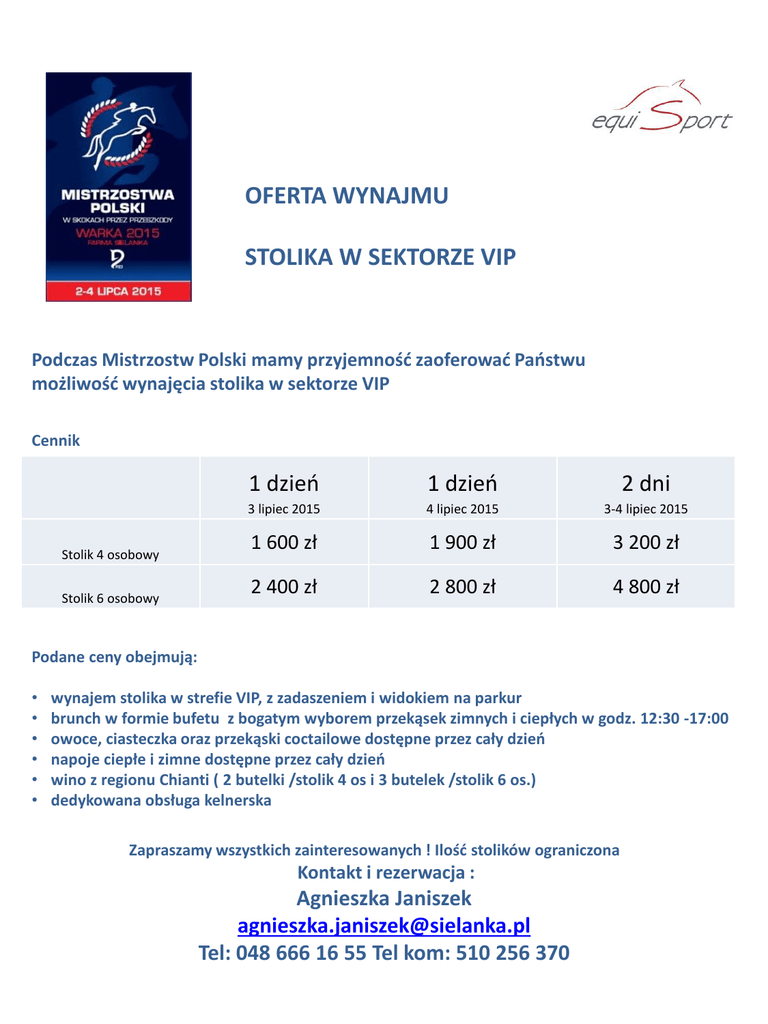 OFERTA WYNAJMU STOLIKA W SEKTORZE VIP Podczas Mistrzostw Polski mamy przyjemność zaoferować Państwu możliwość wynajęcia stolika w sektorze VIP Cennik Stolik 4 osobowy Stolik 6 osobowy 1 dzień 1 dzień 2 dni 3 lipiec 2015 4 lipiec 2015 3-4 lipiec 2015 1 600 zł 1 900 zł 3 200 zł 2 400 zł 2 800 zł 4 800 zł Podane ceny obejmują: • • • • • • wynajem stolika w strefie VIP, z zadaszeniem i widokiem na parkur brunch w formie bufetu z bogatym wyborem przekąsek zimnych i ciepłych w godz. 12:30 -17:00 owoce, ciasteczka oraz przekąski coctailowe dostępne przez cały dzień napoje ciepłe i zimne dostępne przez cały dzień wino z regionu Chianti ( 2 butelki /stolik 4 os i 3 butelek /stolik 6 os.) dedykowana obsługa kelnerska Zapraszamy wszystkich zainteresowanych ! Ilość stolików ograniczona Kontakt i rezerwacja : Agnieszka Janiszek [email protected] Tel: 048 666 16 55 Tel kom: 510 256 370