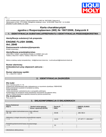 1/7 Karta charakterystyki zgodna z Rozporządzeniem (WE) Nr 1907/2006, Załącznik II Opracowano w dniu: 14.10.2008 Zastąpiona redakcja z dnia: 04.06.2008 Data PDF: 14.10.2008 ENGINE FLUSH 300ML Art.:2640 Karta charakterystyki zgodna z Rozporządzeniem (WE) Nr 1907/2006, Załącznik II 1. IDENTYFIKACJA SUBSTANCJI/PREPARATU I IDENTYFIKACJA PRZEDSIĘBIORSTWA Identyfikacja substancji lub preparatu ENGINE FLUSH 300ML Art.:2640 Zastosowanie substancji/preparatu środek czyszczący Identyfikacja przedsiębiorstwa LIQUI MOLY GmbH, Jerg-Wieland-Straße 4, D-89081 Ulm-Lehr Telefon (+49) 0731-1420-0, Telefax (+49) 0731-1420-88 Adres e-mailowy osoby kompetentnej: [email protected], [email protected] Numer alarmowy Ambulatorium przy objawach zatrucia : Tel.: Numer alarmowy spółki: Tel. (+49) 0731-1420-0 2. IDENTYFIKACJA ZAGROŻEŃ Dla ludzi Patrz również punkt 11 i 15. Preparat jest sklasyfikowany jako niebezpieczny w rozumieniu dyrektywy 1999/45/WE. Może powodować uczulenie w kontakcie ze skórą. Działa szkodliwie może powodować uszkodzenie płuc w przypadku połknięcia. Powtarzające się narażenie może powodować wysuszenie lub pękanie skóry. Użycie: możliwe powstanie zapalnej mieszaniny parowo-powietrznej. Dla środowiska Patrz punkt 12. 3. SKŁAD/INFORMACJA O SKŁADNIKACH Nazwa Substancji Stęż.% Zwroty R DNEL EINECS, ELINCS PNEC Benzyna ciężka hydroodsiarczona (ropa naftowa) 60 - 80 Xn 65-66 265-185-4 Alkilowany (o dlugim lancuchu) arylosulfonian wapnia 1-5 --- 43-53 271-877-7 + 290-636-7 Poliolefinopoliaminoimid kwasu bursztynowego 1-5 53 ditiofosforan alkilocynkowy Symbol ostrze-gawczy Numer rejestracji (ECHA) 2/7 Karta charakterystyki zgodna z Rozporządzeniem (WE) Nr 1907/2006, Załącznik II Opracowano w dniu: 14.10.2008 Zastąpiona redakcja z dnia: 04.06.2008 Data PDF: 14.10.2008 ENGINE FLUSH 300ML Art.:2640 1-5 Xi 36/38 Izotridekanol etoksylowany 1 -< 5 Xi 41 Pełne brzmienie zwrotów R patrz punkt 16. 4. PIERWSZA POMOC 4.1 Drogi oddechowe Osobę usunąć z zagrożonej strefy. Osobie zapewnić dopływ świeżego powietrza, w zależności od objawów skonsultować się z lekarzem. W przypadku utraty przytomności poszkodowanego położyć w stabilnej pozycji bocznej i bezzwłocznie zasięgnąć porady lekarskiej. 4.2 Kontakt z oczami Usunąć szkła kontaktowe. Przez kilka minut dokładnie spłukać dużą ilością wody, jeżeli potrzeba, udać się do lekarza. 4.3 Kontakt ze skórą Umyć gruntownie mydłem z dużą ilością wody, zanieczyszczone, przesiąknięte części ubrania niezwłocznie usunąć, przy podrażnieniu skóry (zaczerwienienie itp.), skonsultować się z lekarzem. 4.4 Drogi pokarmowe Jamę ustną dokładnie przepłukać wodą. Nie wywoływać wymiotów, podać dużą ilość wody do picia, natychmiast udać się do lekarza. Niebezpieczeństwo aspiracji Przy wymiotach trzymać głowę nisko, aby treść żołądka nie dostała się do płuc. 4.5 Szczególnie polecane środki pierwszej pomocy Wskazówki dla lekarza: Leczenie objawowe Połknięcie: Węgiel aktywny Płukanie żołądka tylko pod intubacją śródtchawiczą. Następnie obserwacja co do zapalenia płuc i obrzęku płuc. 5. POSTĘPOWANIE W PRZYPADKU POŻARU 5.1 Stosownych środków gaśniczych Dwutlenek wegla (CO2). proszek gaśniczy Piana. Rozpylony strumień wody. Zagrożone pojemniki chłodzić wodą. 5.2 Środków gaśniczych, które nie są używane ze względów bezpieczeństwa Pełny strumień wody. 5.3 Specjalnych zagrożeń związanych z narażeniem wynikających z właściwości substancji lub preparatu jako takiego, produktów spalania, powstających gasów W przypadku pożaru mogą powstać: Tlenki węgla. Węglowodory Toksyczne produkty rozkładu termicznego. Zapalne mieszaniny parowo-powietrzne Niebezpieczne opary, cięższe od powietrza. Rozkład w pobliżu ziemi może spowodować ponowny zapłon w oddalonych źródłach zapłonu. 5.4 Specjalnego sprzętu ochronnego dla strażaków Nie wdychać dymów powstających w wyniku pożaru lub wybuchu. Sprzęt ochrony dróg oddechowych niezależny od powietrza otoczenia. Według wielkości pożaru. W razie potrzeby - pełna ochrona. 5.5 Pozostałe uwagi Skażoną wodę gaśniczą zneutralizować zgodnie z przepisami administracyjnymi 3/7 Karta charakterystyki zgodna z Rozporządzeniem (WE) Nr 1907/2006, Załącznik II Opracowano w dniu: 14.10.2008 Zastąpiona redakcja z dnia: 04.06.2008 Data PDF: 14.10.2008 ENGINE FLUSH 300ML Art.:2640 6. POSTĘPOWANIE W PRZYPADKU NIEZAMIERZONEGO UWOLNIENIA DO ŚRODOWISKA Patrz punkt 13., odnośnie osobistego wyposażenia ochronnego patrz punkt 8. 6.1 Indywidualnych środków ostrożności Oddalić źródło ognia, nie palić tytoniu. Dbać o wystarczającą wentylację nawiewną. Unikać kontaktu z oczami, skórą, a także wdychania (inhalacji). W danym przypadku mieć na względzie niebezpieczeństwo poślizgu. 6.2 Środków ostrożności w odniesieniu do środowiska Przy ulatnianiu się większej ilości zatamować. Nie wprowadzać do kanalizacji. Unikać przenikania do wód gruntowych i powierzchniowych, a również do gruntu. Przy przedostaniu się do kanalizacji w wyniku wypadku, informować właściwe władze. 6.3 Metody oczyszczania Zebrać materiałem chłonnym (np.: uniwersalny środek wiążący) i usuwać zgodnie z punktem 13. 7. POSTĘPOWANIE Z SUBSTANCJĄ/PREPARATEM I JEJ/JEGO MAGAZYNOWANIE 7.1 Postępowanie z substancją/preparatem Wskazówki bezpiecznego postępowania: Patrz punkt 6.1 Dbać o dobrą wentylację pomieszczenia. Oddalić źródła ognia - nie palić tytoniu. Nie ogrzewać do temperatury bliskiej temperaturze zapłonu. Ew. przedsięwziąć środki przeciw naładowaniu elektrostatycznemu. Unikać kontaktu z oczami i skórą. Nie nosić ze sobą w kieszeniach spodni żadnych ścierek do czyszczenia nasączonych produktem. Zabrania sie jeść, pić, palić, a także przechowywać artykuły żywnościowe w pomieszczeniu roboczym. Przestrzegać wskazówek na etykiecie, j