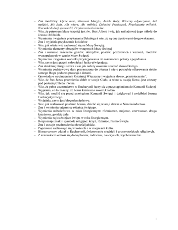 – Zna modlitwy: Ojcze nasz, Zdrowaś Maryjo, Aniele Boży, Wieczny odpoczynek, Akt nadziei, Akt żalu, Akt wiary, Akt miłości, Dziesięć Przykazań, Przykazanie miłości, Warunki dobrej spowiedzi, Przykazania kościelne. – Wie, że patronem klasy trzeciej jest św. Brat Albert i wie, jak naśladować jego miłość do Jezusa i bliźnich. – Wymienia i wyjaśnia przykazania Dekalogu i wie, że są one życiowymi drogowskazami. – Zna i wyjaśnia przykazania kościelne – Wie, jak właściwie zachować się na Mszy Świętej. – Wymienia elementy obrzędów wstępnych Mszy Świętej – Zna i rozumie znaczenie gestów, obrzędów, postaw, pozdrowień i wezwań, modlitw występujących w czasie Mszy Świętej. – Wymienia i wyjaśnia warunki przystępowania do sakramentu pokuty i pojednania. – Wie, czym jest grzech człowieka i łaska uświęcająca. – Zna strukturę liturgii słowa i wie jak należy owocnie słuchać słowa Bożego. – Wymienia podstawowe dary przynoszone do ołtarza i wie o potrzebie ofiarowania siebie samego Bogu podczas procesji z darami. – Opowiada o wydarzeniach Ostatniej Wieczerzy i wyjaśnia słowo „przeistoczenie”. – Wie, że Pan Jezus przemienia chleb w swoje Ciało, a wino w swoją Krew, jest obecny pod postacią Chleba i Wina. – Wie, że pełne uczestnictwo w Eucharystii łączy się z przystąpieniem do Komunii Świętej – Wyjaśnia, co to znaczy, że Jezus karmi nas swoim Ciałem. – Wie, jak modlić się przed przyjęciem Komunii Świętej i dziękować i uwielbiać Jezusa Eucharystycznego. – Wyjaśnia, czym jest błogosławieństwo. – Wie, jak realizować posłanie Jezusa, dzielić się wiarą i dawać o Nim świadectwo. – Zna i wymienia tajemnice różańca świętego. – Wymienia nabożeństwa w roku liturgicznym: różańcowe, majowe, czerwcowe, droga krzyżowa, gorzkie żale. – Wymienia najważniejsze święta w roku liturgicznym. – Rozpoznaje znaki i symbole religijne: krzyż, różaniec, Pismo Święte. – Zna i stosuje pozdrowienia chrześcijańskie. – Poprawnie zachowuje się w kościele i w miejscach kultu. – Bierze czynny udział w Eucharystii, świętowaniu niedzieli i uroczystościach religijnych. – Z szacunkiem odnosi się do kapłanów, rodziców, nauczycieli, wychowawców. 1