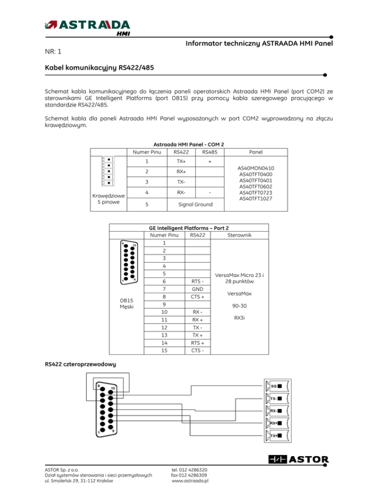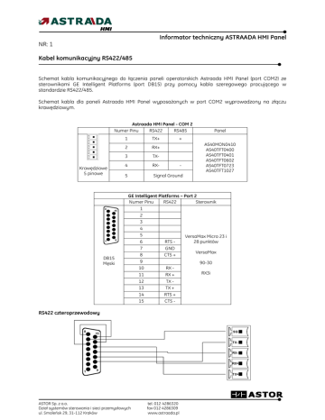 Informator techniczny ASTRAADA HMI Panel NR: 1 Kabel komunikacyjny RS422/485 Schemat kabla komunikacyjnego do łączenia paneli operatorskich Astraada HMI Panel (port COM2) ze sterownikami GE Intelligent Platforms (port DB15) przy pomocy kabla szeregowego pracującego w standardzie RS422/485. Schemat kabla dla paneli Astraada HMI Panel wyposażonych w port COM2 wyprowadzony na złączu krawędziowym. Astraada HMI Panel - COM 2 Numer Pinu RS422 RS485 Krawędziowe 5 pinowe DB15 Męski 1 TX+ 2 RX+ 3 TX- 4 RX- 5 Signal Ground Panel + - AS40MON0410 AS40TFT0400 AS40TFT0401 AS40TFT0602 AS40TFT0723 AS40TFT1027 GE Intelligent Platforms – Port 2 Numer Pinu RS422 Sterownik 1 2 3 4 5 VersaMax Micro 23 i 28 punktów 6 RTS 7 GND VersaMax 8 CTS + 9 90-30 10 RX RX3i 11 RX + 12 TX 13 TX + 14 RTS + 15 CTS - RS422 czteroprzewodowy ASTOR Sp. z o.o. Dział systemów sterowania i sieci przemysłowych ul. Smoleńsk 29, 31-112 Kraków tel. 012 4286320 fax 012 4286309 www.astraada.pl Informator techniczny ASTRAADA HMI Panel RS 485 dwuprzewodowy Schemat kabla dla paneli Astraada HMI Panel wyposażonych w port COM2 wyprowadzony na złączu DB9 męskim DB9 Męski Astraada HMI Panel - COM 2 Numer Pinu RS232 RS485 1 + 2 RXD 3 TXD 4 5 Signal Ground 6 7 RTS 8 CTS 9 5 V (opcja) DB15 Męski Panel AS40TFT0602 AS40TFT0723 AS40TFT1027 GE Intelligent Platforms – Port 2 Numer Pinu RS485 Sterownik 1 2 3 4 5 VersaMax Micro 23 i 28 punktów 6 RTS 7 GND VersaMax 8 CTS + 9 90-30 10 RX RX3i 11 RX + 12 TX 13 TX + 14 RTS + 15 CTS - ASTOR Sp. z o.o. Dział systemów sterowania i sieci przemysłowych ul. Smoleńsk 29, 31-112 Kraków tel. 012 4286320 fax 012 4286309 www.astraada.pl Informator techniczny ASTRAADA HMI Panel RS485 dwuprzewodowy ASTOR Sp. z o.o. Dział systemów sterowania i sieci przemysłowych ul. Smoleńsk 29, 31-112 Kraków tel. 012 4286320 fax 012 4286309 www.astraada.pl