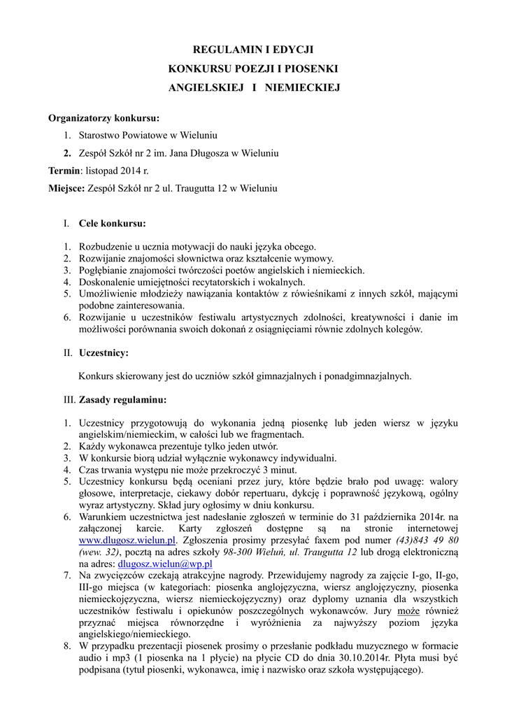 REGULAMIN I EDYCJI KONKURSU POEZJI I PIOSENKI ANGIELSKIEJ I NIEMIECKIEJ Organizatorzy konkursu: 1. Starostwo Powiatowe w Wieluniu 2. Zespół Szkół nr 2 im. Jana Długosza w Wieluniu Termin: listopad 2014 r. Miejsce: Zespół Szkół nr 2 ul. Traugutta 12 w Wieluniu I. Cele konkursu: Rozbudzenie u ucznia motywacji do nauki języka obcego. Rozwijanie znajomości słownictwa oraz kształcenie wymowy. Pogłębianie znajomości twórczości poetów angielskich i niemieckich. Doskonalenie umiejętności recytatorskich i wokalnych. Umożliwienie młodzieży nawiązania kontaktów z rówieśnikami z innych szkół, mającymi podobne zainteresowania. 6. Rozwijanie u uczestników festiwalu artystycznych zdolności, kreatywności i danie im możliwości porównania swoich dokonań z osiągnięciami równie zdolnych kolegów. 1. 2. 3. 4. 5. II. Uczestnicy: Konkurs skierowany jest do uczniów szkół gimnazjalnych i ponadgimnazjalnych. III. Zasady regulaminu: 1. Uczestnicy przygotowują do wykonania jedną piosenkę lub jeden wiersz w języku angielskim/niemieckim, w całości lub we fragmentach. 2. Każdy wykonawca prezentuje tylko jeden utwór. 3. W konkursie biorą udział wyłącznie wykonawcy indywidualni. 4. Czas trwania występu nie może przekroczyć 3 minut. 5. Uczestnicy konkursu będą oceniani przez jury, które będzie brało pod uwagę: walory głosowe, interpretacje, ciekawy dobór repertuaru, dykcję i poprawność językową, ogólny wyraz artystyczny. Skład jury ogłosimy w dniu konkursu. 6. Warunkiem uczestnictwa jest nadesłanie zgłoszeń w terminie do 31 października 2014r. na załączonej karcie. Karty zgłoszeń dostępne są na stronie internetowej www.dlugosz.wielun.pl. Zgłoszenia prosimy przesyłać faxem pod numer (43)843 49 80 (wew. 32), pocztą na adres szkoły 98-300 Wieluń, ul. Traugutta 12 lub drogą elektroniczną na adres: [email protected] 7. Na zwycięzców czekają atrakcyjne nagrody. Przewidujemy nagrody za zajęcie I-go, II-go, III-go miejsca (w kategoriach: piosenka anglojęzyczna, wiersz anglojęzyczny, piosenka niemieckojęzyczna, wiersz niemieckojęzyczny) oraz dyplomy uznania dla wszystkich uczestników festiwalu i opiekunów poszczególnych wykonawców. Jury może również przyznać miejsca równorzędne i wyróżnienia za najwyższy poziom języka angielskiego/niemieckiego. 8. W przypadku prezentacji piosenek prosimy o przesłanie podkładu muzycznego w formacie audio i mp3 (1 piosenka na 1 płycie) na płycie CD do dnia 30.10.2014r. Płyta musi być podpisana (tytuł piosenki, wykonawca, imię i nazwisko oraz szkoła występującego). 9. Występujący mogą wzbogacić swój występ o dodatkowe środki ekspresji, takie jak rekwizyty, elementy choreografii itp. Prosimy jednak o uprzedzenie organizatorów o swoich planach, aby przygotowania do prezentacji utworu nie zakłóciły sprawnej organizacji konkursu. 10. Zastrzegamy sobie prawo wykorzystania nagrań do celów promocyjnych konkursu i szkoły. 11. Zastrzegamy sobie również prawo do zarejestrowania konkursu kamerą video oraz aparatem fotograficznym i wykorzystania nagrań do promocji konkursu i szkoły. 12. Uczestnicy wraz z opiekunami na konkurs przyjeżdżają na koszt własny. 13. Szczegółowe informacje o konkursie uzyskać można telefonicznie: 503751504 lub 886977049. Można też napisać: [email protected] lub [email protected]. 14. Nadesłane materiały pozostają własnością szkoły. 15. Bardzo prosimy o przesłanie zgłoszeń konkursowych w wyznaczonym terminie i czytelne wypełnienie kart. Życzymy weny twórczej, zapału w doskonaleniu swojego warsztatu artystycznego i sukcesów podczas konkursu. Organizatorzy