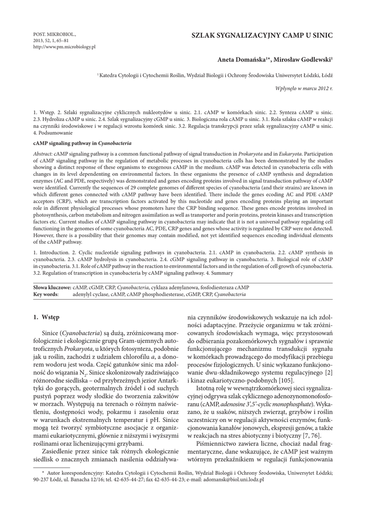 POST. MIKROBIOL., 2013, 52, 1, 65–81 http://www.pm.microbiology.pl SZLAK SYGNALIZACYJNY CAMP U SINIC Aneta Domańska1*, Mirosław Godlewski1 1 Katedra Cytologii i Cytochemii Roślin, Wydział Biologii i Ochrony Środowiska Uniwersytet Łódzki, Łódź Wpłynęło w marcu 2012 r. 1. Wstęp. 2. Szlaki sygnalizacyjne cyklicznych nukleotydów u sinic. 2.1. cAMP w komórkach sinic. 2.2. Synteza cAMP u sinic. 2.3. Hydroliza cAMP u sinic. 2.4. Szlak sygnalizacyjny cGMP u sinic. 3. Biologiczna rola cAMP u sinic. 3.1. Rola szlaku cAMP w reakcji na czynniki środowiskowe i w regulacji wzrostu komórek sinic. 3.2. Regulacja transkrypcji przez szlak sygnalizacyjny cAMP u sinic. 4. Podsumowanie cAMP signaling pathway in Cyanobacteria Abstract: cAMP signaling pathway is a common functional pathway of signal transduction in Prokaryota and in Eukaryota. Participation of cAMP signaling pathway in the regulation of metabolic processes in cyanobacteria cells has been demonstrated by the studies showing a distinct response of these organisms to exogenous cAMP in the medium. cAMP was detected in cyanobacteria cells with changes in its level dependenting on environmental factors. In these organisms the presence of cAMP synthesis and degradation enzymes (AC and PDE, respectively) was demonstrated and genes encoding proteins involved in signal transduction pathway of cAMP were identified. Currently the sequences of 29 complete genomes of different species of cyanobacteria (and their strains) are known in which different genes connected with cAMP pathway have been identified. There include the genes ecoding AC and PDE cAMP acceptors (CRP), which are transcription factors activated by this nucleotide and genes encoding proteins playing an important role in different physiological processes whose promoters have the CRP binding sequence. These genes encode proteins involved in photosynthesis, carbon metabolism and nitrogen assimilation as well as transporter and porin proteins, protein kinases and transcription factors etc. Current studies of cAMP signaling pathway in cyanobacteria may indicate that it is not a universal pathway regulating cell functioning in the genomes of some cyanobacteria AC, PDE, CRP genes and genes whose activity is regulated by CRP were not detected. However, there is a possibility that their genomes may contain modified, not yet identified sequences encoding individual elements of the cAMP pathway. 1. Introduction. 2. Cyclic nucleotide signaling pathways in cyanobacteria. 2.1. cAMP in cyanobacteria. 2.2. cAMP synthesis in cyanobacteria. 2.3. cAMP hydrolysis in cyanobacteria. 2.4. cGMP signaling pathway in cyanobacteria. 3. Biological role of cAMP in cyanobacteria. 3.1. Role of cAMP pathway in the reaction to environmental factors and in the regulation of cell growth of cyanobacteria. 3.2. Regulation of transcription in cyanobacteria by cAMP signaling pathway. 4. Summary Słowa kluczowe: cAMP, cGMP, CRP, Cyanobacteria, cyklaza adenylanowa, fosfodiesteraza cAMP Key words: adenylyl cyclase, cAMP, cAMP phosphodiesterase, cGMP, CRP, Cyanobacteria 1. Wstęp Sinice (Cyanobacteria) są dużą, zróżnicowaną morfologicznie i ekologicznie grupą Gram-ujemnych autotroficznych Prokaryota, u których fotosynteza, podobnie jak u roślin, zachodzi z udziałem chlorofilu a, a donorem wodoru jest woda. Część gatunków sinic ma zdolność do wiązania N2. Sinice skolonizowały zadziwiająco różnorodne siedliska – od przybrzeżnych jezior Antarktyki do gorących, geotermalnych źródeł i od suchych pustyń poprzez wody słodkie do tworzenia zakwitów w morzach. Występują na terenach o różnym naświetleniu, dostępności wody, pokarmu i zasoleniu oraz w warunkach ekstremalnych temperatur i pH. Sinice mogą też tworzyć symbiotyczne asocjacje z organizmami eukariotycznymi, głównie z niższymi i wyższymi roślinami oraz lichenizującymi grzybami. Zasiedlenie przez sinice tak różnych ekologicznie siedlisk o znacznych zmianach nasilenia oddziaływa- nia czynników środowiskowych wskazuje na ich zdolności adaptacyjne. Przeżycie organizmu w tak zróżnicowanych środowiskach wymaga, więc przystosowań do odbierania pozakomórkowych sygnałów i sprawnie funkcjonującego mechanizmu transdukcji sygnału w komórkach prowadzącego do modyfikacji przebiegu procesów fizjologicznych. U sinic wykazano funkcjonowanie dwu-składnikowego systemu regulacyjnego [2] i kinaz eukariotyczno-podobnych [105]. Istotną rolę w wewnątrzkomórkowej sieci sygnalizacyjnej odgrywa szlak cyklicznego adenozynomonofosforanu (cAMP, adenosine 3’,5’-cyclic monophosphate). Wykazano, że u ssaków, niższych zwierząt, grzybów i roślin uczestniczy on w regulacji aktywności enzymów, funkcjonowania kanałów jonowych, ekspresji genów, a także w reakcjach na stres abiotyczny i biotyczny [7, 76]. Piśmiennictwo zawiera liczne, chociaż nadal fragmentaryczne, dane wskazujące, że cAMP jest ważnym wtórnym przekaźnikiem w regulacji funkcjonowania * Autor korespondencyjny: Katedra Cytologii i Cytochemii Roślin, Wydział Biologii i Ochrony Środowiska, Uniwersytet Łódzki; 90-237 Łódź, ul. Banacha 12/16; tel. 42-635-44-27; fax 42-635-44-23; e-mail: [email protected] 66 ANETA DOMAŃSKA, MIROSŁAW GODLEWSKI komórek sinic. Wykazano bowiem wyraźną reakcję tych organizmów na egzogenny cAMP, w komórkach sinic wykryto cAMP, a także obserwowano zmiany jego poziomu zależne od czynników środowiskowych. U sinic wykazano też obecność cyklaz adenylanowych (ACs, adenylyl cyclases) oraz fosfodiesteraz cAMP (PDEs, cAMP phosphodiesterases), które są, odpowiednio, enzymami syntezy i hydrolizy cAMP. Następnie zidentyfikowano w genomach sinic geny kodujące białka zaangażowane w szlak transdukcji sygnału cAMP. Obecność i rola tych genów zastała potwierdzona w badaniach prowadzonych na mutantach sinic, a także na podstawie komplementacji po transdukcji genów sinic do defektywnych mutantów E. coli. Obecni