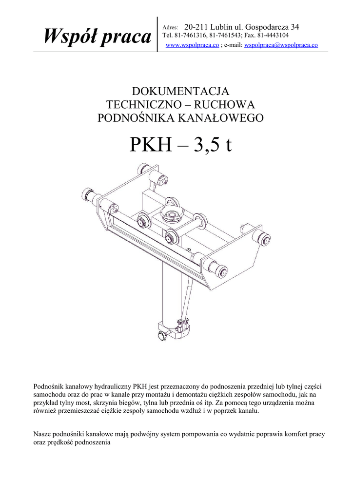 Współ praca Adres: 20-211 Lublin ul. Gospodarcza 34 Tel. 81-7461316, 81-7461543; Fax. 81-4443104 www.wspolpraca.co ; e-mail: [email protected] DOKUMENTACJA TECHNICZNO – RUCHOWA PODNOŚNIKA KANAŁOWEGO PKH – 3,5 t Podnośnik kanałowy hydrauliczny PKH jest przeznaczony do podnoszenia przedniej lub tylnej części samochodu oraz do prac w kanale przy montażu i demontażu ciężkich zespołów samochodu, jak na przykład tylny most, skrzynia biegów, tylna lub przednia oś itp. Za pomocą tego urządzenia można również przemieszczać ciężkie zespoły samochodu wzdłuż i w poprzek kanału. Nasze podnośniki kanałowe mają podwójny system pompowania co wydatnie poprawia komfort pracy oraz prędkość podnoszenia Współpraca Adres: 20-211 Lublin ul. Gospodarcza 34 Tel. 81-7461316, 81-7461543; Fax. 81-4443104 www.wspolpraca.co ; e-mail: [email protected] PRZEZNACZENIE Podnośnik hydrauliczny kanałowy PKH-3,5T przeznaczony jest do podnoszenia przedniej lub tylnej części samochodu, oraz do prac w kanale przy montażu i demontażu ciężkich zespołów samochodu, jak np. tylny most, skrzynka biegów, przednia oś itp. Za pomocą podnośnika można również transportować ciężkie zespoły samochodu wzdłuż i w poprzek kanału. Podnośnik składa się z trzech zespołów : 1- wózka podłużnego, przesuwanego na czterech kółkach wzdłuż kanału – 1 szt. 2- wózka poprzecznego przesuwanego na czterech kółkach po wózku podłużnym – 1 szt. 3- siłownika hydraulicznego o napędzie ręcznym – 1 szt. UWAGA!!! Wózek główny jest wykonywany do szerokości kanału i wg uzgodnień z odbiorcą. Współpraca Adres: 20-211 Lublin ul. Gospodarcza 34 Tel. 81-7461316, 81-7461543; Fax. 81-4443104 www.wspolpraca.co ; e-mail: [email protected] DANE TECHNICZNE - Max udźwig. - 3,5 T - Max skok tłoczyska – 600 mm - Objętość zbiornika oleju – 2 dcm 3 - Olej – HPP-32 WARUNKI PRACY. Podnośnik przeznaczony jest do pracy w kanałach posiadających zabetonowane na krawędziach szyny, wykonane z kątowników stalowych o wymiarach minimalnych 50x50 mm lub inne trwałe stalowe prowadzenia na obrzeżach kanału. Rozstawienie szyn „A” i wymiar „B” na całej długości kanału powinno być wykonane z dokładnością ± 2 mm.