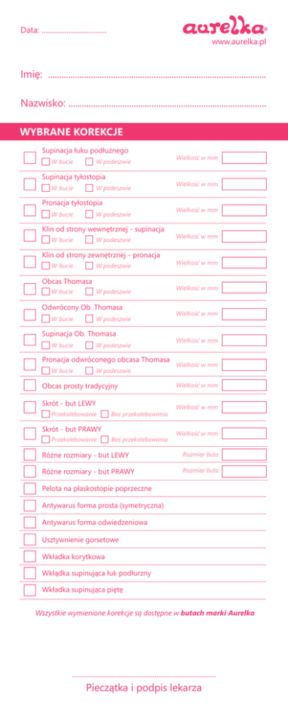Data: .................................... www.aurelka.pl Imię: ................................................................................................. Nazwisko: ........................................................................................ WYBRANE KOREKCJE Supinacja łuku podłużnego W bucie W podeszwie Supinacja tyłostopia W bucie W podeszwie Pronacja tyłostopia W bucie W podeszwie Klin od strony wewnętrznej - supinacja W bucie W podeszwie Klin od strony zewnętrznej - pronacja W bucie W podeszwie Obcas Thomasa W bucie W podeszwie Odwrócony Ob. Thomasa W bucie W podeszwie Supinacja Ob. Thomasa W bucie W podeszwie Pronacja odwróconego obcasa Thomasa W bucie W podeszwie Obcas prosty tradycyjny Skrót - but LEWY Przekolebowanie Bez przekolebowania Skrót - but PRAWY Przekolebowanie Bez przekolebowania Wielkość w mm Wielkość w mm Wielkość w mm Wielkość w mm Wielkość w mm Wielkość w mm Wielkość w mm Wielkość w mm Wielkość w mm Wielkość w mm Wielkość w mm Wielkość w mm Różne rozmiary - but LEWY Rozmiar buta Różne rozmiary - but PRAWY Rozmiar buta Pelota na płaskostopie poprzeczne Antywarus forma prosta (symetryczna) Antywarus forma odwiedzeniowa Usztywnienie gorsetowe Wkładka korytkowa Wkłądka supinująca łuk podłurzny Wkładka supinująca piętę Wszystkie wymienione korekcje są dostępne w butach marki Aurelka ................................................................................ Pieczątka i podpis lekarza UWAGI: .............................................................................................................. .............................................................................................................. .............................................................................................................. .............................................................................................................. .............................................................................................................. .............................................................................................................. .............................................................................................................. Dane sklepu z obuwiem marki Aurelka