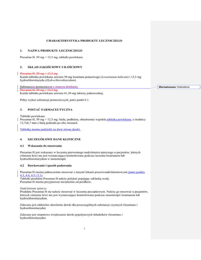 CHARAKTERYSTYKA PRODUKTU LECZNICZEGO 1. NAZWA PRODUKTU LECZNICZEGO Presartan H, 50 mg + 12,5 mg, tabletki powlekane 2. SKŁAD JAKOŚCIOWY I ILOŚCIOWY Presartan H, 50 mg + 12,5 mg Każda tabletka powlekana zawiera 50 mg losartanu potasowego (Losartanum kalicum) i 12,5 mg hydrochlorotiazydu (Hydrochlorothiazidum). Substancjae pomocniczae o znanym działaniu: Presartan H, 50 mg + 12,5 mg Każda tabletka powlekana zawiera 61,50 mg laktozy jednowodnej. Pełny wykaz substancji pomocniczych, patrz punkt 6.1. 3. POSTAĆ FARMACEUTYCZNA Tabletki powlekane. Presartan H, 50 mg + 12,5 mg: biała, podłużna, obustronnie wypukła tabletka powlekana, o średnicy 13,7x6,7 mm z linią podziału po obu stronach. Tabletkę można podzielić na dwie równe dawki. 4. SZCZEGÓŁOWE DANE KLINICZNE 4.1 Wskazania do stosowania Presartan H jest wskazany w leczeniu pierwotnego nadciśnienia tętniczego u pacjentów, których ciśnienie krwi nie jest wystarczająco kontrolowane podczas leczenia losartanem lub hydrochlorotiazydem w monoterapii. 4.2 Dawkowanie i sposób podawania Presartan H można jednocześnie stosować z innymi lekami przeciwnadciśnieniowymi (patrz punkty 4.3, 4.4, 4.5 i 5.1). Tabletki produktu Presartan H należy połykać popijając szklanką wody. Presartan H można przyjmować niezależnie od posiłków. Nadciśnienie tętnicze Produktu Presartan H nie należy stosować w leczeniu początkowym. Należy go stosować u pacjentów, których ciśnienie krwi nie jest wystarczająco kontrolowane podczas monoterapii losartanem lub hydrochlorotiazydem. Zalecane jest oddzielne określenie dawki dla poszczególnych substancji czynnych (losartanu i hydrochlorotiazydu). Zalecane jest stopniowe zwiększanie dawki pojedynczych składników (losartanu i hydrochlorotiazydu). 1 Sformatowano: Podkreślenie Jeżeli jest to klinicznie uzasadnione, można rozważyć bezpośrednią zmianę monoterapii na leczenie dawką złożoną u pacjentów, u których ciśnienie nie jest odpowiednio kontrolowane. Zazwyczaj stosowana dawka podtrzymująca wynosi jedną tabletkę produktu Presartan H o mocy 50 mg + 12,5 mg raz na dobę. U pacjentów, u których nie uzyska się odpowiedniej reakcji na produkt Presartan H o mocy 50 mg + 12,5 mg dawkę można zwiększyć i podawać jedną tabletkę produktu Presartan H o mocy 100 mg + 25 mg raz na dobę. Maksymalna dawka wynosi: jedna tabletka produktu Presartan H o mocy 100 mg + 25 mg raz na dobę. Ogólnie, działanie przeciwnadciśnieniowe występuje po trzech, czterech tygodniach od rozpoczęcia leczenia. Stosowanie u pacjentów z zaburzeniami czynności nerek i hemodializowanych Nie ma konieczności dostosowania dawki początkowej u pacjentów z umiarkowanymi zaburzeniami czynności nerek (tj. klirens kreatyniny 30-50 ml/min). Nie zaleca się stosowania produktu Presartan H u pacjentów hemodializowanych. Nie wolno stosować produktu Presartan H u pacjentów z ciężką niewydolnością nerek (tj. klirens kreatyniny <30 ml/min) (patrz punkt 4.3). Stosowanie u pacjentów ze zmniejszoną objętością wewnątrznaczyniową Należy wyrównać niedobór płynów i (lub) sodu przed rozpoczęciem podawania produktu Presartan H. Stosowanie u pacjentów z zaburzeniami czynności wątroby Stosowanie produktu Presartan H jest przeciwwskazane u pacjentów z ciężkimi zaburzeniami czynności wątroby (patrz punkt 4.3). Stosowanie u osób w podeszłym wieku Zazwyczaj nie ma konieczności dostosowywania dawki u pacjentów w podeszłym wieku. Stosowanie u dzieci i młodzieży (< 18 lat) Brak doświadczenia w stosowaniu produktu u dzieci i młodzieży. Dlatego produktu Presartan H nie należy podawać dzieciom i młodzieży. 4.3 Przeciwwskazania nadwrażliwość na losartan, pochodne sulfonamidów (takie jak hydrochlorotiazyd) luboraz na którąkolwiek z substancjęi pomocniczą wymienioną w punkcie 6.1ych produktu hipokaliemia lub hiperkalcemia oporna na leczenie ciężkie zaburzenia czynności wątroby; cholestaza i zastój żółci hiponatremia oporna na leczenie hiperurykemia objawowa/dna drugi i trzeci trymestr ciąży (patrz punkt 4.4 i 4.6) karmienie piersią (patrz punkt 4.6) ciężkie zaburzenia czynności nerek (tj. klirens kreatyniny <30 ml/min) bezmocz jednoczesne stosowanie produktu leczniczego Presartan H z produktami zawierającymi aliskiren jest przeciwwskazane u pacjentów z cukrzycą lub zaburzeniem czynności nerek (współczynnik fprzesączania iltracji kłębuszkowegoj, GFR<60 ml/min/1,73 m2) (patrz punkty 4.5 i 5.1). 4.4 Specjalne ostrzeżenia i środki ostrożności dotyczące stosowania Losartan Obrzęk naczynioruchowy Pacjenci z obrzękiem naczynioruchowym w wywiadzie (obrzęk twarzy, warg, gardła i (lub) języka) powinni pozostawać pod ścisłą obserwacją (patrz punkt 4.8). 2 Niedociśnienie i zmniejszona objętość wewnątrznaczyniowa Niedociśnienie objawowe, szczególnie po podaniu pierwszej dawki, może wystąpić u pacjentów ze zmniejszoną objętością wewnątrznaczyniową i (lub) z niedoborem sodu na skutek intensywnego leczenia moczopędnego, diety z ograniczeniem soli, biegunki lub wymiotów. Takie niedobory należy wyrównać przed rozpoczęciem leczenia produktem Presartan H (patrz punkty 4.2 i 4.3). Zaburzenia równowagi elektrolitowej Zaburzenia elektrolitowe występują często u osób z zaburzeniami czynności nerek, z cukrzycą lub bez cukrzycy i należy je wyrównać. Dlatego należy ściśle monitorować stężenie potasu w osoczu oraz wartości klirensu kreatyniny; szczególnie dotyczy to pacjentów z niewydolnością serca i klirensem kreatyniny pomiędzy 30 – 50 ml/min. Nie zaleca się jednoczesnego przyjmowania produktu Presartan H z lekami moczopędnymi oszczędzającymi potas, suplementami potasu i substytutami soli zawierającymi potas (patrz punkt 4.5). Zaburzenia czynności wątroby U pacjentów z łagodnymi do umiarkowanych zaburzeniami czynności wątroby w wywiadzie, produkt Presartan H należy stosować ostrożnie, ponieważ d