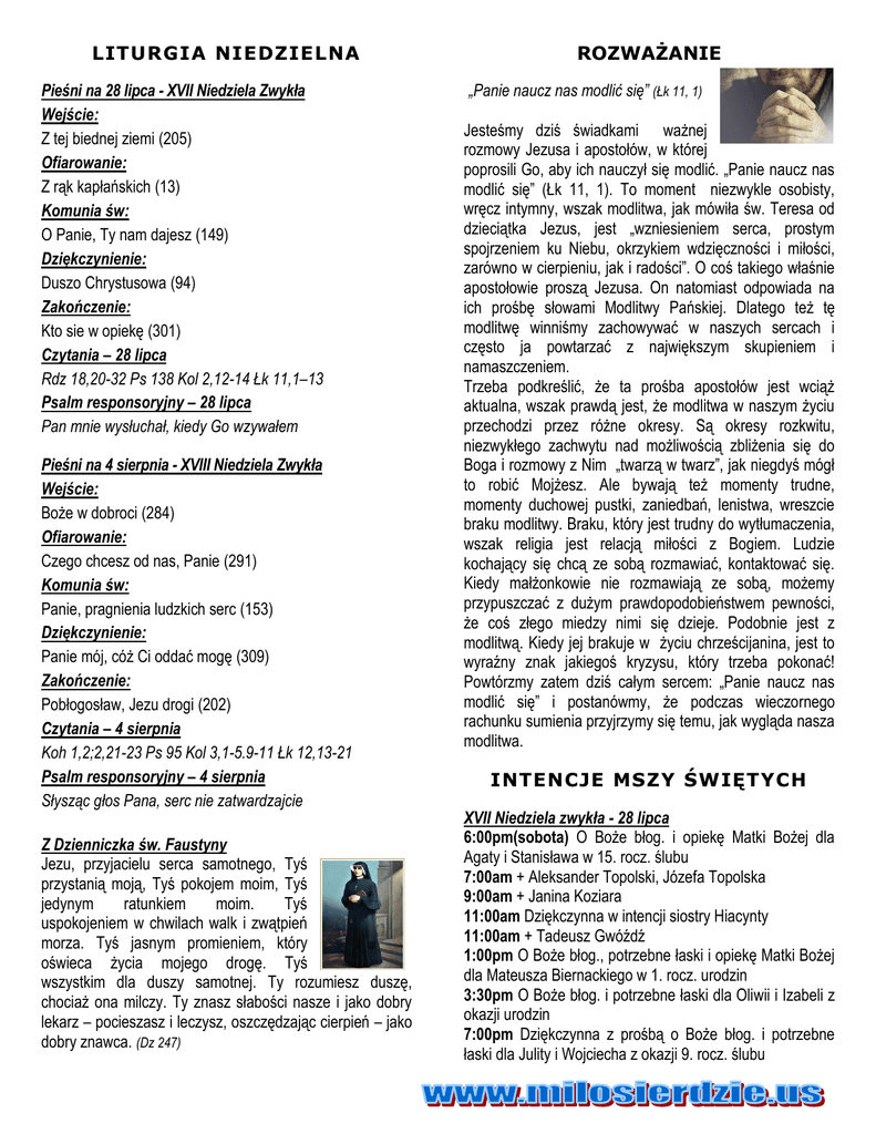 LITURGIA NIEDZIELNA Pieśni na 28 lipca - XVII Niedziela Zwykła Wejście: Z tej biednej ziemi (205) Ofiarowanie: Z rąk kapłańskich (13) Komunia św: O Panie, Ty nam dajesz (149) Dziękczynienie: Duszo Chrystusowa (94) Zakończenie: Kto sie w opiekę (301) Czytania – 28 lipca Rdz 18,20-32 Ps 138 Kol 2,12-14 Łk 11,1–13 Psalm responsoryjny – 28 lipca Pan mnie wysłuchał, kiedy Go wzywałem Pieśni na 4 sierpnia - XVIII Niedziela Zwykła Wejście: Boże w dobroci (284) Ofiarowanie: Czego chcesz od nas, Panie (291) Komunia św: Panie, pragnienia ludzkich serc (153) Dziękczynienie: Panie mój, cóż Ci oddać mogę (309) Zakończenie: Pobłogosław, Jezu drogi (202) Czytania – 4 sierpnia Koh 1,2;2,21-23 Ps 95 Kol 3,1-5.9-11 Łk 12,13-21 Psalm responsoryjny – 4 sierpnia Słysząc głos Pana, serc nie zatwardzajcie Z Dzienniczka św. Faustyny Jezu, przyjacielu serca samotnego, Tyś przystanią moją, Tyś pokojem moim, Tyś jedynym ratunkiem moim. Tyś uspokojeniem w chwilach walk i zwątpień morza. Tyś jasnym promieniem, który oświeca życia mojego drogę. Tyś wszystkim dla duszy samotnej. Ty rozumiesz duszę, chociaż ona milczy. Ty znasz słabości nasze i jako dobry lekarz – pocieszasz i leczysz, oszczędzając cierpień – jako dobry znawca. (Dz 247) ROZWAŻANIE „Panie naucz nas modlić się” (Łk 11, 1) Jesteśmy dziś świadkami ważnej rozmowy Jezusa i apostołów, w której poprosili Go, aby ich nauczył się modlić. „Panie naucz nas modlić się” (Łk 11, 1). To moment niezwykle osobisty, wręcz intymny, wszak modlitwa, jak mówiła św. Teresa od dzieciątka Jezus, jest „wzniesieniem serca, prostym spojrzeniem ku Niebu, okrzykiem wdzięczności i miłości, zarówno w cierpieniu, jak i radości”. O coś takiego właśnie apostołowie proszą Jezusa. On natomiast odpowiada na ich prośbę słowami Modlitwy Pańskiej. Dlatego też tę modlitwę winniśmy zachowywać w naszych sercach i często ja powtarzać z największym skupieniem i namaszczeniem. Trzeba podkreślić, że ta prośba apostołów jest wciąż aktualna, wszak prawdą jest, że modlitwa w naszym życiu przechodzi przez różne okresy. Są okresy rozkwitu, niezwykłego zachwytu nad możliwością zbliżenia się do Boga i rozmowy z Nim „twarzą w twarz”, jak niegdyś mógł to robić Mojżesz. Ale bywają też momenty trudne, momenty duchowej pustki, zaniedbań, lenistwa, wreszcie braku modlitwy. Braku, który jest trudny do wytłumaczenia, wszak religia jest relacją miłości z Bogiem. Ludzie kochający się chcą ze sobą rozmawiać, kontaktować się. Kiedy małżonkowie nie rozmawiają ze sobą, możemy przypuszczać z dużym prawdopodobieństwem pewności, że coś złego miedzy nimi się dzieje. Podobnie jest z modlitwą. Kiedy jej brakuje w życiu chrześcijanina, jest to wyraźny znak jakiegoś kryzysu, który trzeba pokonać! Powtórzmy zatem dziś całym sercem: „Panie naucz nas modlić się” i postanówmy, że podczas wieczornego rachunku sumienia przyjrzymy się temu, jak wygląda nasza modlitwa. INTENCJE MSZY ŚWIĘTYCH XVII Niedziela zwykła - 28 lipca 6:00pm(sobota) O Boże błog. i opiekę Matki Bożej dla Agaty i Stanisława w 15. rocz. ślubu 7:00am + Aleksander Topolski, Józefa Topolska 9:00am + Janina Koziara 11:00am Dziękczynna w intencji siostry Hiacynty 11:00am + Tadeusz Gwóźdź 1:00pm O Boże błog., potrzebne łaski i opiekę Matki Bożej dla Mateusza Biernackiego w 1. rocz. urodzin 3:30pm O Boże błog. i potrzebne łaski dla Oliwii i Izabeli z okazji urodzin 7:00pm Dziękczynna z prośbą o Boże błog. i potrzebne łaski dla Julity i Wojciecha z okazji 9. rocz. ślubu Poniedziałek - 29 lipca, św. Marty 8:00am + Edward Dudek 7:00pm + Iwona Ulicka Wtorek - 30 lipca 8:00am O zdrowie dla Anny i Boże błog. dla rodziny Bukowskich 7:00pm O Boże błog. i opiekę Matki Bożej dla Leo Leksowskiego z okazji urodzin Środa - 31 lipca, św. Ignacego z Loyoli 8:00am O znalezienie pracy przez wstawiennictwo Matki Bożej dla Ryszarda 7:00pm + Czesław Świderski oraz zmarli z rodzin Wilińskich i Świderskich Czwartek - 1 sierpnia, św. Alfonsa Marii Liguoriego 8:00am + Bronisława i Tomasz Mrowiec oraz zmarli z rodziny Mrowiec 7:00pm O Boże błogosławieństwo, dary Ducha Świętego i uzdrowienie dla Stanisława Piątek - 2 sierpnia 8:00am + Kazimierz Adamczyk w 3. rocz. śmierci 7:00pm O Boże błog. i uzdrowienie dla Grzegorza Sobota - 3 sierpnia 8:00am W intencji Parafian i Dobrodziejów 9:30am W int. Angeliki XVIII Niedziela zwykła - 4 sierpnia 6:00pm(sobota) Wynagradzająca NSPJ i Niepokalanemu Sercu Maryi za grzechy nasze i całego świata 7:00am + Zofia Miernik w 28. rocz. śmierci 9:00am + Jan i Anna Szczygieł oraz zmarli z rodziny 11:00am + Zofia Mołdoch w rocz. śmierci 1:00pm Dziękczynna z prośbą o Boże błog. dla Haliny i Jana Janowskich z okazji 40. rocznicy ślubu 3:30pm + Stanisław Giba w 4. rocz. śmierci 7:00pm Dziękczynna za posługę ks. Adama w Misji B.M. 7:00pm O Boże błogosławieństwo i potrzebne łaski dla Krystyny i Michała Komorowskich Poniedziałek - 5 sierpnia 8:00am + Julia 7:00pm + Anna Lasak Wtorek - 6 sierpnia, Święto Przemienienia Pańskiego 8:00am + Zofia i Władysław Kluk 7:00pm + Zofia Kuś w 3. rocz. śmierci Środa - 7 sierpnia 8:00am + Jadwiga Lewandowska 7:00pm + Zofia Gawron w 2. rocz. śmierci Czwartek - 8 sierpnia 8:00am Dziękczynno-błagalna dla Andrzeja Sowińskiego 7:00pm Dziękczynna za otrzymane łaski z prośbą o Boże błog. dla Adama i Ewy w 26. rocz. ślubu Piątek - 9 sierpnia, św. Teresy Benedykty od Krzyża 8:00am + Mariusz Mańko w 1. rocz. ślubu 7:00pm O Boże błog. i zdrowie dla Łukasza Ciepiela Sobota - 10 sierpnia, św. Wawrzyńca 8:00am O uzdrowienie w małżeństwie Piotra i Magdaleny 9:30am + Steve Wilk, Edward Pocus XIX Niedziela zwykła - 11 sierpnia 6:00pm(sobota) Dziękczynna z prośbą o dalsze Boże błog. dla Bogumiły i Romana Janowskich z okazji 45. rocz. ślubu 