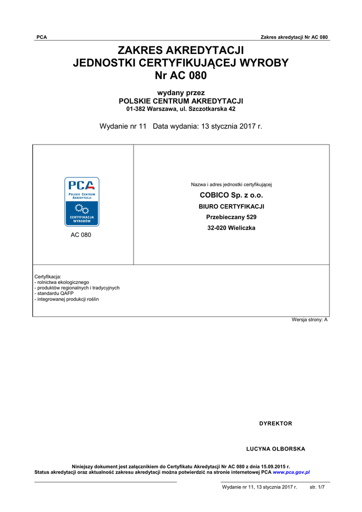PCA Zakres akredytacji Nr AC 080 ZAKRES AKREDYTACJI JEDNOSTKI CERTYFIKUJĄCEJ WYROBY Nr AC 080 wydany przez POLSKIE CENTRUM AKREDYTACJI 01-382 Warszawa, ul. Szczotkarska 42 Wydanie nr 11 Data wydania: 13 stycznia 2017 r. Nazwa i adres jednostki certyfikującej COBICO Sp. z o.o. BIURO CERTYFIKACJI Przebieczany 529 32-020 Wieliczka AC 080 Certyfikacja: - rolnictwa ekologicznego - produktów regionalnych i tradycyjnych - standardu QAFP - integrowanej produkcji roślin Wersja strony: A DYREKTOR LUCYNA OLBORSKA Niniejszy dokument jest załącznikiem do Certyfikatu Akredytacji Nr AC 080 z dnia 15.09.2015 r. Status akredytacji oraz aktualność zakresu akredytacji można potwierdzić na stronie internetowej PCA www.pca.gov.pl Wydanie nr 11, 13 stycznia 2017 r. str. 1/7 PCA Zakres akredytacji Nr AC 080 Rodzaj działalności: Dokument odniesienia: CERTYFIKACJA SYSTEMU QAFP System Gwarantowanej Jakości Żywności QAFP (wydanie 4) Grupy działalności Zeszyty branżowe QAFP Wędliny Wędliny. Wymagania Produkcyjne i Jakościowe. (wyd. 4 z dnia 18.03.2016 r.) Kulinarne mięso wieprzowe Kulinarne Mięso Wieprzowe. Wymagania Produkcyjne i Jakościowe (wyd. 4 z dnia 24.12.2013 r.) Kulinarne mięso z piersi kurczaka Tuszki, elementy i mięso z kurczaka, indyka i młodej polskiej gęsi owsianej (wyd. 4 z dnia 24.12.2013 r.) Tuszki i elementy z kurczaka Kulinarne mięso z piersi indyka Tuszki i elementy z indyka Tuszki i elementy młodej polskiej gęsi owsianej Wersja strony: A Wydanie nr 11, 13 stycznia 2017 r. str. 2/7 PCA Zakres akredytacji Nr AC 080 Rodzaj działalności: CERTYFIKACJA ROLNICTWA EKOLOGICZNEGO Dokument odniesienia: Rozporządzenie Rady (WE) nr 834/2007 z dnia 28 czerwca 2007 r. w sprawie produkcji ekologicznej i znakowania produktów ekologicznych i uchylające rozporządzenie (EWG) nr 2092/91 (Dz. Urz. L 189 z 20.07.2007 r. z późn. zm.) Grupy produktów/ działalność Ekologiczna uprawa roślin i utrzymanie zwierząt Zbiór ze stanu naturalnego Pszczelarstwo Produkty przetworzone: - przetwórstwo produktów ekologicznych oraz produkcja pasz i drożdży Wprowadzanie na rynek produktów ekologicznych, w tym importowanych z państw trzecich Wersja strony: A Wydanie nr 11, 13 stycznia 2017 r. str. 3/7 PCA Zakres akredytacji Nr AC 080 Rodzaj działalności: CERTYFIKACJA PRODUKTÓW REGIONALNYCH I TRADYCYJNYCH Dokumenty odniesienia: Rozporządzenie Parlamentu Europejskiego i Rady (UE) nr 1151/2012 z dnia 21 listopada 2012r. w sprawie systemów jakości produktów rolnych i środków spożywczych (Dz. Urz. UE L 343 z 14.12.2012 r. z późn. zm.) Rodzaj produktu Chroniona nazwa pochodzenia (ChNP) Chronione oznaczenie geograficzne (ChOG) Mięso świeże (i podroby) Produkty wytworzone na bazie mięsa (podgotowanego, solonego, wędzonego itd.) Sery Inne produkty pochodzenia zwierzęcego (jaja, miód, różne produkty mleczne z wyjątkiem masła itp.) Oleje i tłuszcze (masło, margaryna, oleje itp.) Owoce, warzywa i zboża, świeże lub przetworzone Świeże ryby, małże i skorupiaki oraz produkty wytwarzane z nich Piwo Czekolada i produkty pochodne Chleb, ciasta, ciastka, wyroby cukiernicze, herbatniki i inne wyroby piekarnicze Napoje z ekstraktów roślinnych Makarony Sól Naturalne gumy i żywice Pasta musztardowa Siano Olejki eteryczne Korek Koszenila Kwiaty i rośliny ozdobne Bawełna Wełna Wiklina Len międlony Skóra Futro Pierze Inne produkty wymienione w załączniku nr I do Traktatu o funkcjonowaniu Unii Europejskiej (przyprawy itd.) Gwarantowana tradycyjna specjalność (GTS) Mięso świeże (i podroby) Produkty wytworzone na bazie mięsa (podgotowanego, solonego, wędzonego itd.) Sery Inne produkty pochodzenia zwierzęcego (jaja, miód, różne produkty mleczne z wyjątkiem masła itp.) Wersja strony: A Wydanie nr 11, 13 stycznia 2017 r. str. 4/7 PCA Zakres akredytacji Nr AC 080 Gwarantowana tradycyjna specjalność (GTS) Oleje i tłuszcze (masło, margaryna, oleje itp.) Owoce, warzywa i zboża, świeże lub przetworzone Świeże ryby, małże i skorupiaki oraz produkty wytwarzane z nich Dania gotowe Piwo Czekolada i produkty pochodne Chleb, ciasta, ciastka, wyroby cukiernicze, herbatniki i inne wyroby piekarnicze Napoje z ekstraktów roślinnych Makarony Sól Inne produkty wymienione w załączniku nr I do Traktatu o funkcjonowaniu Unii Europejskiej (przyprawy itd.) Wersja strony: A Wydanie nr 11, 13 stycznia 2017 r. str. 5/7 PCA Zakres akredytacji Nr AC 080 Rodzaj działalności: CERTYFIKACJA INTEGROWANEJ PRODUCKJI ROŚLIN Dokument odniesienia: Ustawa z dnia 8 marca 2013 r. o środkach ochrony roślin (Dz. U. 2013, poz. 455, Rozdział 6; z późn. zm.) Obszar Integrowana produkcja roślin Wersja strony: A Wydanie nr 11, 13 stycznia 2017 r. str. 6/7 PCA Zakres akredytacji Nr AC 080 Wykaz zmian Zakresu Akredytacji Nr AC 080 Status zmian: wersja pierwotna – A Zatwierdzam status zmian DYREKTOR HOLOGRAM HOLOGRAM HOLOGRAM HOLOGRAM LUCYNA OLBORSKA dnia: 13.01.2017 r. Wydanie nr 11, 13 stycznia 2017 r. str. 7/7