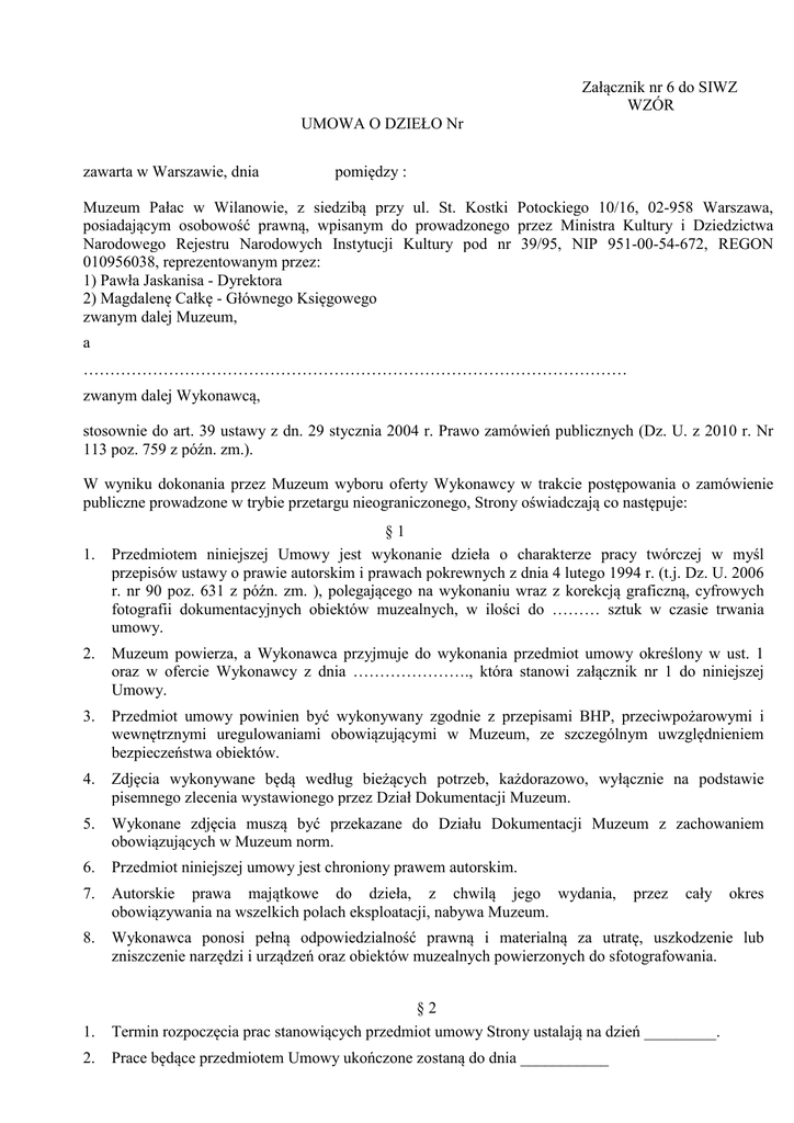 Załącznik nr 6 do SIWZ WZÓR UMOWA O DZIEŁO Nr zawarta w Warszawie, dnia pomiędzy : Muzeum Pałac w Wilanowie, z siedzibą przy ul. St. Kostki Potockiego 10/16, 02-958 Warszawa, posiadającym osobowość prawną, wpisanym do prowadzonego przez Ministra Kultury i Dziedzictwa Narodowego Rejestru Narodowych Instytucji Kultury pod nr 39/95, NIP 951-00-54-672, REGON 010956038, reprezentowanym przez: 1) Pawła Jaskanisa - Dyrektora 2) Magdalenę Całkę - Głównego Księgowego zwanym dalej Muzeum, a ………………………………………………………………………………………… zwanym dalej Wykonawcą, stosownie do art. 39 ustawy z dn. 29 stycznia 2004 r. Prawo zamówień publicznych (Dz. U. z 2010 r. Nr 113 poz. 759 z późn. zm.). W wyniku dokonania przez Muzeum wyboru oferty Wykonawcy w trakcie postępowania o zamówienie publiczne prowadzone w trybie przetargu nieograniczonego, Strony oświadczają co następuje: 1. §1 Przedmiotem niniejszej Umowy jest wykonanie dzieła o charakterze pracy twórczej w myśl przepisów ustawy o prawie autorskim i prawach pokrewnych z dnia 4 lutego 1994 r. (t.j. Dz. U. 2006 r. nr 90 poz. 631 z późn. zm. ), polegającego na wykonaniu wraz z korekcją graficzną, cyfrowych fotografii dokumentacyjnych obiektów muzealnych, w ilości do ……… sztuk w czasie trwania umowy. 2. Muzeum powierza, a Wykonawca przyjmuje do wykonania przedmiot umowy określony w ust. 1 oraz w ofercie Wykonawcy z dnia …………………., która stanowi załącznik nr 1 do niniejszej Umowy. 3. Przedmiot umowy powinien być wykonywany zgodnie z przepisami BHP, przeciwpożarowymi i wewnętrznymi uregulowaniami obowiązującymi w Muzeum, ze szczególnym uwzględnieniem bezpieczeństwa obiektów. 4. Zdjęcia wykonywane będą według bieżących potrzeb, każdorazowo, wyłącznie na podstawie pisemnego zlecenia wystawionego przez Dział Dokumentacji Muzeum. 5. Wykonane zdjęcia muszą być przekazane do Działu Dokumentacji Muzeum z zachowaniem obowiązujących w Muzeum norm. 6. Przedmiot niniejszej umowy jest chroniony prawem autorskim. 7. Autorskie prawa majątkowe do dzieła, z chwilą jego wydania, obowiązywania na wszelkich polach eksploatacji, nabywa Muzeum. 8. Wykonawca ponosi pełną odpowiedzialność prawną i materialną za utratę, uszkodzenie lub zniszczenie narzędzi i urządzeń oraz obiektów muzealnych powierzonych do sfotografowania. przez cały 1. §2 Termin rozpoczęcia prac stanowiących przedmiot umowy Strony ustalają na dzień _________. 2. Prace będące przedmiotem Umowy ukończone zostaną do dnia ___________ okres 1. §3 Za wykonanie Umowy Wykonawcy przysługuje wynagrodzenie w kwocie ______ zł (słownie: ______________-) brutto za wykonanie 1 szt. zdjęcia. 2. Łączna wartość zamówienia nie może przekroczyć kwoty __________ zł brutto (słownie: ___________________) przez cały okres obowiązywania umowy. 3. Ustala się termin zapłaty w 12 ratach kwartalnych w zależności od zaawansowania prac po uprzednim protokolarnym, bezusterkowym odbiorze części dzieła. Do podpisania protokołu ze strony Muzeum upoważniony jest kierownik Działu Dokumentacji Muzeum. 4. Wynagrodzenie nie podlega waloryzacji. 5. Należność, o której mowa w ust. 3 Muzeum wypłaci Wykonawcy przelewem na rachunek bankowy o numerze: ___________________________ prowadzony przez Bank _______________ w terminie 14 dni od dnia otrzymania rachunku wystawionego przez Wykonawcę. 6. Muzeum zastrzega sobie prawo do ograniczenia zakresu przedmiotu umowy, zarówno co do rodzaju jak i ilości ze względu na aktualne potrzeby lub posiadane środki finansowe, bez konsekwencji prawnych. 1. §4 Strony ustanawiają odpowiedzialność za niewykonanie lub nienależyte wykonanie umowy w formie kar umownych. 2. Wykonawca zapłaci Muzeum kary umowne: a) za zwłokę w wykonaniu przedmiotu umowy w wysokości 0,1% wynagrodzenia określonego w § 3 ust.2 za każdy dzień zwłoki b) z tytułu odstąpienia od umowy z przyczyn występujących po stronie Wykonawcy w wysokości 10% wynagrodzenia określonego w § 3 ust.2. 3. Muzeum zapłaci Wykonawcy karę umowną w przypadku odstąpienia od umowy z przyczyn niezależnych od Wykonawcy w wysokości 5% wynagrodzenia określonego w § 3 ust. 2. §5 1. Muzeum może odstąpić od umowy w razie wystąpienia istotnej zmiany okoliczności powodującej, że wykonanie umowy nie leży w interesie publicznym, czego nie można było przewidzieć w chwili jej zawarcia, zawiadamiając o tym Wykonawcę na piśmie w terminie 30 dni od powzięcia wiadomości o powyższych okolicznościach. 2. W przypadku określonym w ustępie poprzedzającym postanowienia o karze umownej z § 4 ust 3 nie mają zastosowania. 3. W przypadku określonym w ust. 1 Wykonawca może żądać jedynie wynagrodzenia należnego mu z tytułu wykonania części umowy. §6 Muzeum stworzy Wykonawcy warunki organizacyjne w zakresie niezbędnym do wykonania niniejszej umowy. 1. 2. §7 Zmiana postanowień umowy może nastąpić za zgodą obu Stron wyrażoną na piśmie pod rygorem nieważności takiej zmiany. Zakazuje się istotnych zmian postanowień zawartej umowy w stosunku do treści oferty, na podstawie której dokonano wyboru wykonawcy. §8 Właściwym dla rozpoznania sporów wynikłych na tle realizacji niniejszej umowy jest sąd właściwy dla siedziby Muzeum. §9 W sprawach nie uregulowanych w niniejszej Umowie stosuje się przepisy Kodeksu Cywilnego i ustawy z dnia 29 stycznia 2004 roku Prawo Zamówień Publicznych. § 10 Wszelkie załączniki stanowią integralną część niniejszej Umowy. § 11 Umowę sporządzono w trzech jednobrzmiących egzemplarzach, dwa egzemplarze dla Muzeum i jeden egzemplarz dla Wykonawcy. Muzeum Wykonawca