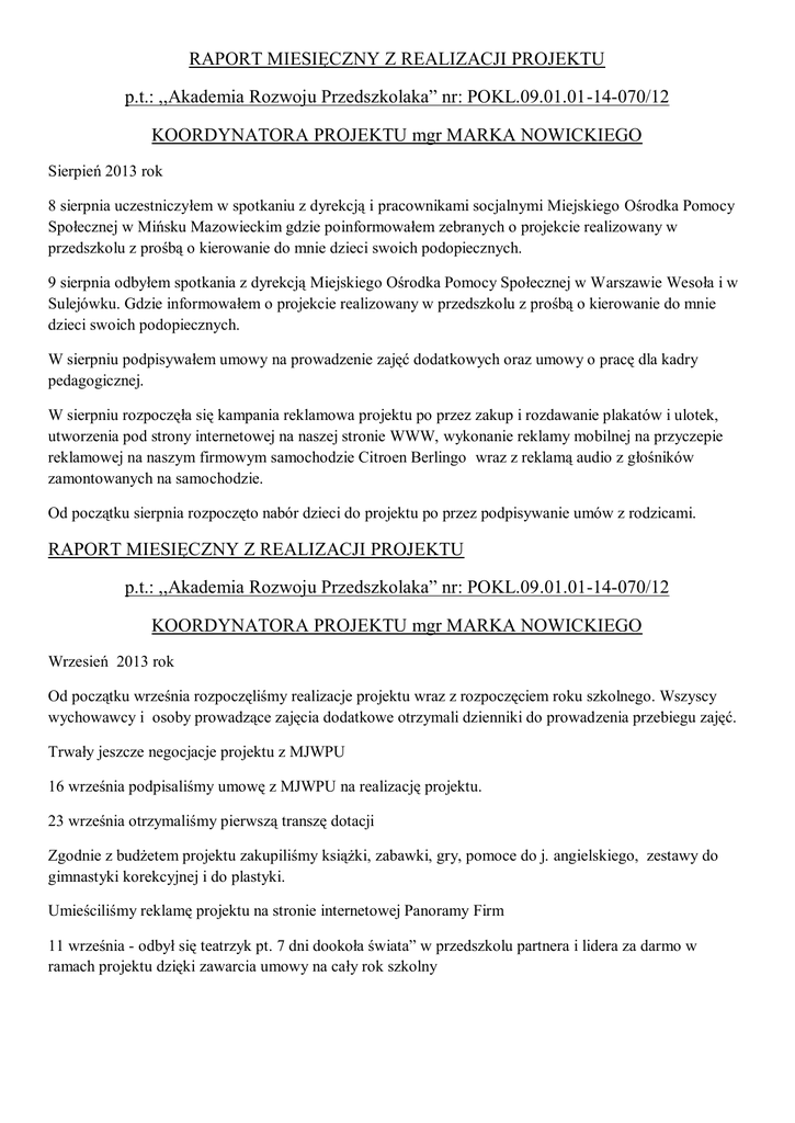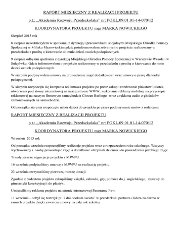 RAPORT MIESIĘCZNY Z REALIZACJI PROJEKTU p.t.: ,,Akademia Rozwoju Przedszkolaka” nr: POKL.09.01.01-14-070/12 KOORDYNATORA PROJEKTU mgr MARKA NOWICKIEGO Sierpień 2013 rok 8 sierpnia uczestniczyłem w spotkaniu z dyrekcją i pracownikami socjalnymi Miejskiego Ośrodka Pomocy Społecznej w Mińsku Mazowieckim gdzie poinformowałem zebranych o projekcie realizowany w przedszkolu z prośbą o kierowanie do mnie dzieci swoich podopiecznych. 9 sierpnia odbyłem spotkania z dyrekcją Miejskiego Ośrodka Pomocy Społecznej w Warszawie Wesoła i w Sulejówku. Gdzie informowałem o projekcie realizowany w przedszkolu z prośbą o kierowanie do mnie dzieci swoich podopiecznych. W sierpniu podpisywałem umowy na prowadzenie zajęć dodatkowych oraz umowy o pracę dla kadry pedagogicznej. W sierpniu rozpoczęła się kampania reklamowa projektu po przez zakup i rozdawanie plakatów i ulotek, utworzenia pod strony internetowej na naszej stronie WWW, wykonanie reklamy mobilnej na przyczepie reklamowej na naszym firmowym samochodzie Citroen Berlingo wraz z reklamą audio z głośników zamontowanych na samochodzie. Od początku sierpnia rozpoczęto nabór dzieci do projektu po przez podpisywanie umów z rodzicami. RAPORT MIESIĘCZNY Z REALIZACJI PROJEKTU p.t.: ,,Akademia Rozwoju Przedszkolaka” nr: POKL.09.01.01-14-070/12 KOORDYNATORA PROJEKTU mgr MARKA NOWICKIEGO Wrzesień 2013 rok Od początku września rozpoczęliśmy realizacje projektu wraz z rozpoczęciem roku szkolnego. Wszyscy wychowawcy i osoby prowadzące zajęcia dodatkowe otrzymali dzienniki do prowadzenia przebiegu zajęć. Trwały jeszcze negocjacje projektu z MJWPU 16 września podpisaliśmy umowę z MJWPU na realizację projektu. 23 września otrzymaliśmy pierwszą transzę dotacji Zgodnie z budżetem projektu zakupiliśmy książki, zabawki, gry, pomoce do j. angielskiego, zestawy do gimnastyki korekcyjnej i do plastyki. Umieściliśmy reklamę projektu na stronie internetowej Panoramy Firm 11 września - odbył się teatrzyk pt. 7 dni dookoła świata” w przedszkolu partnera i lidera za darmo w ramach projektu dzięki zawarcia umowy na cały rok szkolny RAPORT MIESIĘCZNY Z REALIZACJI PROJEKTU p.t.: ,,Akademia Rozwoju Przedszkolaka” nr: POKL.09.01.01-14-070/12 KOORDYNATORA PROJEKTU mgr MARKA NOWICKIEGO Październik 2013 rok Realizacja projektu przebiega według harmonogramu. Odbył się teatrzyk w przedszkolu lidera i partnera pt. Dwie Dorotki Wyjazd do muzeum przełożono na miesiąc listopad z powodu niemożliwości znalezienia transportu ponieważ wszystkie autokary dostępnych firm są zajęte Przed 14 października świętowaliśmy uroczyście DZIEŃ Edukacji uroczystą akademią. RAPORT MIESIĘCZNY Z REALIZACJI PROJEKTU p.t.: ,,Akademia Rozwoju Przedszkolaka” nr: POKL.09.01.01-14-070/12 KOORDYNATORA PROJEKTU mgr MARKA NOWICKIEGO Listopad 2013 rok Realizacja projektu przebiega według harmonogramu. Wyjazd do muzeum zbrojowni w Liwie wraz z lekcją muzealną – wyjazd przełożony z października 5 listopada odbyło się w przedszkolach uroczyste pasowanie na przedszkolaka z dyrekcja przedszkoli , przedstawieniem wykonanym przez dzieci i poczęstunkiem zorganizowanym przez właścicieli przedszkoli. 7 listopada gościliśmy teatrzyk w przedszkolu lidera i partnera pt. Kot w butach 29 listopada odbyły się w przedszkolach „Andrzejki” wraz z wróżbami i zabawami dla dzieci. RAPORT MIESIĘCZNY Z REALIZACJI PROJEKTU p.t.: ,,Akademia Rozwoju Przedszkolaka” nr: POKL.09.01.01-14-070/12 KOORDYNATORA PROJEKTU mgr MARKA NOWICKIEGO grudzień 2013 rok Realizacja projektu przebiega według harmonogramu. 5 grudnia - odbył się teatrzyk pt. Jaś i drzewo fasoli” w przedszkolu partnera i lidera za darmo w ramach projektu dzięki zawarcia umowy na cały rok szkolny 6 grudnia świętowaliśmy w przedszkolach Mikołajki wraz przybyciem do przedszkola Mikołaja, który rozdawał dzieciom prezenty. W grudniu dzieci były na wycieczce w muzeum kolejnictwa w Warszawie, gdzie miały zwiedzanie i lekcję muzealną. 24 grudnia dzieci ucztowały na wigilii w przedszkolach. RAPORT MIESIĘCZNY Z REALIZACJI PROJEKTU p.t.: ,,Akademia Rozwoju Przedszkolaka” nr: POKL.09.01.01-14-070/12 KOORDYNATORA PROJEKTU mgr MARKA NOWICKIEGO styczeń 2014 rok Realizacja projektu przebiega według harmonogramu. 27 stycznia - odbył się teatrzyk pt. Cztery mile za piec” w przedszkolu partnera i lidera za darmo w ramach projektu dzięki zawarcia umowy na cały rok szkolny W styczniu odbyły się w przedszkolach Święto Babci i Dziadka. Gościliśmy w przedszkolach Babcie i Dziadków na zaproszenie dzieci, które dały występy a dyrekcja i rodzice fundowali poczęstunek. RAPORT MIESIĘCZNY Z REALIZACJI PROJEKTU p.t.: ,,Akademia Rozwoju Przedszkolaka” nr: POKL.09.01.01-14-070/12 KOORDYNATORA PROJEKTU mgr MARKA NOWICKIEGO luty 2014 rok Realizacja projektu przebiega według harmonogramu. 12 lutego w przedszkolach lidera i partnera odbył się bal karnawałowy przebierańców z wodzirejem. 26 lutego odbyło się w przedszkolach lidera i partnera przedstawienie teatralne pt. „Calineczka” 27 lutego w przedszkolach lidera i partnera dzieci świętowały „Tłusty Czwartek” po przez objadanie się pączkami i faworkami przygotowanymi przez dyrekcję i panie kucharki oraz omawiano znaczenie święta. 28 lutego dzieci lidera i partnera wyjechały na wycieczkę do muzeum Wojska Polskiego na lekcję muzealną i zwiedzanie.