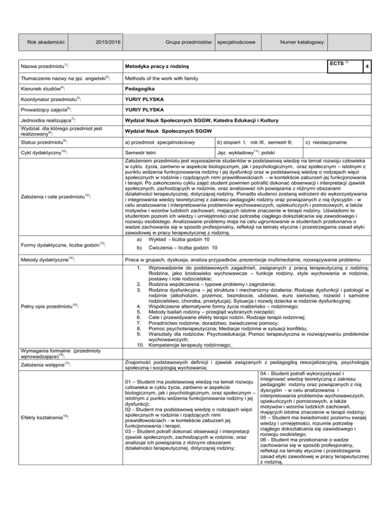 Rok akademicki: Grupa przedmiotów: specjalnościowe 2015/2016 Nazwa przedmiotu1): Metodyka pracy z rodziną Tłumaczenie nazwy na jęz. angielski3): Methods of the work with family 4) Kierunek studiów : Numer katalogowy: ECTS 2) 4 Pedagogika Koordynator przedmiotu5): 6) Prowadzący zajęcia : 7) YURIY PLYSKA YURIY PLYSKA Jednostka realizująca : Wydział Nauk Społecznych SGGW, Katedra Edukacji i Kultury Wydział, dla którego przedmiot jest realizowany8): Wydział Nauk Społecznych SGGW Status przedmiotu9): a) przedmiot specjalnościowy 10) Cykl dydaktyczny : Założenia i cele przedmiotu12): Formy dydaktyczne, liczba godzin13): Metody dydaktyczne14): Semestr letni b) stopień I, rok III, semestr 6; c) niestacjonarne 11) Jęz. wykładowy : polski Założeniem przedmiotu jest wyposażenie studentów w podstawową wiedzę na temat rozwoju człowieka w cyklu życia, zarówno w aspekcie biologicznym, jak i psychologicznym, oraz społecznym – istotnym z punktu widzenia funkcjonowania rodziny i jej dysfunkcji oraz w podstawową wiedzę o rodzajach więzi społecznych w rodzinie i rządzących nimi prawidłowościach - w kontekście zaburzeń jej funkcjonowania i terapii. Po zakończeniu cyklu zajęć student powinien potrafić dokonać obserwacji i interpretacji zjawisk społecznych, zachodzących w rodzinie, oraz analizować ich powiązania z różnymi obszarami działalności terapeutycznej, dotyczącej rodziny. Ponadto studenci zostaną wdrożeni do wykorzystywania i integrowania wiedzy teoretycznej z zakresu pedagogiki rodziny oraz powiązanych z nią dyscyplin - w celu analizowania i interpretowania problemów wychowawczych, opiekuńczych i pomocowych, a także motywów i wzorów ludzkich zachowań, mających istotne znaczenie w terapii rodziny. Uświadomi to studentom poziom ich wiedzy i umiejętności oraz potrzebę ciągłego dokształcania się zawodowego i rozwoju osobistego. Analizowane problemy maja na celu ugruntowanie w studentach przekonania o wadze zachowania się w sposób profesjonalny, refleksji na tematy etyczne i przestrzegania zasad etyki zawodowej w pracy terapeutycznej z rodziną. a) Wykład - liczba godzin 10 b) Ćwiczenia – liczba godzin 10 Praca w grupach, dyskusja, analiza przypadków, prezentacje multimedialne, rozwiązywanie problemu Wprowadzenie do podstawowych zagadnień, związanych z pracą terapeutyczną z rodziną; Rodzina, jako środowisko wychowawcze – funkcje rodziny, style wychowania w rodzinie, postawy i role rodzicielskie; 2. Rodzina współczesna – typowe problemy i zagrożenia; 3. Rodzina dysfunkcyjna – jej struktura i mechanizmy działania; Rodzaje dysfunkcji i patologii w rodzinie (alkoholizm, przemoc, bezrobocie, ubóstwo, euro sieroctwo, rozwód i samotne rodzicielstwo, choroba, prostytucja); Sytuacja i rozwój dziecka w rodzinie dysfunkcyjnej; 4. Współczesne alternatywne formy życia małżeńsko – rodzinnego; 5. Metody badań rodziny – przegląd wybranych narzędzi; 6. Cele i przewidywane efekty terapii rodzin. Rodzaje terapii rodzinnej; 7. Poradnictwo rodzinne, doradztwo, świadczenie pomocy; 8. Pomoc psychoterapeutyczna; Mediacje rodzinne w sytuacji konfliktu; 9. Warsztaty dla rodziców; Psychoedukacja; Pomoc terapeutyczna w rozwiązywaniu problemów wychowawczych; 10. Kompetencje terapeuty rodzinnego;. 1. Pełny opis przedmiotu15): Wymagania formalne (przedmioty wprowadzające)16): Założenia wstępne17): Efekty kształcenia18): Znajomość podstawowych definicji i zjawisk związanych z pedagogiką resocjalizacyjną, psychologią społeczną i socjologią wychowania; 04 - Student potrafi wykorzystywać i integrować wiedzę teoretyczną z zakresu 01 – Student ma podstawową wiedzę na temat rozwoju pedagogiki rodziny oraz powiązanych z nią człowieka w cyklu życia, zarówno w aspekcie dyscyplin - w celu analizowania i biologicznym, jak i psychologicznym, oraz społecznym – interpretowania problemów wychowawczych, istotnym z punktu widzenia funkcjonowania rodziny i jej opiekuńczych i pomocowych, a także dysfunkcji; motywów i wzorów ludzkich zachowań, 02 - Student ma podstawową wiedzę o rodzajach więzi mających istotne znaczenie w terapii rodziny; społecznych w rodzinie i rządzących nimi 05 – Student ma świadomość poziomu swojej prawidłowościach - w kontekście zaburzeń jej wiedzy i umiejętności, rozumie potrzebę funkcjonowania i terapii; ciągłego dokształcania się zawodowego i 03 – Student potrafi dokonać obserwacji i interpretacji rozwoju osobistego; zjawisk społecznych, zachodzących w rodzinie, oraz 06 - Student ma przekonanie o wadze analizuje ich powiązania z różnymi obszarami zachowania się w sposób profesjonalny, działalności terapeutycznej, dotyczącej rodziny; refleksji na tematy etyczne i przestrzegania zasad etyki zawodowej w pracy terapeutycznej z rodziną. Sposób weryfikacji efektów kształcenia19): Test – 01, 02, 03, Praca pisemna – scenariusz szkolenia z rodzicami lub prezentacja multimedialna – 04, 05, 06 Forma dokumentacji osiągniętych efektów kształcenia 20): Elementy i wagi mające wpływ na ocenę końcową21): Praca pisemna lub Elektroniczny zapis Prezentacji multimedialnej; Test – praca pisemna; Test Praca pisemna - scenariusz lub Prezentacja multimedialna Miejsce realizacji zajęć22): Sala dydaktyczna Literatura podstawowa i uzupełniająca: 1. 2. 3. 4. 5. 6. 7. 8. 9. 10. 11. 12. 13. 14. 15. 16. 17. 18. S. Kawula, Kształty rodziny współczesnej, Toruń 2006; H. Goldenberg, I. Goldenberg, , Terapia rodzin, Kraków 2006;. I. Namysłowska, Terapia rodzin, Warszawa 2000; Rodzina w terapii, (red.) A. Pohorecka, Warszawa 1992; H. Sterlin, Pierwszy wywiad z rodziną, Gdańsk 1999; J. Brągiel, Zrozumieć dziecko skrzywdzone, Opole 1998; Wybrane zagadnienia poradnictwa małżeńskiego i rodzinnego, (red.) M. Kozakiewicz, Warszawa 1985; Tyszka Z., Socjologia rodziny, Warszawa 1974; Jarosz M., Dezorganizacja w rodzinie i społeczeństwie, Warszawa 