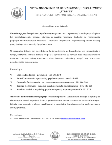 STOWARZYSZENIE NA RZECZ ROZWOJU SPOŁECZNEGO „STRICTE” THE ASSOCIATION FOR SOCIAL DEVELOPMENT Szczegółowy opis działań: Konsultacje psychologiczne i psychoterapeutyczne - Jest to pierwszy kontakt psychologiem lub psychoterapeutą, podczas którego, w wyniku rozmowy, dochodzi do rozpoznania przyczyn doświadczanych trudności i dobrania najbardziej odpowiedniej formy dalszej pracy. Jedną z nich może być psychoterapia. W przypadku jednak, gdy decydują się Państwo jedynie na konsultacje, bez skorzystania z terapii, zazwyczaj kontakt zamyka się po 1-3 spotkaniach, po których nasz specjalista udzieli Państwu możliwie pełnej informacji, jakie działania należałoby podjąć, aby skutecznie poradzić sobie z problemem. Prowadzący: *1 Elżbieta Brodnicka – psycholog - 501 746 870 *4 Anna Kurnatowska – psycholog, psychoterapeuta - 668 385 895 *5 Agnieszka Śmiechowska – psychoterapeuta, socjoterapeuta - 604 406 936 *7 Tamara Zieńkowicz – pedagog, psychoterapeuta, socjoterapeuta - 695 426 806 *8 Karolina Drelich – psycholog, psychoterapeuta, socjoterapeuta - 600 037 776 Warsztat "Trudna sztuka negocjacji" - warsztat pozwoli uczestnikom nauczyć się jednej ze skutecznych metod negocjacji, którą z powodzeniem można stosować w życiu codziennym. Zajęcia będą poparte wieloma przykładami a uczestnicy będą trenować w praktyce nowo zdobytą wiedzę. Prowadząca: *3 Diana Stołowska – mediator - 607 644 531, email: [email protected] Adres: Al. Wojska Polskiego 54/3 (I piętro) 70-744 Szczecin e-mail: [email protected], http://www.stricte.org KRS: 0000020938, NIP: 851-27-42-068, REGON: 812378744, Konto Bankowe: PKO BP SA I O/ SZCZECIN 57 10204795 0000 9402 01440114 STOWARZYSZENIE NA RZECZ ROZWOJU SPOŁECZNEGO „STRICTE” THE ASSOCIATION FOR SOCIAL DEVELOPMENT Spotkanie „Mediacja - weź sprawy w swoje ręce" - spotkanie będzie poświęcone mediacji jako alternatywnej formie rozwiązywania sporów i konfliktów. Uczestnicy dowiedzą się czym jest mediacja, w jakich sprawach może być stosowana, jaką rolę pełni mediator w całym procesie, jakie korzyści płyną z rozwiązania sporu korzystając z mediacji. Odpowiemy także na pytanie dlaczego mediacja jest tańsza i szybsza niż postępowanie w sądzie. Prowadząca: *3 Diana Stołowska – mediator - 607 644 531, email: [email protected] Warsztat "Rozwijanie kreatywności (dla Mam)" - Jeśli TY masz: dziecko i domowe obowiązki na głowie, to JA mam: pomysł na docenienie właśnie Ciebie i obudzenie Twojej potrzeby samorozwoju. Warsztat "Rozwijanie kreatywności" na pewno dostarczy Ci mnóstwo pozytywnych wrażeń, pomoże zdystansować się od "wyzwań szarej codzienności", zrelaksować i wydobyć tkwiące w Tobie pokłady twórczości. Wybór moich warsztatów oznacza, że cieszysz się z bycia mamą, ale pamiętasz, że jesteś też KOBIETĄ i pragniesz czegoś więcej; chcesz żyć aktywniej i ciekawiej! Spróbuj! - zapisz się i przyjdź:) Prowadząca: *2 Milena Stefańska – Naporowskatel - 512 266 681, [email protected] Warsztat Radzenia sobie ze stresem - gdzie obok odrobiny teorii i samopoznania, będziemy się po prostu relaksować i wyciszać. Nie takie łatwe, prawda..? :) Prowadząca: *1 Elżbieta Brodnicka – psycholog - 501 746 870 Adres: Al. Wojska Polskiego 54/3 (I piętro) 70-744 Szczecin e-mail: [email protected], http://www.stricte.org KRS: 0000020938, NIP: 851-27-42-068, REGON: 812378744, Konto Bankowe: PKO BP SA I O/ SZCZECIN 57 10204795 0000 9402 01440114