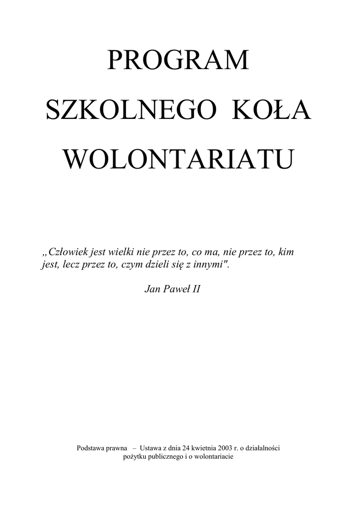 PROGRAM SZKOLNEGO KOŁA WOLONTARIATU „Człowiek jest wielki nie przez to, co ma, nie przez to, kim jest, lecz przez to, czym dzieli się z innymi". Jan Paweł II Podstawa prawna – Ustawa z dnia 24 kwietnia 2003 r. o działalności pożytku publicznego i o wolontariacie Wstęp Wolontariat szkolny to bezinteresowne zaangażowanie społeczności szkoły nauczycieli, uczniów i rodziców - na rzecz potrzebujących. Uczy postawy szacunku i tolerancji wobec drugiego człowieka. Okres nauki w szkole jest najwłaściwszy dla kreowania postaw altruistycznych. Wykorzystując otwartość i ciekawość świata młodego człowieka poprzez Wolontariat można odcisnąć dobroczynne piętno we wszystkich dziedzinach jego życia. Staramy się , aby uczniowie w naszej szkole byli pełni pasji i zaangażowania, kierowali się wrażliwością i troską o drugiego człowieka. Uczniowie chcą nieść bezinteresowną pomoc, służąc tak potrzebującym jak i samym sobie. Wolontariat również rozwija wśród młodzieży postawę alternatywną dla konsumpcyjnego stylu życia i uzależnień. Stwarza okazję do wyszukiwania autorytetów i budowania świata wartości, pomaga w rozwijaniu zainteresowań, w szukaniu pożytecznej formy spędzania czasu wolnego. Podejmowana przez uczniów-wolontariuszy aktywność wpływa pozytywnie na rozwój ich osobowości, jest ważna i pożądana ze względu na wymiar edukacyjnowychowawczy. CELE SZCZEGÓŁOWE PROGRAMU Zapoznanie młodzieży z ideą wolontariatu oraz jej propagowanie. Uwrażliwienie na cierpienie, samotność i potrzeby innych. Kształtowanie postaw prospołecznych. Rozwijanie empatii i tolerancji. Inspirowanie do aktywnego spędzania czasu wolnego. Kreowanie roli szkoły jako centrum lokalnej aktywności. Budowanie tradycji szkoły zgodnie z założeniami programu wychowawczego. Angażowanie się w działania na rzecz społeczności szkolnej i lokalnej, tworzenie więzi ze środowiskiem. Zawieranie głębokich, wartościowych przyjaźni. Kształtowanie umiejętności działania zespołowego. Współdziałanie z organizacjami społecznymi i młodzieżowymi. Możliwość wykorzystywania własnych umiejętności i doświadczeń. Rozwijanie zainteresowań. Zdobywanie doświadczenia w nowych dziedzinach. Wspieranie ciekawych inicjatyw młodzieży szkolnej. OBSZARY DZIAŁANIA Aktywność wolontariuszy ukierunkowana jest na dwa zasadnicze obszary: środowisko szkolne i środowisko pozaszkolne. ŚRODOWISKO SZKOLNE Organizowanie pomocy koleżeńskiej w nauce. Udział w zajęciach pozalekcyjnych. ŚRODOWISKO POZASZKOLNE Współpraca z: Gminnym Ośrodkiem Pomocy Społecznej w Kosowie. Gminnym Ośrodkiem Kultury i Sportu w Moszczenicy. Parafią Rzymskokatolicką Podwyższenia Świętego Krzyża w Moszczenicy. Akcje charytatywne wspierające instytucje, fundacje, stowarzyszenia i osoby prywatne. Schronisko dla zwierząt w Piotrkowie Tryb. REALIZOWANE ZADANIA Przybliżenie młodzieży idei wolontariatu podczas spotkań i godzin wychowawczych. Umożliwianie rozpoznania własnych motywacji do pracy. Poznanie obszarów pomocy. Poznanie zasad pracy i etyki działalności woluntarystycznej. Zapoznanie z prawami i obowiązkami wolontariuszy. Zamieszczenie informacji o działalności Wolontariatu na stronie internetowej szkoły. Zachęcanie uczniów do działań w Wolontariacie Szkolnym podczas rozmów prowadzonych przez nauczycieli i doświadczonych wolontariuszy. Lekcje wychowawcze poświęcone idei Wolontariatu. Lekcje religii poświęcone miłości bliźniego. Udział w Finale WOŚP. Nawiązanie współpracy z lokalnymi firmami i zakładami pracy. Spotkanie z przedstawicielem PCK. Szkolenia członków wolontariatu w zakresie udzielania pierwszej pomocy przedmedycznej. Okresowe zebrania członków Wolontariatu. Pomoc najuboższym rodzinom, samotnym, chorym i osobom starszym przy współpracy z miejscową parafią i GOPS w Kosowie. Uzupełnianie „mapy” potrzeb środowiska szkolnego i lokalnego. Monitorowanie działalności wolontariuszy. Wymiana doświadczeń. PRAWA WOLONTARIUSZA 1. Wolontariusz ma prawo do zgłaszania własnych propozycji i inicjatyw. 2. Wolontariusz ma prawo do podejmowania pracy w wymiarze nie utrudniającym nauki w szkole i pomocy w domu. 3. Wolontariusz ma prawo do wsparcia ze strony koordynatora lub innych pracowników Wolontariatu Szkolnego. 4. Wolontariusz nie powinien wykonywać prac objętych polityką etatową, czyli zastępować pracownika. 5. Wolontariusz ma prawo do otrzymania pisemnego zaświadczenia o wykonanej pracy. 6. Wolontariusz ma prawo być poinformowany o trudnościach, kosztach przejazdu związanych z wykonywaną pracą. 7. Nie wolno wywierać na wolontariusza presji moralnej w związku z realizowanym zadaniem pozostającym w konflikcie z jego przekonaniami. 8. Wolontariusz ma prawo do rezygnacji z pracy woluntarystycznej uprzedzając odpowiednio wcześniej koordynatora Wolontariatu Szkolnego. OBOWIĄZKI WOLONTARIUSZA 1. Niepełnoletni członkowie Wolontariatu Szkolnego muszą przedstawić pisemną zgodę rodziców lub opiekunów na działanie w Wolontariacie. 2. Wolontariusz ma obowiązek uczestniczyć w spotkaniach i szkoleniach Wolontariatu. 3. Wolontariusz ma obowiązek respektować zasady Szkolnego Wolontariatu takie jak: zasada osobistej pracy nad własnym rozwojem -zasada zaangażowania na rzecz potrzebujących pomocy -zasada troski o los słabszych -zasada prawdy, przyjaźni, życzliwości. CECHY WOLONTARIUSZA „Człowiek odnajduje siebie tylko w bezinteresownym dawaniu.” /bp Jan Chrapek/ WYSOKI STOPIEŃ WRAŻLIWOŚCI, który pozwala na wnikliwą obserwacje świata, tego, co nas otacza. To pomaga dostrzegać wokół siebie ludzi potrzebujących, samotnych, bezradnych, cierpiących i chorych. Samo dostrzeżenie ich- to nie wszystko! Wielu ludzi bowiem dostrzega wokół siebie potrzebujących, ale przechodzi obok obojętnie, nie reaguje. EMPATIA, czyli umiejętność wczuwania się w sytuację i doznania drugiego człowieka