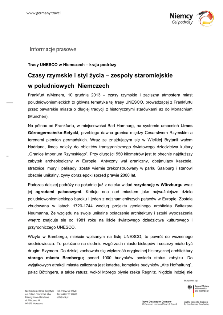 www.germany.travel Informacje prasowe Trasy UNESCO w Niemczech – kraju podróży Czasy rzymskie i styl życia – zespoły staromiejskie w południowych Niemczech Frankfurt n/Menem, 10 grudnia 2013 – czasy rzymskie i zaciszna atmosfera miast południowoniemieckich to główna tematyka tej trasy UNESCO, prowadzącej z Frankfurtu przez bawarskie miasta o długiej tradycji z historycznymi starówkami aż do Monachium (München). Na północ od Frankfurtu, w miejscowości Bad Homburg, na systemie umocnień Limes Górnogermańsko-Retycki, przebiega dawna granica między Cesarstwem Rzymskim a terenami plemion germańskich. Wraz ze znajdującym się w Wielkiej Brytanii wałem Hadriana, limes należy do obiektów transgranicznego światowego dziedzictwa kultury „Granice Imperium Rzymskiego”. Przy długości 550 kilometrów jest to obecnie najdłuższy zabytek archeologiczny w Europie. Antyczny wał graniczny, obejmujący kasztele, strażnice, mury i palisady, został wiernie zrekonstruowany w parku Saalburg i stanowi obecnie unikalny, żywy obraz epoki sprzed prawie 2000 lat. Podczas dalszej podróży na południe już z daleka widać rezydencję w Würzburgu wraz jej ogrodami pałacowymi. Króluje ona nad miastem jako najważniejsze dzieło południowoniemieckiego baroku i jeden z najznamienitszych pałaców w Europie. Została zbudowana w latach 1720-1744 według projektu genialnego architekta Baltazara Neumanna. Ze względu na swoje unikalne połączenie architektury i sztuki wyposażenia wnętrz znajduje się od 1981 roku na liście światowego dziedzictwa kulturowego i przyrodniczego UNESCO. Wizyta w Bambergu, mieście wpisanym na listę UNESCO, to powrót do wczesnego średniowiecza. To położone na siedmiu wzgórzach miasto biskupów i cesarzy miało być drugim Rzymem. Do dzisiaj zachowała się większość oryginalnej historycznej architektury starego miasta Bambergu; ponad 1000 budynków posiada status zabytku. Do wyjątkowych atrakcji miasta zaliczana jest katedra, kompleks budynków „Alte Hofhaltung”, pałac Böttingera, a także ratusz, wokół którego płynie rzeka Regnitz. Nigdzie indziej nie Niemiecka Centrala Turystyki c/o Polsko-Niemiecka Izba Przemysłowo-Handlowa ul. Miodowa 14 00-246 Warszawa Tel. +48 22 53 10 528 Fax +48 22 53 10 688 [email protected] www.germany.travel można znaleźć lepszego przykładu podstawowej architektury środkowoeuropejskiego miasta powstałego we wczesnym średniowieczu. W odległości jedynie 70 kilometrów znajduje się Opera Margrabiów w Bayreuth. UNESCO uhonorowało tę wspaniałą barokową budowlę w 2012 roku jako „unikalny monument europejskiej kultury świętowania i kultury muzycznej baroku”. Bayreuth jest znane na całym świecie dzięki organizowanemu tutaj Festiwalowi Wagnerowskiemu. Trasa omija Norymbergę (Nürnberg) i prowadzi dalej do ostatniego na niej zabytku wpisanego na listę UNESCO – do Ratyzbony (Regensburg), stanowiącej wzorcowy przykład średniowiecznego dużego miasta, w dodatku doskonale zachowanego. Stare miasto, które w dużym stopniu nie uległo niszczeniu podczas ataków bombowych w czasie drugiej wojny światowej, stanowi ze swoimi kamienicami patrycjuszy oraz wieżami mieszkalno-obronnymi żywe świadectwo trwającej od ponad 2000 lat historii miasta. Zespół „Stare miasto w Ratyzbonie z dzielnicą Stadtamhof” obejmuje 984 pojedyncze zabytki i swoją wielkością odpowiada wielkości Ratyzbony z 1320 roku. O GNTB Niemiecka Centrala Turystyki (niem. DZT = Deutsche Zentrale für Tourismus, ang. GNTB = German National Tourist Board) to narodowa „izba turystyki” Niemiec z siedzibą główną we Frankfurcie nad Menem. Centrala zajmuje się promowaniem Niemiec jako kraju turystycznego na zlecenie Federalnego Ministerstwa Gospodarki i Technologii (BMWi), które wspiera ją na mocy uchwały niemieckiego Bundestagu. GNTB zajmuje się tworzeniem strategii i produktów oraz działaniami marketingowymi w celu dalszego umocnienia pozytywnego wizerunku Niemiec za granicą jako celu podróży oraz wspierania turystyki niemieckiej. GNTB posiada 30 przedstawicielstw zagranicznych na całym świecie. Więcej informacji można znaleźć w naszym internetowym centrum prasowym na stronie www.germany.travel/presse. Niemiecka Centrala Turystyki c/o Polsko-Niemiecka Izba Przemysłowo-Handlowa ul. Miodowa 14 00-246 Warszawa Tel. +48 22 53 10 528 Fax +48 22 53 10 688 [email protected]
