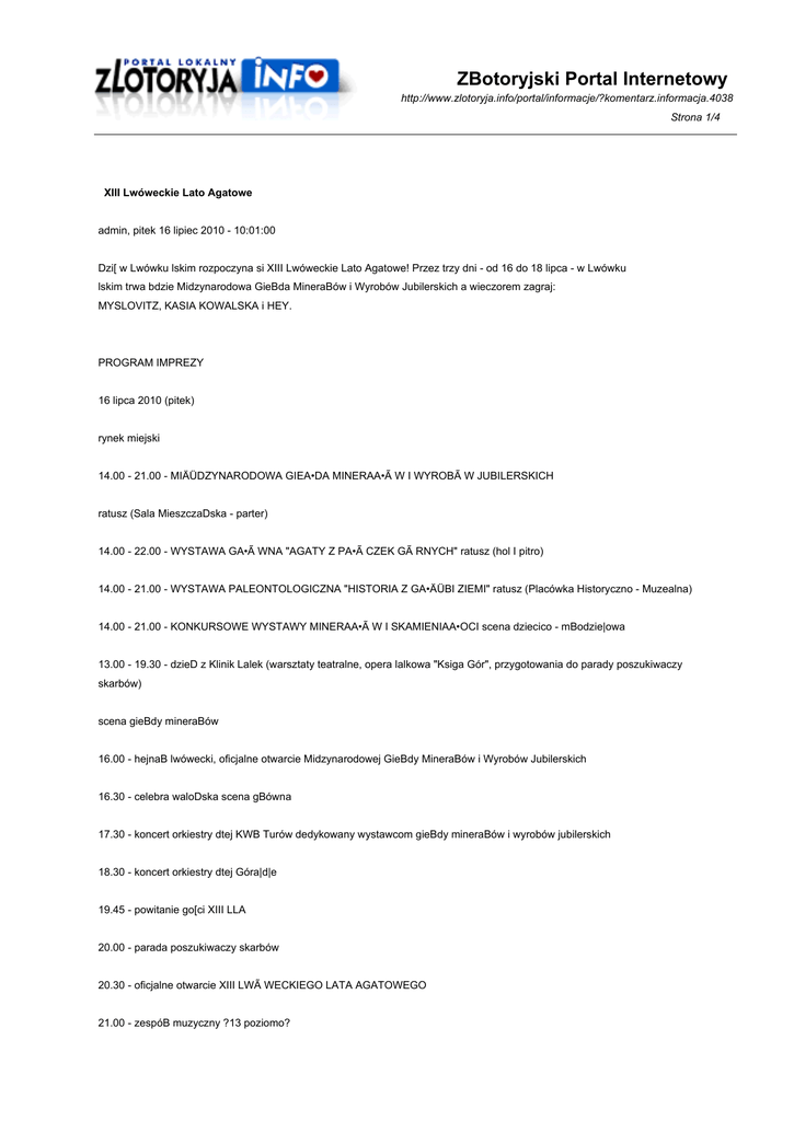ZBotoryjski Portal Internetowy http://www.zlotoryja.info/portal/informacje/?komentarz.informacja.4038 Strona 1/4 XIII Lwóweckie Lato Agatowe admin, pitek 16 lipiec 2010 - 10:01:00 Dzi[ w Lwówku lskim rozpoczyna si XIII Lwóweckie Lato Agatowe! Przez trzy dni - od 16 do 18 lipca - w Lwówku lskim trwa bdzie Midzynarodowa GieBda MineraBów i Wyrobów Jubilerskich a wieczorem zagraj: MYSLOVITZ, KASIA KOWALSKA i HEY. PROGRAM IMPREZY 16 lipca 2010 (pitek) rynek miejski 14.00 - 21.00 - MIÄÜDZYNARODOWA GIEA•DA MINERAA•Ã W I WYROBÃ W JUBILERSKICH ratusz (Sala MieszczaDska - parter) 14.00 - 22.00 - WYSTAWA GA•Ã WNA "AGATY Z PA•Ã CZEK GÃ RNYCH" ratusz (hol I pitro) 14.00 - 21.00 - WYSTAWA PALEONTOLOGICZNA "HISTORIA Z GA•ÄÜBI ZIEMI" ratusz (Placówka Historyczno - Muzealna) 14.00 - 21.00 - KONKURSOWE WYSTAWY MINERAA•Ã W I SKAMIENIAA•OCI scena dziecico - mBodzie|owa 13.00 - 19.30 - dzieD z Klinik Lalek (warsztaty teatralne, opera lalkowa "Ksiga Gór", przygotowania do parady poszukiwaczy skarbów) scena gieBdy mineraBów 16.00 - hejnaB lwówecki, oficjalne otwarcie Midzynarodowej GieBdy MineraBów i Wyrobów Jubilerskich 16.30 - celebra waloDska scena gBówna 17.30 - koncert orkiestry dtej KWB Turów dedykowany wystawcom gieBdy mineraBów i wyrobów jubilerskich 18.30 - koncert orkiestry dtej Góra|d|e 19.45 - powitanie go[ci XIII LLA 20.00 - parada poszukiwaczy skarbów 20.30 - oficjalne otwarcie XIII LWÃ WECKIEGO LATA AGATOWEGO 21.00 - zespóB muzyczny ?13 poziomo? ZBotoryjski Portal Internetowy http://www.zlotoryja.info/portal/informacje/?komentarz.informacja.4038 Strona 2/4 22.30 - MYSLOVITZ 17 lipca 2010 (sobota) Urzd Gminy i Miasta 12.00 - spotkanie miast partnerskich: Heidenau (Niemcy), Wilthen (Niemcy) Velký Senov (Czechy), Chrastava (Czechy), Noidans les Vesoul (Francja), Lwówek (woj. wielkopolskie), Lwówek lski rynek miejski 10.00 - 21.00 - MIÄÜDZYNARODOWA GIEA•DA MINERAA•Ã W I WYROBÃ WJUBILERSKICH ratusz (Sala MieszczaDska - parter) 10.00 - 22.00 - WYSTAWA GA•Ã WNA "AGATY Z PA•Ã CZEK GÃ RNYCH" ratusz (hol I pitro) 10.00 - 21.00 - WYSTAWA PALEONTOLOGICZNA "HISTORIA Z GA•ÄÜBI ZIEMI" ratusz (Placówka Historyczno - Muzealna) 10.00 - 21.00 - KONKURSOWE WYSTAWY MINERAA•Ã W I SKAMIENIAA•OCI scena dziecico - mBodzie|owa 13.00 - 20.00 - Biesiada BaBkaDska (prezentacja muzyki buBgarskiej, macedoDskiej, serbskiej, moBdawskiej,cygaDskiej w wykonaniu zespoBu TERRA & BaBkan Folk Acoustic, warsztaty taneczne, zabawa taneczna, prezentacja i degustacja regionalnych potraw) scena gBówna 15.00 - prezentacje artystyczne miast partnerskich 16.30 - LLAValon (w przerwie ogBoszenie wyników i wrczenie nagród zwycizcom konkursu na najciekawsz kolekcj mineraBów) 17.30 - turniej miast partnerskich 18.30 - wrczenie nagród zwycizcom turnieju o tytuB Mocarza LLA 19.00 - blues & rock z zespoBem Za Krat 20.30 - koncert zespoBu DIKANDA 22.00 - KASIA KOWALSKA ZBotoryjski Portal Internetowy http://www.zlotoryja.info/portal/informacje/?komentarz.informacja.4038 Strona 3/4 23.30 - biesiada pod gwiazdami z zespoBem Toples 18 lipca 2010 (niedziela) rynek miejski 10.00 - 21.00 - MIÄÜDZYNARODOWA GIEA•DA MINERAA•Ã W I WYROBÃ W JUBILERSKICH ratusz (Sala MieszczaDska - parter) 10.00 - 22.00 - WYSTAWA GA•Ã WNA "AGATY Z PA•Ã CZEK GÃ RNYCH" ratusz (hol I pitro) 10.00 - 21.00 - WYSTAWA PALEONTOLOGICZNA "HISTORIA Z GA•ÄÜBI ZIEMI" ratusz (Placówka Historyczno ? Muzealna) 10.00 - 21.00 - KONKURSOWE WYSTAWY MINERAA•Ã W I SKAMIENIAA•OCI scena dziecico - mBodzie|owa 12.00 - 20.00 - Teatr Wagabunda - Port Magiczny (teatr uliczny, akcenty cyrkowe, wagabundowy plac zabaw, teatr taDca, wystpy zespoBów muzycznych scena gBówna 15.00 - Big El-Tur Band 16.00 - Honorata Magdeczko-Capote i zespóB Sempilce z pie[niami BuBata Okud|awy i nie tylko. 17.30 - Czardasz Trio ? koncert dla przyjacióB LLA 19.00 - zapraszamy do ssiadów zza miedzy 19.30 - kabaret JURKI 20.40 - Orfeusz 22.30 - HEY 24.00 - oficjalne zakoDczenie XIII Lwóweckiego Lata Agatowego - widowisko pirotechniczne Imprezy towarzyszce i inne atrakcje: - pokazy slajdów i prelekcje o tematyce mineralogicznej; - wyrobisko agatowe; ZBotoryjski Portal Internetowy http://www.zlotoryja.info/portal/informacje/?komentarz.informacja.4038 Strona 4/4 - wyprawy na pola agatowe; - osada WaloDczyków (chata waloDska, pokazy cicia i szlifowania agatów, obrzdy waloDskie); - prezentacja Agatosa ? obiegowej monety okoliczno[ciowej LLA - gieBda rzemiosBa i rkodzieBa artystycznego; - park zabaw dla dzieci (eurobungee, quady, Bawka hip-hop, dmuchane zje|d|alnie, suche baseny, diabelski mByn, autodrom, ranger, break dance, elektryczne samochody, przeja|d|ki bryczk); - turniej o tytuB Mocarza LLA; - bieg szlakiem agatowym; - zawody strzeleckie o Agat XIII LLA; - zawody wdkarskie o Agat Lwówecki; - urozmaicona oferta cateringowa A tak byBo rok temu na XII Lwóweckim Lecie Agatowzm
