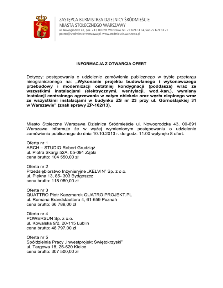 ZASTĘPCA BURMISTRZA DZIELNICY ŚRÓDMIEŚCIE MIASTA STOŁECZNEGO WARSZAWY ul. Nowogrodzka 43, pok. 233, 00-691 Warszawa, tel. 22 699 83 34, faks 22 699 83 21 [email protected], www.srodmiescie.warszawa.pl INFORMACJA Z OTWARCIA OFERT Dotyczy: postępowania o udzielenie zamówienia publicznego w trybie przetargu nieograniczonego na: „Wykonanie projektu budowlanego i wykonawczego przebudowy i modernizacji ostatniej kondygnacji (poddasza) wraz ze wszystkimi instalacjami (elektrycznymi, wentylacji, wod.-kan.), wymiany instalacji centralnego ogrzewania w całym obiekcie oraz węzła cieplnego wraz ze wszystkimi instalacjami w budynku ZS nr 23 przy ul. Górnośląskiej 31 w Warszawie” (znak sprawy ZP-102/13). Miasto Stołeczne Warszawa Dzielnica Śródmieście ul. Nowogrodzka 43, 00-691 Warszawa informuje że w wyżej wymienionym postępowaniu o udzielenie zamówienia publicznego do dnia 10.10.2013 r. do godz. 11:00 wpłynęło 8 ofert. Oferta nr 1 ARCH – STUDIO Robert Grudziąż ul. Piotra Skargi 52A, 05-091 Ząbki cena brutto: 104 550,00 zł Oferta nr 2 Przedsiębiorstwo Inżynieryjne „KELVIN” Sp. z o.o. ul. Piękna 13, 85- 303 Bydgoszcz cena brutto: 118 080,00 zł Oferta nr 3 QUATTRO Piotr Kaczmarek QUATRO PROJEKT.PL ul. Romana Brandstaettera 4, 61-659 Poznań cena brutto: 66 789,00 zł Oferta nr 4 POWERSUN Sp. z o.o. ul. Kowalska 9/2, 20-115 Lublin cena brutto: 48 797,00 zł Oferta nr 5 Spółdzielnia Pracy „Inwestprojekt Świętokrzyski” ul. Targowa 18, 25-520 Kielce cena brutto: 307 500,00 zł Oferta nr 6 Grzegorz Brewczyński GID Zespół Projektowy ul. Międzynarodowa 64/66A lok.135, 03-922 Warszawa cena brutto: 132 840,00 zł Oferta nr 7 Mieczysław Szulborski Zespół Usług Projektowych „ARTBUD” ul. Fabryczna 4, 18-300 Zambrów cena brutto: 195 570,00 zł Oferta nr 8 Biuro Inżynierskie Jan Antosik ul. Ciszewska 3 lok. 4, 02-443 Warszawa cena brutto: 86 000,00 zł Kwota jaką zamawiający zamierza przeznaczyć na sfinansowanie zamówienia wynosi brutto 156 250,00 zł. Termin realizacji, okres rękojmi, warunki płatności zgodnie z SIWZ. ZASTĘPCA BURMISTRZA DZIELNICY ŚRÓDMIEŚCIE Miasta Stołecznego Warszawy Andrzej Robert Zieliński