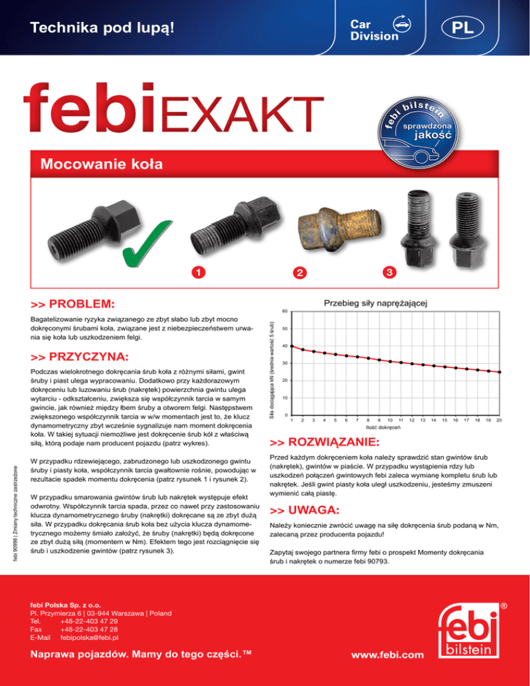 PL Technika pod lupą! febiEXAKT Mocowanie koła 1 >> PROBLEM: >> PRZYCZYNA: febi 90998 | Zmiany techniczne zastrzeżone Podczas wielokrotnego dokręcania śrub koła z różnymi siłami, gwint śruby i piast ulega wypracowaniu. Dodatkowo przy każdorazowym dokręceniu lub luzowaniu śrub (nakrętek) powierzchnia gwintu ulega wytarciu - odkształceniu, zwiększa się współczynnik tarcia w samym gwincie, jak również między łbem śruby a otworem felgi. Następstwem zwiększonego współczynnik tarcia w w/w momentach jest to, że klucz dynamometryczny zbyt wcześnie sygnalizuje nam moment dokręcenia koła. W takiej sytuacji niemożliwe jest dokręcenie śrub kół z właściwą siłą, którą podaje nam producent pojazdu (patrz wykres). W przypadku rdzewiejącego, zabrudzonego lub uszkodzonego gwintu śruby i piasty koła, współczynnik tarcia gwałtownie rośnie, powodując w rezultacie spadek momentu dokręcenia (patrz rysunek 1 i rysunek 2). W przypadku smarowania gwintów śrub lub nakrętek występuje efekt odwrotny. Współczynnik tarcia spada, przez co nawet przy zastosowaniu klucza dynamometrycznego śruby (nakrętki) dokręcane są ze zbyt dużą siła. W przypadku dokręcania śrub koła bez użycia klucza dynamometrycznego możemy śmiało założyć, że śruby (nakrętki) będą dokręcone ze zbyt dużą siłą (momentem w Nm). Efektem tego jest rozciągnięcie się śrub i uszkodzenie gwintów (patrz rysunek 3). febi Polska Sp. z o.o. Pl. Przymierza 6 | 03-944 Warszawa | Poland Tel. +48-22-403 47 29 Fax +48-22-403 47 28 [email protected] Naprawa pojazdów. Mamy do tego części.™ Przebieg siły naprężającej 60 Siła dociągająca kN (średnia wartość 5 śrub) Bagatelizowanie ryzyka związanego ze zbyt słabo lub zbyt mocno dokręconymi śrubami koła, związane jest z niebezpieczeństwem urwania się koła lub uszkodzeniem felgi. 3 2 50 40 30 20 10 0 1 2 3 4 5 6 7 8 9 10 11 12 13 14 15 16 17 18 19 20 Ilość dokręceń >> ROZWIĄZANIE: Przed każdym dokręceniem koła należy sprawdzić stan gwintów śrub (nakrętek), gwintów w piaście. W przypadku wystąpienia rdzy lub uszkodzeń połączeń gwintowych febi zaleca wymianę kompletu śrub lub nakrętek. Jeśli gwint piasty koła uległ uszkodzeniu, jesteśmy zmuszeni wymienić całą piastę. >> UWAGA: Należy koniecznie zwrócić uwagę na siłę dokręcenia śrub podaną w Nm, zalecaną przez producenta pojazdu! Zapytaj swojego partnera firmy febi o prospekt Momenty dokręcania śrub i nakrętek o numerze febi 90793.