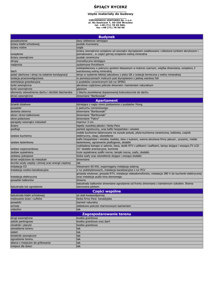 ŚPIĄCY RYCERZ _______________ Użyte materiały do budowy _______________ CZECHOWICZ VENTURES Sp. z o.o. ul. Na Szańcach 7, 50-320 Wrocław tel. +48 (71) 78 50 966, fax +48 (71) 78 50 96 Budynek posadowienie ściany klatki schodowej ściany nośne ocieplenie ściany zewnętrzne stropy nadproża dach połać dachowa i strop na ostatnie kondygnacji izolacja przeciwwilgociowa wentylacja grawitacyjna tynki zewnętrzna tynki wewnętrzne elementy odwodnienia dachu i obróbki blacharskie drzwi wewnętrzne ławy żelbetowe istniejące pustak murowany cegła ściany zewnętrzne ocieplone od zewnątrz styropianem osiatkowane i obłożone tynkiem akrylowym i pomalowane , w części górnej ocieplone wełną mineralna pustak ceramiczny monolityczne istniejące systemowe Porotherm wielopołaciowy o pokryciu gontem blaszanym w kolorze czarnym, więźba drewniana, ocieplony 2 warstwową wełną mineralną strop w systemie lekkiej zabudowy z płyty GK z izolacja termiczna z wełny mineralnej w pomieszczeniach mokrych pod styropianem z jednej warstwy foli z pustaków ceramicznych lub rur SPIRO akrylowe częściowo pokryte drewnem i kamieniem naturalnym gipsowe z blachy powlekanej dopasowanej kolorystycznie do dachu drewniane "Bartkowiak" Apartament ścianki działowe posadzki stolarka okienna okna i drzwi balkonowe okna połaciowe parapety wewnątrz mieszkań ściany podłogi balustrada lub ogrodzenie istniejące z cegły nowo postawione z pustaków Ytong z jastrychu cementowego drewniane "Bartkowiak" drewniane "Bartkowiak" drewniane "Fakro" marmur 3 cm. tapety wysokiej jakości i farby-Para parkiet egzotyczny, oraz kafle hiszpańskie i włoskie meble kuchenne lakierowane na wysoki połysk, płyta kuchenna ceramiczna, lodówka, czajnik elektryczny, okap, oświetlenie kafle hiszpańskie i włoskie, toaleta, zlew z lustrem, wanna akrylowa firmy jakuzzi , prysznic, meble łazienkowe, ogrzewanie podłogowe, dodatki rozkładana kanapa w salonie, ława, stolik RTV z półkami i szafkami, lampy stojące i wiszące,TV LCD 32" dodatki aranżacyjne, kominek Łoże sypialniane szafki nocne, lampki nocne, szafy, dodatki. łóżka szafy oraz oświetlenie stojące i wiszące dodatki drewniane tak Viessmann 60 KW, wspomagany instalacja solarną z rur polietylenowych, instalacja kanalizacyjna z rur PCV gniazda wtykowe, gniazda RTV, instalacja videodomofonów, instalacja 380 V do kuchenki elektrycznej oraz instalacja audio kina domowego drewno balustrady balkonów drewniane ogrodzenie od frontu drewniane z kamiennym cokołem. Brama sterowana pilotem balustrada klatki schodowej malowanie ścian i sufitów posadzki schody videofon ze stali kwasoodpornej farba firmy Para- kanadyjska kamień naturalny żelbetowe pokryte marmurowym kamieniem tak drogi wewnętrzne zatoki parkingowe chodniki i placyki oświetlenie terenu zieleń śmietniki zewnętrzne ogrodzenie terenu altana z miejscem do grillowania miejsca dla dzieci kostka granitowa kostka granitowa oraz darń kostka granitowa tak tak tak tak tak tak zestaw kuchenny zestaw łazienkowy zestaw wypoczynkowy zestaw sypialniany zestawy pokojowe drzwi wejściowe do mieszkań liczniki wody ciepłej i zimnej oraz energii cieplnej instalacja CO instalacja wodno-kanalizacyjna instalacja elektryczna posadzki balkonów Części wspólne Zagospodarowanie terenu