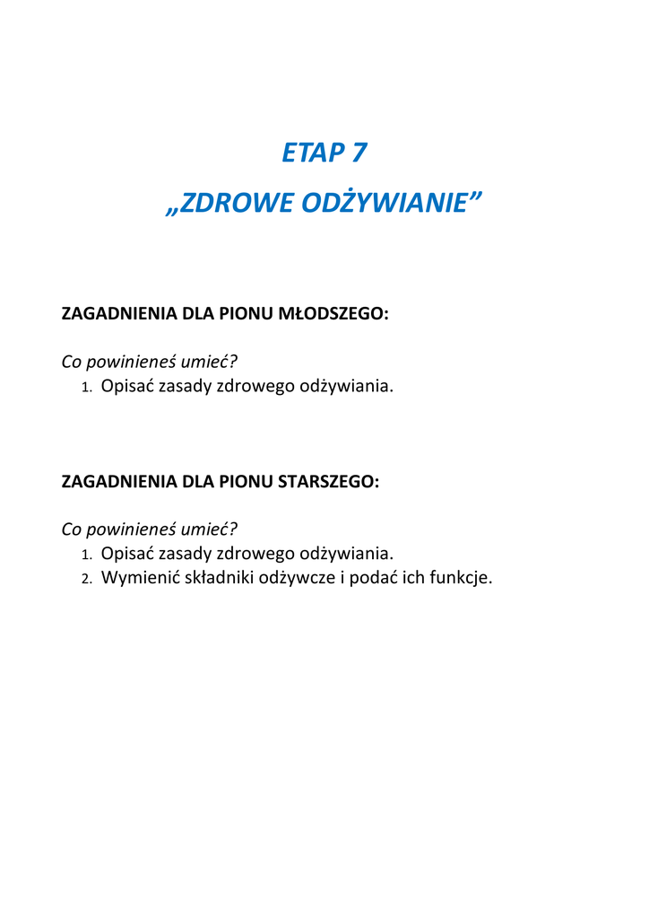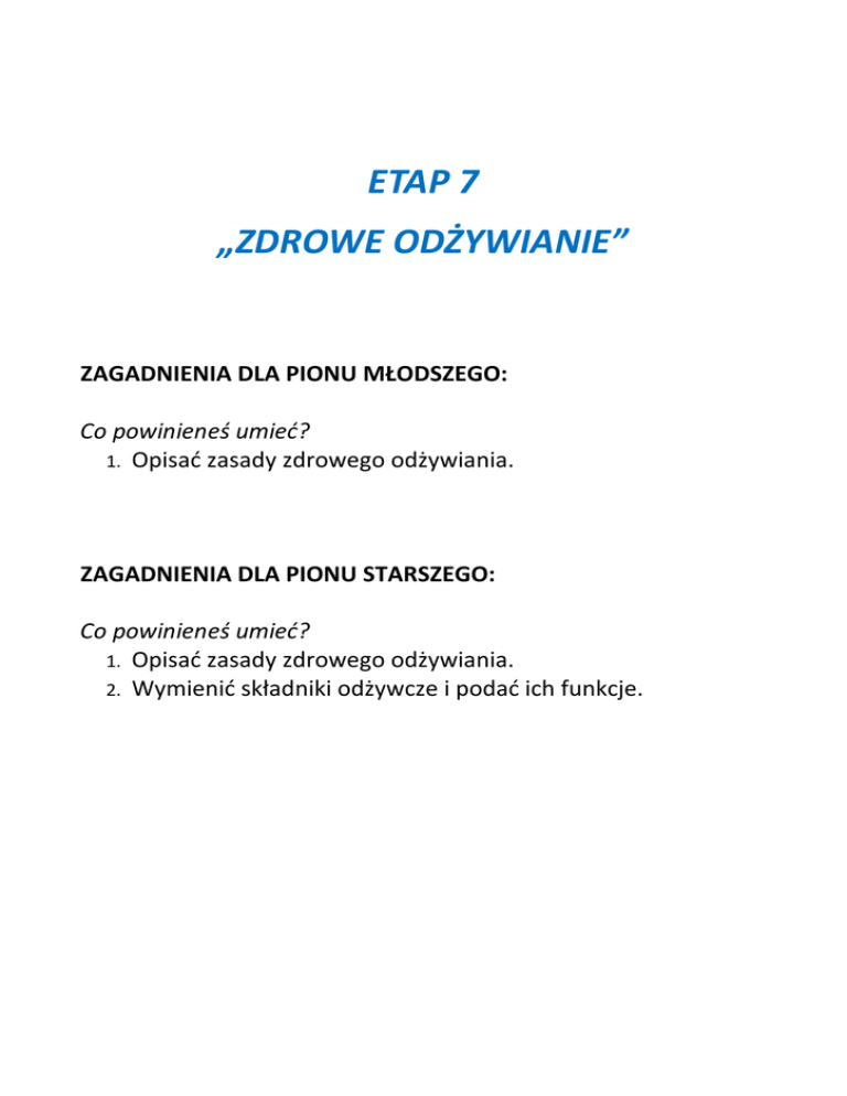 ETAP 7 „ZDROWE ODŻYWIANIE” ZAGADNIENIA DLA PIONU MŁODSZEGO: Co powinieneś umieć? 1. Opisać zasady zdrowego odżywiania. ZAGADNIENIA DLA PIONU STARSZEGO: Co powinieneś umieć? 1. Opisać zasady zdrowego odżywiania. 2. Wymienić składniki odżywcze i podać ich funkcje.