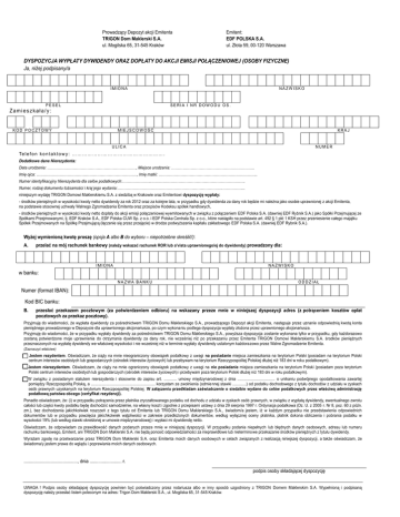 Prowadzący Depozyt akcji Emitenta TRIGON Dom Maklerski S.A. ul. Mogilska 65, 31-545 Kraków Emitent: EDF POLSKA S.A. ul. Złota 59, 00-120 Warszawa DYSPOZYCJA WYPŁATY DYWIDENDY ORAZ DOPŁATY DO AKCJI EMISJI POŁĄCZENIOWEJ (OSOBY FIZYCZNE) Ja, niżej podpisany/a IMIONA PESEL NAZWISKO SERIA I NR DOWODU OS. Zamieszkała/y: KOD POCZTOWY MIEJSCOWOŚĆ KRAJ ULICA NUMER Te l e f o n k o n t a k t o w y : … … … … … … … … … … … … … … … … … … . Dodatkowe dane Nierezydenta: Data urodzenia: ……………………………………………………………, Miejsce urodzenia: ……………………………………………………….. Imię ojca: ……………………………………………………………………, Imię matki: ………………………………………………………………….. Numer identyfikacyjny Nierezydenta dla celów podatkowych:…………………..………………………………………………………………. Numer, rodzaj dokumentu tożsamości i kraj jego wydania:……………………………………………………………………….……………... niniejszym wydaję TRIGON Domowi Maklerskiemu S.A. z siedzibą w Krakowie oraz Emitentowi dyspozycję wypłaty: - środków pieniężnych w wysokości kwoty netto dywidendy za rok 2012 oraz za kolejne lata, w przypadku gdy dywidenda za dany rok będzie mi należna jako osobie uprawnionej z akcji Emitenta, na podstawie stosownej uchwały Walnego Zgromadzenia Emitenta oraz przepisów Kodeksu spółek handlowych, - środków pieniężnych w wysokości kwoty netto dopłaty do akcji emisji połączeniowej wyemitowanych w związku z połączeniem EDF Polska S.A. (dawniej EDF Rybnik S.A.) jako Spółki Przejmującej ze Spółkami Przejmowanymi, tj. EDF Kraków S.A., EDF Polska CUW Sp. z o.o. i EDF Polska Centrala Sp. z o.o., które nastąpiło na podstawie art. 492 § 1 pkt 1 KSH przez przeniesienie całego majątku Spółek Przejmowanych na Spółkę Przejmującą (łączenie się przez przejęcie) w drodze podwyższenia kapitału zakładowego EDF Polska S.A. (dawniej EDF Rybnik S.A.). Wyżej wymienioną kwotę proszę (opcja A albo B do wyboru – niepotrzebne skreślić!): A. przelać na mój rachunek bankowy (należy wskazać rachunek ROR lub a’vista uprawnionego/ej do dywidendy) prowadzony dla: IMIONA NAZWISKO w banku: NA ZWA BA NK U ODDZIAŁ Numer (format IBAN): Kod BIC banku: B. przesłać przekazem pocztowym (za potwierdzeniem odbioru) na wskazany przeze mnie w niniejszej dyspozycji adres (z potrąceniem kosztów opłat pocztowych za przekaz pocztowy). Przyjmuję do wiadomości, że wypłata dywidendy za pośrednictwem TRIGON Domu Maklerskiego S.A., prowadzącego Depozyt akcji Emitenta, następuje przez uznanie odpowiednią kwotą konta pieniężnego prowadzonego w Depozycie dla uprawnionego akcjonariusza, po czym wykonaniu podlega dyspozycja wypłaty złożona przez uprawnionego akcjonariusza. Przyjmuję do wiadomości, że w przypadku wypłaty dywidendy za pośrednictwem TRIGON Domu Maklerskiego S.A., powyższa dyspozycja zostanie wykonana tylko w przypadku, gdy każdorazowo zostaną potwierdzone moje uprawnienia do otrzymania dywidendy za dany rok, nie wcześniej niż po przekazaniu przez Emitenta TRIGON Domowi Maklerskiemu S.A. środków pieniężnych przeznaczonych na wypłatę dywidendy we właściwej wysokości i nie wcześniej niż w terminie wypłaty dywidendy ustalonym każdorazowo przez Walne Zgromadzenie Emitenta. (Zaznaczyć właściwe) Jestem rezydentem. Oświadczam, że ciąży na mnie nieograniczony obowiązek podatkowy z uwagi na posiadanie miejsca zamieszkania na terytorium Polski (posiadam na terytorium Polski centrum interesów osobistych lub gospodarczych (ośrodek interesów życiowych) lub przebywam na terytorium Rzeczypospolitej Polskiej dłużej niż 183 dni w roku podatkowym). Jestem nierezydentem. Oświadczam, że ciąży na mnie ograniczony obowiązek podatkowy z uwagi na nie posiadanie miejsca zamieszkania na terytorium Polski (posiadam poza terytorium Polski centrum interesów osobistych lub gospodarczych (ośrodek interesów życiowych) i przebywam poza terytorium Polski dłużej niż 183 dni w roku podatkowym). W związku z posiadanym statutem nierezydenta i stosownie do zapisu art. ............ umowy międzynarodowej z dnia ................................... o unikaniu podwójnego opodatkowania zawartej pomiędzy Rzeczpospolitą Polską, a ............................................................ korzystam ze zwolnienia (odmiennej stawki .............) od podatku dochodowego z tytułu dochodów z udziału w zyskach osób prawnych uzyskanych na terytorium Rzeczpospolitej Polskiej. W załączeniu przedkładam zaświadczenie o siedzibie wydane do celów podatkowych przez właściwą administrację podatkową państwa obcego (certyfikat rezydencji). Ponadto oświadczam, że: (i) w przypadku potrącenia przez płatnika zryczałtowanego podatku od dochodu z udziału w zyskach osób prawnych, w związku z wypłatą dywidendy, ewentualnego zwrotu całości lub części kwoty podatku będę dochodzić samodzielnie, na własny koszt i zgodnie z przepisami ustawy z dnia 29 sierpnia 1997 r. Ordynacja podatkowa (Dz. U. z 2005 r. Nr 8, poz. 60 z późn. zm.), bez dochodzenia jakichkolwiek roszczeń z tego tytułu od Emitenta lub TRIGON Domu Maklerskiego S.A., świadom/a jestem, iż w każdym przypadku nie przedstawienia odpowiednich dokumentów lub w przypadku powzięcia jakichkolwiek wątpliwości w zakresie przedłożonych dokumentów, według wyłącznej oceny płatnika, płatnik dokona obliczenia i pobrania podatku w wysokości 19% (lub według stawki określonej w umowie międzynarodowej) i wypłaci mi dywidendę netto. Oświadczam, że odpowiadam za prawidłowość danych podanych przeze mnie w niniejszej dyspozycji. W przypadku podania niepełnych lub błędnych danych osobowych, adresu lub numeru rachu