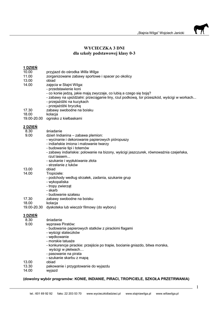 „Stajnia Wilga” Wojciech Janicki WYCIECZKA 3 DNI dla szkoły podstawowej klasy 0-3 1 DZIEŃ 10.00 11.00 13.00 14.00 przyjazd do ośrodka Willa Wilga zorganizowane zabawy sportowe i spacer po okolicy obiad zajęcia w Stajni Wilga: - przedstawienie koni - co konie jedzą, jakie mają zwyczaje, co lubią a czego się boją? - zabawy na ujeżdżalni: przeciąganie liny, rzut podkową, tor przeszkód, wyścigi w workach... - przejażdżki na kucykach - przejażdżki bryczką 17.30 zabawy swobodne na boisku 18.00 kolacja 19.00-20.00 ognisko z kiełbaskami 2 DZIEŃ 8.30 9.00 śniadanie dzień Indianina – zabawa plemion: - wycinanie i dekorowanie papierowych pióropuszy - indiańskie imiona i malowanie twarzy - budowanie tipi i totemów - zabawy indiańskie: polowanie na bizony, wyścigi jaszczurek, równoważnia czejeńska, rzut lassem... - szukanie i wypłukiwanie złota - strzelanie z łuków 13.00 obiad 14.00 Tropiciele: - podchody według strzałek, zadania, szukanie grup - wykopaliska - tropy zwierząt - skarb - budowanie szałasu 17.30 zabawy swobodne na boisku 18.00 kolacja 19.00-20.30 dyskoteka lub wieczór filmowy (do wyboru) 3 DZIEŃ 8.30 9.00 13.00 13.30 14.00 śniadanie wyprawa Piratów: - budowanie papierowych statków z pirackimi flagami - wyścigi stateczków - wędkowanie - morskie tatuaże - konkurencje pirackie: przejście po trapie, bocianie gniazdo, bitwa morska, wyścigi w płetwach… - pasowanie na pirata - szukanie skarbu z mapą obiad pakowanie i przygotowanie do wyjazdu wyjazd (dowolny wybór programów: KONIE, INDIANIE, PIRACI, TROPICIELE, SZKOŁA PRZETRWANIA) 1 tel.: 601 69 92 92 faks: 22 203 53 70 www.wycieczkidladzieci.pl www.stajniawilga.pl www.willawilga.pl „Stajnia Wilga” Wojciech Janicki KOSZT WYCIECZKI 41 – 46 dzieci: 295 zł / dziecko 31 – 40 dzieci: 310 zł / dziecko 21 – 30 dzieci: 325 zł / dziecko 15 – 20 dzieci: 340 zł / dziecko CENA OBEJMUJE - zakwaterowanie i pełne wyżywienie - bezpłatne zakwaterowanie i wyżywienie dla 1 opiekuna na każdą rozpoczętą 15-tkę dzieci - organizację wyżej przedstawionego programu - opiekę wychowawców i instruktorów z uprawnieniami podczas zajęć - pamiątkowe znaczki INFORMACJE DODATKOWE - śniadania i kolacje są w formie szwedzkiego stołu, obiad dwudaniowy z napojem i deserem (np.: owoc, galaretka, ciasteczka itp.); - przez cały dzień w jadalni jest dostępna woda i woda z sokiem dla dzieci, kawa i herbata dla opiekunów; - na terenie ośrodka jest jadalnia z salą, recepcja ze sklepikiem (napoje, słodycze, pamiątki), taras, zadaszona wiata, plac zabaw dla dzieci, miejsce na ognisko, piaszczyste boisko do siatkówki, kosz do koszykówki, stadnina, hala, łąki; - cena nie obejmuje transportu (zależy od liczby kilometrów); współpracujemy ze sprawdzonymi przewoźnikami – autokary, busy; Podane ceny zawierają podatek VAT. Przy zmianie programu cena może ulec zmianie. Oferta na rok 2017. 2 tel.: 601 69 92 92 faks: 22 203 53 70 www.wycieczkidladzieci.pl www.stajniawilga.pl www.willawilga.pl