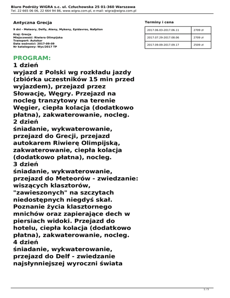 Biuro Podróży WIGRA s.c. ul. Człuchowska 25 01-360 Warszawa Tel. 22 665 06 06, 22 664 94 86, www.wigra.com.pl, e-mail: [email protected] Antyczna Grecja 9 dni - Meteory, Delfy, Ateny, Mykeny, Epidavros, Nafplion Kraj: Grecja Miejscowość: Riwiera Olimpijska Transport: Autokar Data ważności: 2017-09-09 Nr katalogowy: Wyc/2017 TP Terminy i cena 2017.06.03-2017.06.11 2709 zł 2017.07.29-2017.08.06 2709 zł 2017.09.09-2017.09.17 2509 zł PROGRAM: 1 dzień wyjazd z Polski wg rozkładu jazdy (zbiórka uczestników 15 min przed wyjazdem), przejazd przez Słowację, Węgry. Przejazd na nocleg tranzytowy na terenie Węgier, ciepła kolacja (dodatkowo płatna), zakwaterowanie, nocleg. 2 dzień śniadanie, wykwaterowanie, przejazd do Grecji, przejazd autokarem Riwierę Olimpijską, zakwaterowanie, ciepła kolacja (dodatkowo płatna), nocleg. 3 dzień śniadanie, wykwaterowanie, przejazd do Meteorów - zwiedzanie: wiszących klasztorów, "zawieszonych" na szczytach niedostępnych niegdyś skał. Poznanie życia klasztornego mnichów oraz zapierające dech w piersiach widoki. Przejazd do hotelu, ciepła kolacja (dodatkowo płatna), zakwaterowanie, nocleg. 4 dzień śniadanie, wykwaterowanie, przejazd do Delf - zwiedzanie najsłynniejszej wyroczni świata 1/5 Biuro Podróży WIGRA s.c. ul. Człuchowska 25 01-360 Warszawa Tel. 22 665 06 06, 22 664 94 86, www.wigra.com.pl, e-mail: [email protected] starożytnego: Tolos (jego pozostałości), Źródło Kastylijskie, Omfalos (mitologiczne centrum pępek świata). Podczas zwiedzania można zobaczyć Mur poligonalny, słynną Gazetę Delficką, tajemniczy labirynt pytyjski oraz teatr antyczny, stadion i Świątynię Apollona. Przejazd do Aten, przejazd do hotelu, zakwaterowanie, ciepła kolacja (dodatkowo płatna), nocleg. 5 dzień śniadanie, zwiedzanie Aten - objazd miasta: Plac Konstytucji, Parlament, Grób Nieznanego Żołnierza ze zmianą warty, Świątynia Zeusa, Stadion Olimpijski. Zwiedzanie antycznych budowli na Akropolu: Propyleje, Świątynia Nike, Partenon, Erechtejon oraz muzeum. Po południu czas wolny, przejazd do hotelu, ciepła kolacja (dodatkowo płatna), nocleg. 6 dzień śniadanie, całodniowa wycieczka po Półwyspie Peloponez: postój przy Kanale Korynckim, łączącym Morze Egejskie z Morze Jońskim, przejazd do Myken - zwiedzanie: słynne mury cyklopie, Lwia Brama, cytadela, groby szybowe i kopułowe, przejazd do Epidavros - zwiedzanie: najlepiej zachowany, jeszcze czynny antyczny teatr grecki z niezwykłą akustyką, przejazd do Nafplionu - 2/5 Biuro Podróży WIGRA s.c. ul. Człuchowska 25 01-360 Warszawa Tel. 22 665 06 06, 22 664 94 86, www.wigra.com.pl, e-mail: [email protected] zwiedzanie: twierdza Palamidi i Burdzi. Przejazd do hotelu, ciepła kolacja (dodatkowo płatna), nocleg. 7 dzień śniadanie, wykwaterowanie, przejazd na Riwierę Olimpijską. Po drodze zwiedzanie wąwozu w Termopilach - miejsce słynnej bitwy między Grekami a Persami. Przejazd do hotelu, ciepła kolacja (dodatkowo płatna), zakwaterowanie, nocleg. 8 dzień śniadanie, wykwaterowanie, przejazd na nocleg tranzytowy na teren Węgier, ciepła kolacja (dodatkowo płatna), zakwaterowanie, nocleg. 9 dzień śniadanie, wykwaterowanie, przyjazd do Polski wg rozkładu jazdy. ZAREZERWUJ JUŻ DZIŚ, TEL. 22 665 06 06, 22 664 94 86 CENA ZAWIERA: przejazd autokarem: standard turystyczny (WC, Video/DVD, klimatyzacja - dostosowany do wielkości grupy), zakwaterowanie: 6 noclegów hotele *** w Grecji położone na trasie wycieczki, 2 noclegi tranzytowe na terytorium Węgier - pokoje 2 os. z łazienką (możliwość 1 dostawki), 3/5 Biuro Podróży WIGRA s.c. ul. Człuchowska 25 01-360 Warszawa Tel. 22 665 06 06, 22 664 94 86, www.wigra.com.pl, e-mail: [email protected] wyżywienie: 6 śniadań, opieka pilota, ubezpieczenie NNW, KL, BP, podatek VAT-marża. CENA NIE ZAWIERA: biletów wstępu, przewodników lokalnych, wypożyczenia zestawów Tourist Guide System, komunikacji lokalnej, opłat wjazdowych do miast, opłaty klimatycznej, kosztów programowych. Orientacyjny koszt pakietu ok. 125 euro płatne obligatoryjnie pilotowi. Pilot rozlicza się z grupą z pobranych kwot na cele programowe. Koszty płacone za całą grupę (np. przewodnicy lokalni) są dzielone na wszystkich jej uczestników. Dopłaty do 6 ciepłych kolacji; koszt 360 zł/os. (płatne w biurze), Dopłata do pokoju 1 osobowego: 990 zł/osoba. UWAGI: W trakcie wyjazdu należy posiadać paszport lub dowód osobisty (dotyczy również osób niepełnoletnich). Zalecamy wykupienie ubezpieczenia kosztów rezygnacji (koszt 3,5 % ceny wyjazdu). Kolejność realizacji punktów programu może ulec zmianie lub odwróceniu. W celu realizacji programu cześć przejazdów może być realizowana 4/5 Biuro Podróży WIGRA s.c. ul. Człuchowska 25 01-360 Warszawa Tel. 22 665 06 06, 22 664 94 86, www.wigra.com.pl, e-mail: [email protected] środkami komunikacji miejskiej. 5/5 Powered by TCPDF (www.tcpdf.org)