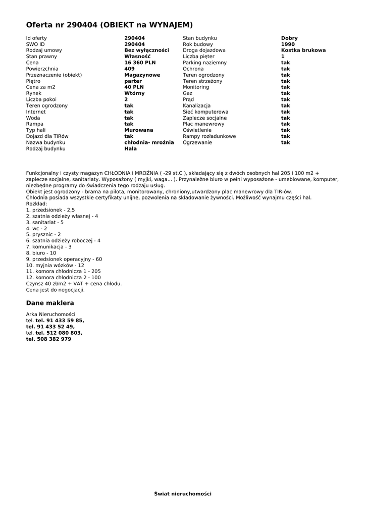 Oferta nr 290404 (OBIEKT na WYNAJEM) Id oferty SWO ID Rodzaj umowy Stan prawny Cena Powierzchnia Przeznaczenie (obiekt) Piętro Cena za m2 Rynek Liczba pokoi Teren ogrodzony Internet Woda Rampa Typ hali Dojazd dla TIRów Nazwa budynku Rodzaj budynku 290404 290404 Bez wyłączności Własność 16 360 PLN 409 Magazynowe parter 40 PLN Wtórny 2 tak tak tak tak Murowana tak chłodnia- mroźnia Hala Stan budynku Rok budowy Droga dojazdowa Liczba pięter Parking naziemny Ochrona Teren ogrodzony Teren strzeżony Monitoring Gaz Prąd Kanalizacja Sieć komputerowa Zaplecze socjalne Plac manewrowy Oświetlenie Rampy rozładunkowe Ogrzewanie Dobry 1990 Kostka brukowa 1 tak tak tak tak tak tak tak tak tak tak tak tak tak tak Funkcjonalny i czysty magazyn CHŁODNIA i MROŹNIA ( -29 st.C ), składający się z dwóch osobnych hal 205 i 100 m2 + zaplecze socjalne, sanitariaty. Wyposażony ( myjki, waga... ). Przynależne biuro w pełni wyposażone - umeblowane, komputer, niezbędne programy do świadczenia tego rodzaju usług. Obiekt jest ogrodzony - brama na pilota, monitorowany, chroniony,utwardzony plac manewrowy dla TIR-ów. Chłodnia posiada wszystkie certyfikaty unijne, pozwolenia na składowanie żywności. Możliwość wynajmu części hal. Rozkład: 1. przedsionek - 2,5 2. szatnia odzieży własnej - 4 3. sanitariat - 5 4. wc - 2 5. prysznic - 2 6. szatnia odzieży roboczej - 4 7. komunikacja - 3 8. biuro - 10 9. przedsionek operacyjny - 60 10. myjnia wózków - 12 11. komora chłodnicza 1 - 205 12. komora chłodnicza 2 - 100 Czynsz 40 zł/m2 + VAT + cena chłodu. Cena jest do negocjacji. Dane maklera Arka Nieruchomości tel. tel. 91 433 59 85, tel. 91 433 52 49, tel. tel. 512 080 803, tel. 508 382 979 Świat nieruchomości Powered by TCPDF (www.tcpdf.org)