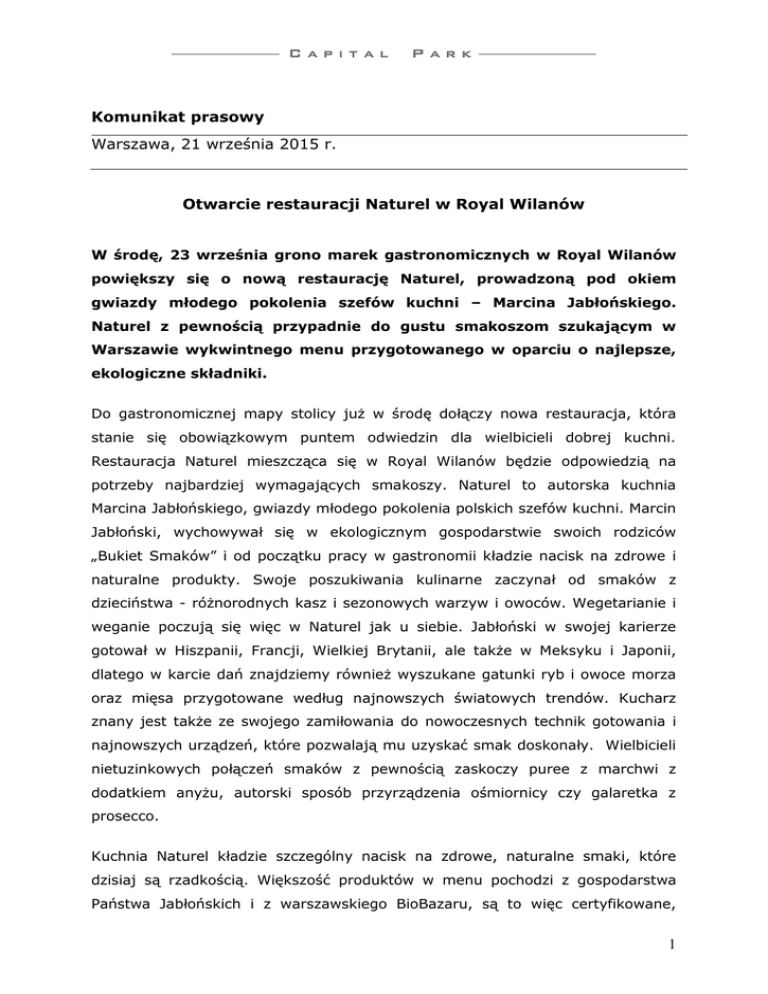 Komunikat prasowy Warszawa, 21 września 2015 r. INFORMACJA PRASOWA Otwarcie restauracji Naturel w Royal Wilanów W środę, 23 września grono marek gastronomicznych w Royal Wilanów powiększy się o nową restaurację Naturel, prowadzoną pod okiem gwiazdy młodego pokolenia szefów kuchni – Marcina Jabłońskiego. Naturel z pewnością przypadnie do gustu smakoszom szukającym w Warszawie wykwintnego menu przygotowanego w oparciu o najlepsze, ekologiczne składniki. Do gastronomicznej mapy stolicy już w środę dołączy nowa restauracja, która stanie się obowiązkowym puntem odwiedzin dla wielbicieli dobrej kuchni. Restauracja Naturel mieszcząca się w Royal Wilanów będzie odpowiedzią na potrzeby najbardziej wymagających smakoszy. Naturel to autorska kuchnia Marcina Jabłońskiego, gwiazdy młodego pokolenia polskich szefów kuchni. Marcin Jabłoński, wychowywał się w ekologicznym gospodarstwie swoich rodziców „Bukiet Smaków” i od początku pracy w gastronomii kładzie nacisk na zdrowe i naturalne produkty. Swoje poszukiwania kulinarne zaczynał od smaków z dzieciństwa - różnorodnych kasz i sezonowych warzyw i owoców. Wegetarianie i weganie poczują się więc w Naturel jak u siebie. Jabłoński w swojej karierze gotował w Hiszpanii, Francji, Wielkiej Brytanii, ale także w Meksyku i Japonii, dlatego w karcie dań znajdziemy również wyszukane gatunki ryb i owoce morza oraz mięsa przygotowane według najnowszych światowych trendów. Kucharz znany jest także ze swojego zamiłowania do nowoczesnych technik gotowania i najnowszych urządzeń, które pozwalają mu uzyskać smak doskonały. Wielbicieli nietuzinkowych połączeń smaków z pewnością zaskoczy puree z marchwi z dodatkiem anyżu, autorski sposób przyrządzenia ośmiornicy czy galaretka z prosecco. Kuchnia Naturel kładzie szczególny nacisk na zdrowe, naturalne smaki, które dzisiaj są rzadkością. Większość produktów w menu pochodzi z gospodarstwa Państwa Jabłońskich i z warszawskiego BioBazaru, są to więc certyfikowane, 1 ekologiczne produkty najwyższej jakości. Kuchnia Naturel jest bardzo zrównoważona, a jednocześnie różnorodna i zdrowa. Marcin Jabłoński jest laureatem 3 edycji programu „Top Chef” oraz jednym z najlepszych szefów kuchni młodego pokolenia w Polsce. Niedawno miał przyjemność gotować na szczycie Unii Europejskiej dla Donalda Tuska, a od teraz będzie gotował dla wszystkich warszawiaków szukających nietuzinkowego menu. Ponadto Marcin gotował także dla wielu gwiazd, m.in. Prezydenta Francji Nicolasa Sarcozi’ego czy znanego rapera 50 Centa. Jabłoński jest laureatem wielu prestiżowych konkursów kulinarnych na świecie, m.in. Bocuse d'Or (Bruksela), Cup George Baptiste (Meksyk), Cup George Baptiste (Tokio) czy Olimpiady Kulinarnej Erfurt (Niemcy). Naturel to także jedna z niewielu restauracji w Warszawie, w której szef kuchni będzie również współwłaścicielem. Naturel będzie kładło szczególny nacisk na świeżość, sezonowość i wysoką jakość produktów. W lokalu o powierzchni 165 mkw. smakosze znajdą więc wszystko, co najlepsze! *** Dodatkowe informacje: Inwestor Grupa Capital Park jest doświadczonym i aktywnym inwestorem i deweloperem działającym na rynku nieruchomości w Polsce od ponad dziesięciu lat, specjalizującym się w wyszukiwaniu i wykorzystywaniu okazji rynkowych (ang. opportunistic investor). Głównym przedmiotem działalności Grupy jest nabywanie nieruchomości ze znacznym potencjałem budowy wartości, np. poprzez zmianę warunków zagospodarowania przestrzennego lub uzyskanie pozwolenia na budowę, budowę nowych lub przebudowę istniejących obiektów, lub poprawę zarządzania istniejącymi budynkami. Capital Park osiąga dochody z najmu oraz ze sprzedaży nieruchomości lub produktów inwestycyjnych opartych na nieruchomościach. Grupa aktywnie poszukuje możliwości zakupu nowych projektów nieruchomościowych oraz nowych źródeł dochodów i wzrostu wartości w obszarach rynku charakteryzujących się dużym potencjałem rozwoju. Od rozpoczęcia działalności w 2003 roku Grupa przeprowadziła ok. 100 transakcji inwestycyjnych i zarządza portfelem nieruchomości obejmującym 75 projektów o łącznej powierzchni wynajmu brutto ok. 250 tys. mkw., zlokalizowanych w 37 miastach. Spośród tych projektów 39 nieruchomości handlowych typu high-street znajduje się w strukturze nowo utworzonego, innowacyjnego na polskim rynku Real Estate Income Assets FIZ AN, którym Grupa aktywnie zarządza i w którym posiada 15-proc. udział. Na dzień 31 grudnia 2014 r. bieżąca wartość portfela nieruchomości zarządzanych przez Grupę wynosiła 1,6 mld zł. Na dzień 31 grudnia 2014 r. 79% bieżącej wartości portfela Grupy stanowiły 2 nieruchomości w Warszawie, czyli na największym i jednym z najbardziej perspektywicznych rynków nieruchomości komercyjnych w Polsce. Biuro prasowe Capital Park Katarzyna Mituła tel. 0 48 22 642 24 16, + 48 783 23 83 83 email: [email protected] 3