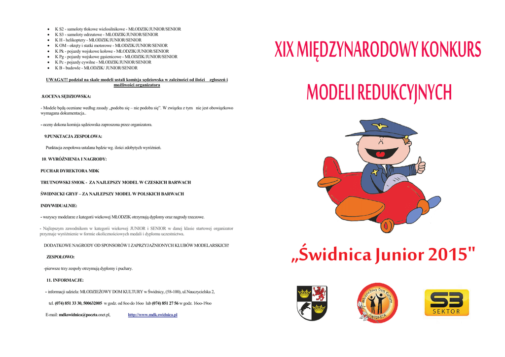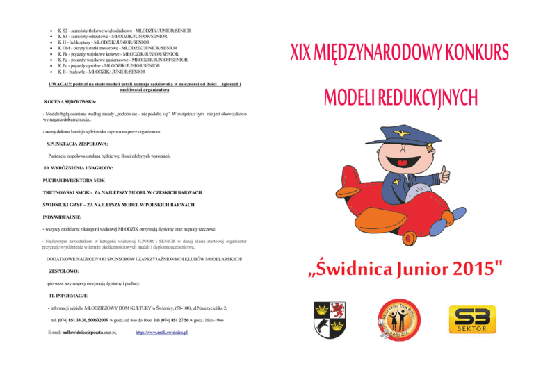 · K S2 - samoloty t³okowe wielosilnikowe - M£ODZIK/JUNIOR/SENIOR · K S3 - samoloty odrzutowe - M£ODZIK/JUNIOR/SENIOR · K H - helikoptery - M£ODZIK/JUNIOR/SENIOR · K OM - okrêty i statki motorowe - M£ODZIK/JUNIOR/SENIOR · K Pk - pojazdy wojskowe ko³owe - M£ODZIK/JUNIOR/SENIOR · K Pg - pojazdy wojskowe g¹sienicowe - M£ODZIK/JUNIOR/SENIOR · K Pc - pojazdy cywilne - M£ODZIK/JUNIOR/SENIOR · K B - budowle - M£ODZIK/ JUNIOR/SENIOR UWAGA!!! podzia³ na skale modeli ustali komisja sêdziowska w zale¿noœci od iloœci mo¿liwoœci organizatora zg³oszeñ i .8.OCENA SÊDZIOWSKA: - Modele bêd¹ oceniane wed³ug zasady „podoba siê – nie podoba siê”. W zwi¹zku z tym nie jest obowi¹zkowo wymagana dokumentacja.. XIX MIÊDZYNARODOWY KONKURS MODELI REDUKCYJNYCH - oceny dokona komisja sêdziowska zaproszona przez organizatora. 9.PUNKTACJA ZESPO£OWA: Punktacja zespo³owa ustalana bêdzie wg. iloœci zdobytych wyró¿nieñ. 10. WYRÓ¯NIENIA I NAGRODY: PUCHAR DYREKTORA MDK TRUTNOWSKI SMOK - ZA NAJLEPSZY MODEL W CZESKICH BARWACH ŒWIDNICKI GRYF – ZA NAJLEPSZY MODEL W POLSKICH BARWACH INDYWIDUALNIE: - wszyscy modelarze z kategorii wiekowej M£ODZIK otrzymuj¹ dyplomy oraz nagrody rzeczowe. - Najlepszym zawodnikom w kategorii wiekowej JUNIOR i SENIOR w danej klasie startowej organizator przyznaje wyró¿nienie w formie okolicznoœciowych medali i dyplomu uczestnictwa. DODATKOWE NAGRODY OD SPONSORÓW I ZAPRZYJA¯NIONYCH KLUBÓW MODELARSKICH! ZESPO£OWO: -pierwsze trzy zespo³y otrzymuj¹ dyplomy i puchary. 11. INFORMACJE: - informacji udziela: M£ODZIE¯OWY DOM KULTURY w Œwidnicy, (58-100), ul.Nauczycielska 2, tel. (074) 851 33 30, 500632005 w godz. od 8oo do 16oo lub (074) 851 27 56 w godz. 16oo-19oo E-mail: [email protected], http://www.mdk.swidnica.pl „Œwidnica Junior 2015" M³odzie¿owy Dom Kultury w Œwidnicy wraz z w³adzami miasta maj¹ zaszczyt zaprosiæ wszystkich modelarzy: m³odzików – juniorów – seniorów z ca³ego kraju i zza granicy na: XIX MIÊDZYNARODOWY KONKURS MODELI REDUKCYJNYCH - w jednej klasie modelarz mo¿e wystawiæ dowoln¹ iloœæ modeli. - konkurs w danej klasie zostanie rozegrany, je¿eli zg³osi siê minimum 5 modelarzy - modele, które w poprzedniej edycji konkursu zajê³y miejsca 1, 2 lub 3 - nie bêd¹ oceniane „ŒWIDNICA - JUNIOR 2015" - w przypadku ma³ej iloœci zawodników w klasie istnieje mo¿liwoœæ ³¹czenia klas i kategorii Wiekowych. 1. ORGANIZATORZY: Organizator zastrzega sobie prawo zmian regulaminowych, je¿eli nast¹pi taka koniecznoœæ. Urz¹d Miejski w Œwidnicy Sudeckim Centrum Wspierania Organizacji Pozarz¹dowych „S3S” M³odzie¿owy Dom Kultury im.Mieczys³awa Kozara - S³obódzkiego w Œwidnicy ul.Nauczycielska 2, 2. MIEJSCE I TERMIN: Konkurs odbywa siê w ramach kontynuacji Programu Operacyjnego Wspó³pracy Transgranicznej Republika Czeska-Rzeczpospolita Polska 2007-2013 5. ZG£OSZENIA DO KONKURSU I PRZYJMOWANIE MODELI: · obecnoœæ modelarzy nie jest obowi¹zkowa, modele mog¹ byæ dostarczone przez osoby upowa¿nione. · modele przyjmowane bêd¹ na podstawie karty zg³oszenia otrzymanej w dniu rozpoczêcia konkursu .(karta do pobrania ze strony internetowej www.mdk.swidnica.pl) · w konkursie mo¿e uczestniczyæ modelarz z dowoln¹ liczb¹ samodzielnie wykonanych modeli w danej klasie startowej. W klasyfikacji koñcowej uwzglêdniony zostanie jedynie najlepszy model zawodnika w danej klasie. · we wszystkich klasach startowych nast¹pi podzia³ na kategorie wiekowe: Konkurs modeli odbêdzie siê w dniach 28-29.03.2015r. w Sudeckim Centrum Wspierania Organizacji Pozarz¹dowych „S3S” w Œwidnicy, ul. D³uga 33 M£ODZIK – DO 13 LAT, JUNIOR- DO 18 LAT, SENIOR-POWY¯EJ 18 LAT Rozpoczêcie konkursu w dniu 28.03.2015r. (sobota). Przyjmowanie modeli od godz. 10.oo do13.oo. Uroczyste zakoñczenie konkursu i rozdanie nagród w dniu 29.03.2015r. od godz.13.oo. Wydawanie modeli (po uroczystym zakoñczeniu) ok. godz.14.oo . 3. CELE WYSTAWY I KONKURSU: · popularyzacja modelarstwa redukcyjnego plastikowego i kartonowego · popularyzacja zainteresowañ technicznych wœród dzieci, m³odzie¿y oraz doros³ych, · poszerzenie krêgu osób zainteresowanych lotnictwem i wiedza techniczn¹, · promowanie aktywnego spêdzania wolnego czasu przez m³odzie¿ i osoby doros³e naszego miasta i regionu . · propagowanie wspó³pracy transgranicznej Republika Czeska-Rzeczpospolita Polska · promowanie walorów historyczno-krajobrazowych naszego miasta 4. POSTANOWIENIA REGULAMINOWE: 6. KLASY STARTOWE I KATEGORIE WIEKOWE – MODELE PLASTIKOWE · S1 samoloty 1:32 i wiêksze - M£ODZIK/JUNIOR/SENIOR · S2 samoloty 1:48 - M£ODZIK/JUNIOR/SENIOR · S3 samoloty 1:72 - M£ODZIK/JUNIOR/SENIOR · S4 samoloty 1:144 - M£ODZIK/ JUNIOR/SENIOR · S5 samoloty cywilne (bez podzia³u na skale) - M£ODZIK/JUNIOR/SENIOR · S6œmig³owce 1:72 - M£ODZIK/JUNIOR/SENIOR · S7 œmig³owce 1:48 i wiêksze -M£ODZIK/ JUNIOR/SENIOR · PG1 pojazdy wojskowe g¹sienicowe 1:87 – 1:72 - M£ODZIK/JUNIOR/SENIOR · PG2 pojazdy wojskowe g¹sienicowe 1:35-1:24, - M£ODZIK/JUNIOR/SENIOR · PK1 pojazdy wojskowe ko³owe 1:87 – 1:72 - M£ODZIK/ JUNIOR/SENIOR · PK2 pojazdy wojskowe ko³owe 1:35-1:24, - M£ODZIK/ JUNIOR/SENIOR · PCO pojazdy cywilne osobowe - M£ODZIK/ JUNIOR/SENIOR · PCC pojazdy cywilne ciê¿arowe lub techniczne - M£ODZIK/JUNIOR/SENIOR · PWR pojazdy wyœcigowe i klasy WRC - M£ODZIK/JUNIOR/SENIOR · DS dioramy lotnicze - M£ODZIK/ JUNIOR/SENIOR · DL dioramy l¹dowe - M£ODZIK/JUNIOR/SENIOR · F1 figurki – wszystkie skale - M£ODZIK/JUNIOR/SENIOR · O1 modele statków i okrêtów – wszystkie skale - M£ODZIK/ JUNIOR/SENIOR · K modele kolejowe-wszystkie skale - M£ODZIK/ JUNIOR/SENIOR - w konkursie mog¹ braæ udzia³ modelarze zrzeszeni i nie zrzeszeni. 7. KLASY STARTOWE I KATEGORIE WIEKOWE – MODELE KARTONOWE · K S1 - samoloty t³okowe jednosilnikowe - M£ODZIK/JUNIOR/SENIOR