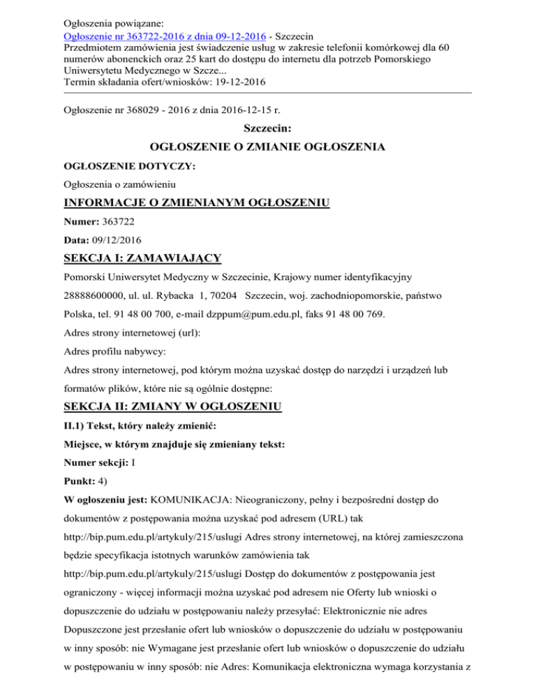 Ogłoszenia powiązane: Ogłoszenie nr 363722-2016 z dnia 09-12-2016 - Szczecin Przedmiotem zamówienia jest świadczenie usług w zakresie telefonii komórkowej dla 60 numerów abonenckich oraz 25 kart do dostępu do internetu dla potrzeb Pomorskiego Uniwersytetu Medycznego w Szcze... Termin składania ofert/wniosków: 19-12-2016 Ogłoszenie nr 368029 - 2016 z dnia 2016-12-15 r. Szczecin: OGŁOSZENIE O ZMIANIE OGŁOSZENIA OGŁOSZENIE DOTYCZY: Ogłoszenia o zamówieniu INFORMACJE O ZMIENIANYM OGŁOSZENIU Numer: 363722 Data: 09/12/2016 SEKCJA I: ZAMAWIAJĄCY Pomorski Uniwersytet Medyczny w Szczecinie, Krajowy numer identyfikacyjny 28888600000, ul. ul. Rybacka 1, 70204 Szczecin, woj. zachodniopomorskie, państwo Polska, tel. 91 48 00 700, e-mail [email protected], faks 91 48 00 769. Adres strony internetowej (url): Adres profilu nabywcy: Adres strony internetowej, pod którym można uzyskać dostęp do narzędzi i urządzeń lub formatów plików, które nie są ogólnie dostępne: SEKCJA II: ZMIANY W OGŁOSZENIU II.1) Tekst, który należy zmienić: Miejsce, w którym znajduje się zmieniany tekst: Numer sekcji: I Punkt: 4) W ogłoszeniu jest: KOMUNIKACJA: Nieograniczony, pełny i bezpośredni dostęp do dokumentów z postępowania można uzyskać pod adresem (URL) tak http://bip.pum.edu.pl/artykuly/215/uslugi Adres strony internetowej, na której zamieszczona będzie specyfikacja istotnych warunków zamówienia tak http://bip.pum.edu.pl/artykuly/215/uslugi Dostęp do dokumentów z postępowania jest ograniczony - więcej informacji można uzyskać pod adresem nie Oferty lub wnioski o dopuszczenie do udziału w postępowaniu należy przesyłać: Elektronicznie nie adres Dopuszczone jest przesłanie ofert lub wniosków o dopuszczenie do udziału w postępowaniu w inny sposób: nie Wymagane jest przesłanie ofert lub wniosków o dopuszczenie do udziału w postępowaniu w inny sposób: nie Adres: Komunikacja elektroniczna wymaga korzystania z narzędzi i urządzeń lub formatów plików, które nie są ogólnie dostępne nie Nieograniczony, pełny, bezpośredni i bezpłatny dostęp do tych narzędzi można uzyskać pod adresem: (URL) W ogłoszeniu powinno być: KOMUNIKACJA: Nieograniczony, pełny i bezpośredni dostęp do dokumentów z postępowania można uzyskać pod adresem (URL) tak http://bip.pum.edu.pl/artykuly/215/uslugi Adres strony internetowej, na której zamieszczona będzie specyfikacja istotnych warunków zamówienia tak http://bip.pum.edu.pl/artykuly/215/uslugi Dostęp do dokumentów z postępowania jest ograniczony - więcej informacji można uzyskać pod adresem nie Oferty lub wnioski o dopuszczenie do udziału w postępowaniu należy przesyłać: Elektronicznie nie adres Dopuszczone jest przesłanie ofert lub wniosków o dopuszczenie do udziału w postępowaniu w inny sposób: -tak Wymagane jest przesłanie ofert lub wniosków o dopuszczenie do udziału w postępowaniu w inny sposób: -tak:w formie pisemnej Adres: PUM w Szczecinie 70-204 Szczecin, ul. Rybacka 1, w Kancelarii Ogólnej PUM (I piętro). Komunikacja elektroniczna wymaga korzystania z narzędzi i urządzeń lub formatów plików, które nie są ogólnie dostępne nie Nieograniczony, pełny, bezpośredni i bezpłatny dostęp do tych narzędzi można uzyskać pod adresem: (URL) Miejsce, w którym znajduje się zmieniany tekst: Numer sekcji: IV Punkt: 6.2) W ogłoszeniu jest: Termin składania ofert lub wniosków o dopuszczenie do udziału w postępowaniu: Data: 19/12/2016, godzina: 10:00, Skrócenie terminu składania wniosków, ze względu na pilną potrzebę udzielenia zamówienia (przetarg nieograniczony, przetarg ograniczony, negocjacje z ogłoszeniem): nie Wskazać powody: Język lub języki, w jakich mogą być sporządzane oferty lub wnioski o dopuszczenie do udziału w postępowaniu > W ogłoszeniu powinno być: Termin składania ofert lub wniosków o dopuszczenie do udziału w postępowaniu: Data: 21/12/2016, godzina: 10:00, Skrócenie terminu składania wniosków, ze względu na pilną potrzebę udzielenia zamówienia (przetarg nieograniczony, przetarg ograniczony, negocjacje z ogłoszeniem): nie Wskazać powody: Język lub języki, w jakich mogą być sporządzane oferty lub wnioski o dopuszczenie do udziału w postępowaniu >