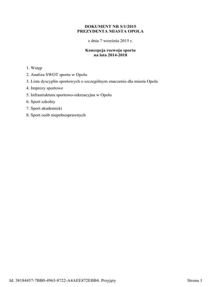 DOKUMENT NR S/1/2015 PREZYDENTA MIASTA OPOLA z dnia 7 września 2015 r. Koncepcja rozwoju sportu na lata 2014-2018 1. Wstęp 2. Analiza SWOT sportu w Opolu 3. Lista dyscyplin sportowych o szczególnym znaczeniu dla miasta Opola 4. Imprezy sportowe 5. Infrastruktura sportowo-rekreacyjna w Opolu 6. Sport szkolny 7. Sport akademicki 8. Sport osób niepełnosprawnych Id: 38184457-7BB0-4965-8722-A4AEE872EBB4. Przyjęty Strona 1 1. Wstęp Miasto Opole ma bogatą historię sportową. W celu kontynuacji zapisów bogatych kart przeszłości, środowisko sportowe Opola wymaga skonkretyzowania działania w kierunku wspierania rozwoju sportu głównie poprzez zbudowanie jasnego centrum decyzyjnego. Stworzenie spójnych struktur do kierowania zadaniami w obszarze sportu, zacieśnienie współpracy jednostek w celu kształtowania spójnej polityki sportowej oraz podejmowanie strategicznych dla miasta decyzji będzie miało istotny wpływ na wyeliminowanie anachronizmów w zarządzaniu i organizacji klubów sportowych. W przeszłości zbyt często zdarzały się przypadki utraty najlepszych opolskich sportowców na rzecz innych Miast, które potrafiły lepiej ich docenić. Miasta Opola nie stać dłużej na takie straty. Obecny stan sportu w Opolu wymaga podjęcia zdecydowanych i konsekwentnych działań. Do realizacji tego celu powołany został przez Prezydenta Miasta Opola Arkadiusza Wiśniewskiego Wydział Sportu, który współpracując z Miejskim Ośrodkiem Sportu i Rekreacji, a także Międzyszkolnym Ośrodkiem Sportowym, rozwija relacje na linii Miasto Opole – organizacje sportowe mające siedzibę w Opolu. Miasto Opole (definiowane, jako wspólnota samorządowa) powinno wspierać rozwój sportu nie może wszakże ponosić odpowiedzialności za osiągane wyniki sportowe wprost. Miasto powinno więc stwarzać takie warunki wsparcia dla sportu, aby organizacje sportowe działające w Opolu miały lepsze warunki szkolenia i dzięki temu zwiększało się prawdopodobieństwo systematycznego odnoszenia znaczących sukcesów sportowych. Jednocześnie w Opolu istnieje potrzeba wykreowania w przestrzeni publicznej strefy sportu i rekreacji, która będzie skomunikowana z istniejącymi obiektami o podobnej funkcji, tworząc za pomocą ścieżek pieszorowerowych sieć sportowo-rekreacyjną miasto. Dla poprawy funkcjonowania opolskiego sportu niezbędne są: - profesjonalizacja organizacji sportowych w Opolu (kluby sportowe, związki sportowe), - koncentracja publicznego finansowania w określonych - mających szczególne znaczenia dla miasta - dyscyplinach sportowych, - uporządkowanie i stworzenie odpowiednich warunków rozwoju systemu szkolenia realizowanego przez organizacje sportowe. Celem władz miasta Opola jest wsparcie strukturalne dla organizacji systemu profesjonalnego sportu w mieście – takiego, aby stwarzał dla biznesu satysfakcjonujący model do sponsorowania lub finansowania organizacji sportowych. Należy przejść do wspierania sportu poprzez określenie misji miasta w dziedzinie sportu i rekreacji oraz celów strategicznych. Efektywność wsparcia zapewni m.in. konsekwentna koncentracja nakładów finansowych i organizacyjnych na wybrane dyscypliny sportowe, kierując się zasadą największych korzyści społecznych z zainwestowanych środków. Strategiczne cele władz miasta Opola w obszarze sportu: - modernizacja bazy sportowo-rekreacyjnej oraz komercjalizacja kluczowych obiektów sportowych, - zwiększenie ilości osób czynnie uprawiających sport jak i osób uczestniczących w wydarzeniach sportowych, - wspieranie profesjonalizacji organizacji sportowych (wspieranie finansowe, pomoc w poszukiwaniu sponsorów, doradztwo, synergia marketingowa z promocją marki Opole), - budowa piramid szkolenia w kluczowych i uzupełniających dyscyplinach sportowych. Id: 38184457-7BB0-4965-8722-A4AEE872EBB4. Przyjęty Strona 2 Przedmiotowy dokument określa główne zadania władz miasta w zakresie wspierania rozwoju sportu w Opolu realizowane poprzez odpowiednie wydziały Urzędu Miasta Opola, Miejski Ośrodek Sportu i Rekreacji oraz Międzyszkolny Ośrodek Sportowy. 2. Analiza SWOT sportu w Opolu Diagnoza strategiczna SWOT określa silne i słabe strony sportu w Opolu oraz szanse i zagrożenia płynące z otoczenia dla sportu. Słabe strony : 1. Brak spójnej wieloletniej strategii Opola dotyczącej sportu i rozbudowy bazy sportowej (przy zbyt małym budżecie przez lata starano się „obdarować” publicznymi pieniędzmi „wszystkich” zamiast wzmacniać silne „marki” sportowe). 2. Krótkookresowa obecność klubów sportowych w najwyższych klasach rozgrywkowych. 3. Niestabilność finansów organizacji sportowych (niskie budżety organizacji, problemy z płynnością finansową, mała skuteczność w pozyskiwaniu sponsorów). 4. Marginalny udział partnerów biznesowych w rozwoju opolskiego sportu. Silne strony : 1. Kilka uznanych „marek” sportowych w skali ogólnopolskiej. 2. Znaczące sukcesy sportowe indywidualnych sportowców. 3. Renomowana uczelnia sportowa - Politechnika Opolska - Wydział Wychowania Fizycznego i Fizjoterapii. 4. Bogata historia opolskiego sportu zarówno w dyscyplinach indywidualnych, jak i grach zespołowych. 5. Ośrodek Szkolenia Sportowego Młodzieży przy Klubie Sportowym „Budowlani”. Szanse : 1. Uporządkowanie szkolenia sportowego na poziomie szkolnym. 2. Środki finansowe z Ministerstwa Sportu i Turystyki oraz UE przeznaczone na finansowanie rozbudowy infrastruktury sportowej. 3. Zwiększenie skoncentrowanego na kilku dyscyplinach sportowych współfinansowania ze środków budżetu Miasta Opola. 4. Możliwość organizacji profesjonalnego systemu szkolenia sportowego. 5. Potencjał organizacyjny i kompetencyjny Uniwersytetu Opolskiego, Wyższej Szkoły Zarządzania i Administracji, Państwowej Medycznej Wyższej Szkoły Zawodowej. Zagrożenia : 1. Nietrwałe związki biznesu z organizacjami sportowymi. 2. Opór różnych grup interesu przed