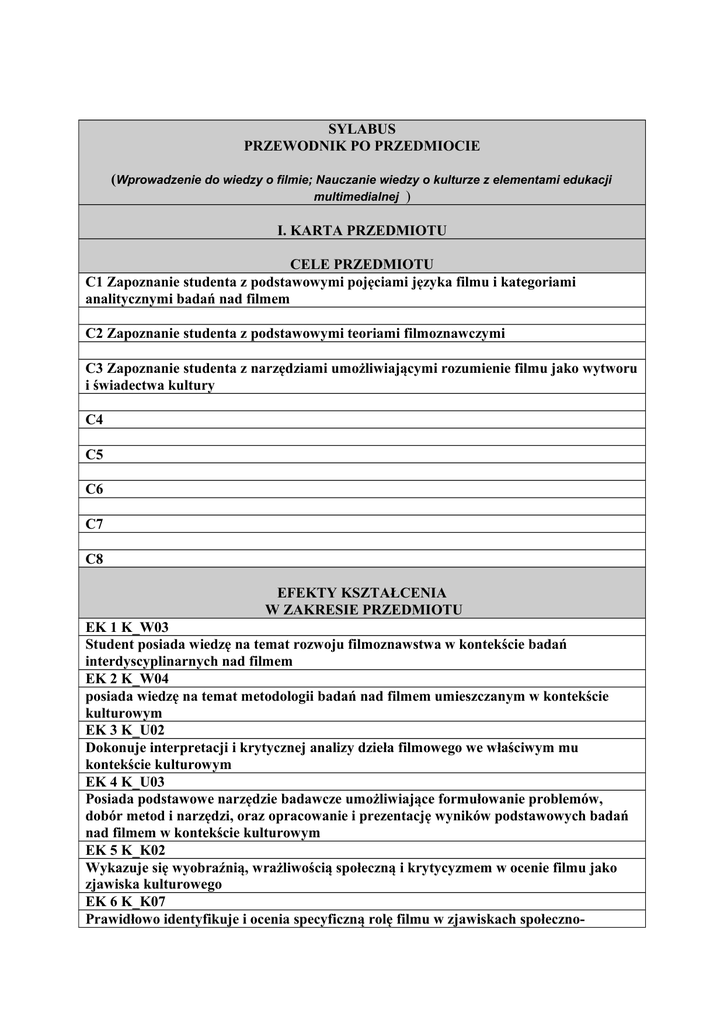 SYLABUS PRZEWODNIK PO PRZEDMIOCIE (Wprowadzenie do wiedzy o filmie; Nauczanie wiedzy o kulturze z elementami edukacji multimedialnej ) I. KARTA PRZEDMIOTU CELE PRZEDMIOTU C1 Zapoznanie studenta z podstawowymi pojęciami języka filmu i kategoriami analitycznymi badań nad filmem C2 Zapoznanie studenta z podstawowymi teoriami filmoznawczymi C3 Zapoznanie studenta z narzędziami umożliwiającymi rozumienie filmu jako wytworu i świadectwa kultury C4 C5 C6 C7 C8 EFEKTY KSZTAŁCENIA W ZAKRESIE PRZEDMIOTU EK 1 K_W03 Student posiada wiedzę na temat rozwoju filmoznawstwa w kontekście badań interdyscyplinarnych nad filmem EK 2 K_W04 posiada wiedzę na temat metodologii badań nad filmem umieszczanym w kontekście kulturowym EK 3 K_U02 Dokonuje interpretacji i krytycznej analizy dzieła filmowego we właściwym mu kontekście kulturowym EK 4 K_U03 Posiada podstawowe narzędzie badawcze umożliwiające formułowanie problemów, dobór metod i narzędzi, oraz opracowanie i prezentację wyników podstawowych badań nad filmem w kontekście kulturowym EK 5 K_K02 Wykazuje się wyobraźnią, wrażliwością społeczną i krytycyzmem w ocenie filmu jako zjawiska kulturowego EK 6 K_K07 Prawidłowo identyfikuje i ocenia specyficzną rolę filmu w zjawiskach społeczno- kulturowych w których uczestniczy, w tym jego kontekst obyczajowy EK 7 EK 8 EK 9 EK 10 TREŚCI PROGRAMOWE FORMA ZAJĘĆWYKŁADY W1 Wprowadzenie do przedmiotu W2 kształtowanie języka filmowego W 3 Montaż , przestrzeń i czas filmowy W 4 Gatunki filmowe wprowadzenie liczba godzin liczba godzin FORMA ZAJĘĆ-ĆWICZENIA 1 1 2 1 C1 Autor filmowy: Twórczość Orsona Wellesa C2 Analiza filmu Obywatel Kane C3 Gatunek filmowy jako artefakt kultury C4 Analiza strategii autorskich w filmie 2 4 2 2 FORMA ZAJĘĆ LABORATORIUM liczba godzin WYMAGANIA NA OCENY DOSTATECZNY kolokwium zaliczone na ocenę przynajmniej dostateczną, praca pisemna zaliczona przynajmniej na ocenę dostateczną DOBRY kolokwium zaliczone na ocenę przynajmniej dobrą, praca pisemna zaliczona przynajmniej na ocenę dobrą BARDZO DOBRY kolokwium zaliczone na ocenę przynajmniej bardzo dobrą, praca pisemna zaliczona przynajmniej na ocenę bardzo dobrą NARZĘDZIA DYDAKTYCZNE 1. Wykłady 2. Praca pisemna 3. Praca grupowa z przedstawionym materiałem filmowym 4. 5. 6. 7. 8. SPOSOBY OCENY (F-FORMUJĄCA, P-PODSUMOWUJĄCA F1 Ocena aktywności i przygotowania studenta do części ćwiczeniowej F2 F…. P1 Ocena pisemnej pracy analitycznej P2 Ocena kolokwium egzaminującego wiedzę z wykładów i zadanej literatury P…. OBCIĄŻENIE PRACĄ STUDENTA Formy aktywności 1. Godziny kontaktowe z nauczycielem 2. Czytanie wskazanej literatury 3. Przygotowanie się studenta do egzaminu 4. Przygotowanie się do zaliczenia na ocenę 5. Przygotowanie projektu 6. Przygotowanie prezentacji 7. Napisanie pracy portfolio 8. Napisanie pracy dyplomowej 9. Przygotowanie do sprawdzenia umiejętności praktycznych 10. Przygotowanie do zajęć laboratoryjnych 11. Przygotowanie do zajęć praktycznych Średnia liczba godzin na zrealizowanie aktywności 15 10 30 20 SUMA GODZIN 75 LICZBA PUNKTÓW ECTS 3 LITERATURA PODSTAWOWA I UZUPEŁNIAJĄCA 1. David Bordwell, Kristin Thompson, Film Art. Sztuka filmowa. Wprowadzenie, Warszawa 2010. 2. Alicja Helman, Andrzej Pitrus, Podstawy wiedzy o filmie, Gdańsk 2008. 3. Alicja Helman, Jacek Ostaszewski, Historia myśli filmowej. Podręcznik, Gdańsk 2011. 4. Konrad Klejsa, Ewelina Nurczyńska-Fidelska, Piotr Sitarski, Tomasz Kłys, Kino bez tajemnic, Warszawa 2009. PROWADZĄCY PRZEDMIOT (IMIĘ, NAZWISKO, ADRES E-MAIL, TELEFON) Przemysła Dudziński, [email protected] tel. 728942718 http://weirdhumanities.pl/dla-studentow/ Efekty kształcenia Odniesienie danego efektu do efektów zdefiniowanych dla kierunku studiów podyplomowych K_W03 Cele przedmiotu C1, C2, C3 W1,W2, W3, W4 1 P2 EK2 K_W04 C1, C2, C3 1 P2 EK3 K_U02 C1, C2, C3 2, 3 F1, P1 EK4 K_U03 C1, C2, C3 2, 3 F1, P1 EK5 K_K02 C3 2, 3 F1, P1 EK6 K_K07 C3 W1,W2, W3, W4 C1, C2, C3, C4 C1, C2, C3, C4 C1, C2, C3, C4 C1, C2, C3, C4 2, 3 F1, P1 EK1 Treści Narzędzia programowe dydaktyczne Sposób oceny