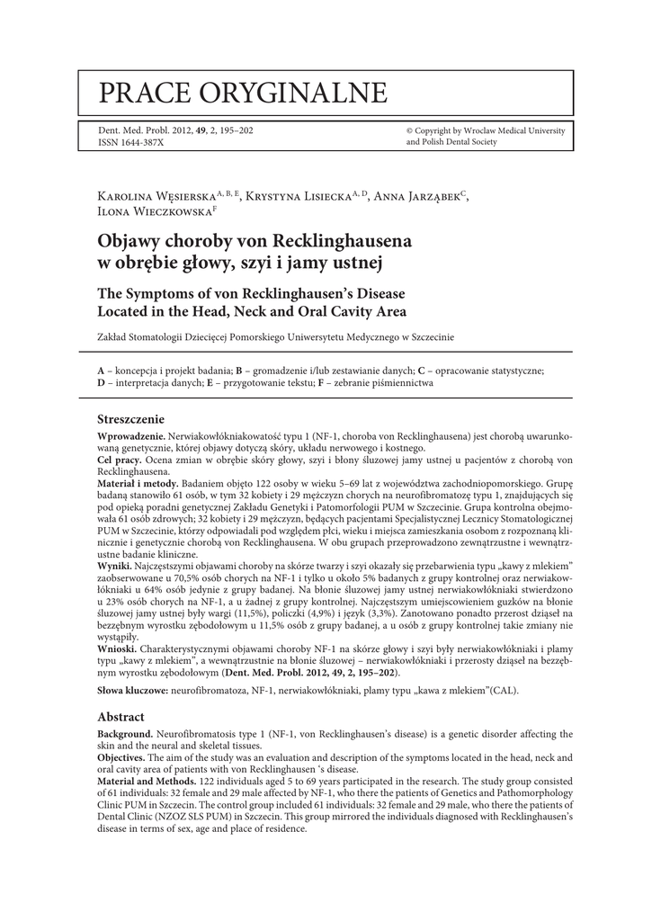 Prace oryginalne Dent. Med. Probl. 2012, 49, 2, 195–202 ISSN 1644-387X © Copyright by Wroclaw Medical University and Polish Dental Society Karolina WęsierskaA, B, E, Krystyna LisieckaA, D, Anna JarząbekC, Ilona WieczkowskaF Objawy choroby von Recklinghausena w obrębie głowy, szyi i jamy ustnej The Symptoms of von Recklinghausen’s Disease Located in the Head, Neck and Oral Cavity Area Zakład Stomatologii Dziecięcej Pomorskiego Uniwersytetu Medycznego w Szczecinie A – koncepcja i projekt badania; B – gromadzenie i/lub zestawianie danych; C – opracowanie statystyczne; D – interpretacja danych; E – przygotowanie tekstu; F – zebranie piśmiennictwa Streszczenie Wprowadzenie. Nerwiakowłókniakowatość typu 1 (NF-1, choroba von Recklinghausena) jest chorobą uwarunkowaną genetycznie, której objawy dotyczą skóry, układu nerwowego i kostnego. Cel pracy. Ocena zmian w obrębie skóry głowy, szyi i błony śluzowej jamy ustnej u pacjentów z chorobą von Recklinghausena. Materiał i metody. Badaniem objęto 122 osoby w wieku 5–69 lat z województwa zachodniopomorskiego. Grupę badaną stanowiło 61 osób, w tym 32 kobiety i 29 mężczyzn chorych na neurofibromatozę typu 1, znajdujących się pod opieką poradni genetycznej Zakładu Genetyki i Patomorfologii PUM w Szczecinie. Grupa kontrolna obejmowała 61 osób zdrowych; 32 kobiety i 29 mężczyzn, będących pacjentami Specjalistycznej Lecznicy Stomatologicznej PUM w Szczecinie, którzy odpowiadali pod względem płci, wieku i miejsca zamieszkania osobom z rozpoznaną klinicznie i genetycznie chorobą von Recklinghausena. W obu grupach przeprowadzono zewnątrzustne i wewnątrzustne badanie kliniczne. Wyniki. Najczęstszymi objawami choroby na skórze twarzy i szyi okazały się przebarwienia typu „kawy z mlekiem” zaobserwowane u 70,5% osób chorych na NF-1 i tylko u około 5% badanych z grupy kontrolnej oraz nerwiakowłókniaki u 64% osób jedynie z grupy badanej. Na błonie śluzowej jamy ustnej nerwiakowłókniaki stwierdzono u 23% osób chorych na NF-1, a u żadnej z grupy kontrolnej. Najczęstszym umiejscowieniem guzków na błonie śluzowej jamy ustnej były wargi (11,5%), policzki (4,9%) i język (3,3%). Zanotowano ponadto przerost dziąseł na bezzębnym wyrostku zębodołowym u 11,5% osób z grupy badanej, a u osób z grupy kontrolnej takie zmiany nie wystąpiły. Wnioski. Charakterystycznymi objawami choroby NF-1 na skórze głowy i szyi były nerwiakowłókniaki i plamy typu „kawy z mlekiem”, a wewnątrzustnie na błonie śluzowej – nerwiakowłókniaki i przerosty dziąseł na bezzębnym wyrostku zębodołowym (Dent. Med. Probl. 2012, 49, 2, 195–202). Słowa kluczowe: neurofibromatoza, NF-1, nerwiakowłókniaki, plamy typu „kawa z mlekiem”(CAL). Abstract Background. Neurofibromatosis type 1 (NF-1, von Recklinghausen’s disease) is a genetic disorder affecting the skin and the neural and skeletal tissues. Objectives. The aim of the study was an evaluation and description of the symptoms located in the head, neck and oral cavity area of patients with von Recklinghausen ‘s disease. Material and Methods. 122 individuals aged 5 to 69 years participated in the research. The study group consisted of 61 individuals: 32 female and 29 male affected by NF-1, who there the patients of Genetics and Pathomorphology Clinic PUM in Szczecin. The control group included 61 individuals: 32 female and 29 male, who there the patients of Dental Clinic (NZOZ SLS PUM) in Szczecin. This group mirrored the individuals diagnosed with Recklinghausen’s disease in terms of sex, age and place of residence. 196 K. Węsierska el al. Results. The most common symptoms of the disease on face and neck skin areas were “cafe au lait” spots, observed in 70.5% of people suffering from NF-1 and only in 5% of those examined in the control group, as well as neurofibroma which was diagnosed in 64% individuals of the study group. Neurofibroma located on mucous membrane of oral cavity was detected in 23% of patients with NF-1, and was not detected in the control group at all. Most common location of nodules on mucous membrane of oral cavity were lips (11.5%), cheeks (4.9%) and tongue (3.3%). Finally, gum overgrowth on toothless alveoral ridge was detected in 11.5% of people from the study group. Conclusions. The most common characteristics of NF-1 disease, situated in the head and neck area, are “café au lait” spots and neurofibromas, whereas within the oral cavity neurofibromas as well as gum overgrowth on toothless alveolar ridges are typically present on mucus membrane (Dent. Med. Probl. 2012, 49, 2, 195–202). Key words: neurofibrofibromatosis, NF-1, neurofibromas, café au lait spots (CAL). Nerwiakowłókniakowatość typu 1 (NF-1, choroba von Recklinghausena) jest chorobą zaliczaną do grupy fakomatoz, od greckiego słowa ‘phakos’, oznaczającego „naznaczony przy urodzeniu”. W skład tej grupy wchodzą różne schorzenia, obejmujące równocześnie wszystkie listki zarodkowe. Symptomatologia NF-1 jest złożona i charakteryzuje się obecnością licznych plam, guzków na skórze i błonach śluzowych, zmian patologicznych w obrębie układu nerwowego i narządu wzroku. NF-1 jest chorobą uwarunkowaną genetycznie, dziedziczoną w sposób autosomalny dominujący. Charakteryzuje się pełną penetracją, a ekspresja poszczególnych objawów jest indywidualnie zmienna, także u członków tej samej obciążonej rodziny [1–3]. Występowanie choroby von Recklinghausena szacuje się na ok. 1 na 2 500–3 000 osób światowej populacji, niezależnie od grupy etnicznej, rasy i płci [3–7]. W 50% przypadków pojawienie się choroby jest wynikiem dziedziczenia mutacji po rodzicu, druga połowa natomiast to skutek spontanicznej, nowej mutacji [3, 8]. Gen NF-1 wykazuje znaczne rozmiary, ok. 350 kpz, i składa się z 60 kodujących białko eksonów. Przyczyną neurofibromatozy mogą być różnorodne jego mutacje. 