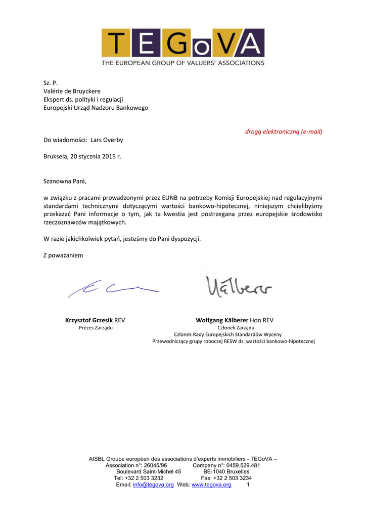 Sz. P. Valérie de Bruyckere Ekspert ds. polityki i regulacji Europejski Urząd Nadzoru Bankowego drogą elektroniczną (e-mail) Do wiadomości: Lars Overby Bruksela, 20 stycznia 2015 r. Szanowna Pani, w związku z pracami prowadzonymi przez EUNB na potrzeby Komisji Europejskiej nad regulacyjnymi standardami technicznymi dotyczącymi wartości bankowo-hipotecznej, niniejszym chcielibyśmy przekazać Pani informacje o tym, jak ta kwestia jest postrzegana przez europejskie środowisko rzeczoznawców majątkowych. W razie jakichkolwiek pytań, jesteśmy do Pani dyspozycji. Z poważaniem Krzysztof Grzesik REV Wolfgang Kälberer Hon REV Prezes Zarządu Członek Zarządu Członek Rady Europejskich Standardów Wyceny Przewodniczący grupy roboczej RESW ds. wartości bankowo-hipotecznej AISBL Groupe européen des associations d’experts immobiliers - TEGoVA – Association n°: 26045/96 Company n°: 0459.529.481 Boulevard Saint-Michel 45 BE-1040 Bruxelles Tel: +32 2 503 3232 Fax: +32 2 503 3234 Email: [email protected] Web: www.tegova.org 1 Stanowisko TEGoVA dotyczące przyszłych konsultacji EUNB oraz regulacyjnych standardów technicznych dotyczących wartości bankowo-hipotecznej 20 stycznia 2015 r. Podsumowanie rekomendacji Rozporządzenie w sprawie wymogów kapitałowych (CRR) zobowiązuje Europejski Urząd Nadzoru Bankowego do przygotowania wstępnej wersji regulacyjnych standardów technicznych, aby określić: „surowe kryteria oceny wartości bankowo-hipotecznej…” Wartość ta jest definiowana w następujący sposób: „bankowo-hipoteczna wartość nieruchomości” oznacza wartość nieruchomości określoną w drodze ostrożnej oceny przyszłej zbywalności nieruchomości przy uwzględnieniu długoterminowych cech nieruchomości, normalnych warunków rynkowych i warunków na rynku lokalnym, obecnego użytkowania oraz odpowiednich alternatywnych możliwości użytkowania nieruchomości; Tym samym pojawia się niepowtarzalna okazja do zmiany wartości bankowo-hipotecznej ze zwykłego narzędzia analitycznego w uznany rodzaj wartości nieruchomości, który w hierarchii wyceny stanąłby obok wartości rynkowej. Chcemy podkreślić, że należy zapewnić wystarczająco elastyczne podejście, aby europejskie zasady dotyczące wartości bankowo-hipotecznej mogły być dostosowywane do różnych krajowych systemów finansowania kredytów hipotecznych oraz rynków nieruchomości państw członkowskich. Jeśli regulacyjne standardy techniczne będą przewidywać elastyczność, uwzględniającą w odpowiednim stopniu narodowe i/lub nawet lokalne warunki rynkowe, ułatwi to znacznie wcielenie całej koncepcji w życie. Regulacje nakładają na niezależnych i wykwalifikowanych rzeczoznawców majątkowych obowiązek rygorystycznego przestrzegania wyznaczonej metodologii, ale nie powinna ona obejmować kwestii wyznaczania minimalnej czy maksymalnej liczby czy zakresu korekt aktualizacyjnych albo danych wejściowych wycen. To zagadnienie powinno pozostać w gestii wykwalifikowanego rzeczoznawcy. Dzieje się tak dlatego, że odpowiedni zakres danych wejściowych i korekt aktualizacyjnych wyceny będzie nieuchronnie różnił się w zależności od kraju, którego dotyczą, a różnice będą pojawiać się nawet w ramach jednego kraju, a także między różnymi sektorami rynku nieruchomości lub nawet w ramach jednego sektora. W związku z tym, zakresy te mogą zostać właściwie i trafnie ustanowione tylko przez doświadczonego i odpowiednio wyszkolonego rzeczoznawcę w oparciu o dogłębną analizę lokalnego rynku nieruchomości. Chociaż regulacje mogą zalecać korzystanie z uznanych metod wyceny (porównawczej, dochodowej i kosztowej), to rzeczoznawcy powinno się pozostawić wybór metody, która najlepiej odpowiada danemu przypadkowi. Zasadniczo wybór będzie zależał od charakteru i rodzaju nieruchomości, rynku, na którym ta nieruchomość funkcjonuje, a także dostępnych wskazówek sugerujących, która z metod będzie najwłaściwsza (porównawcza, oparta o przychody, czy może obie naraz). Biorąc pod uwagę AISBL Groupe européen des associations d’experts immobiliers - TEGoVA - 2 różnorodność potencjalnych nieruchomości i okoliczności, standardy muszą być na tyle elastyczne, aby rzeczoznawca majątkowy dokonujący wyceny miał nadal możliwość samodzielnego wyboru metody wyceny. Aby zapewnić profesjonalizm i spójność wycen nieruchomości w Europie, wszelkie regulacje dotyczące wartości bankowo-hipotecznej powinny zastrzegać, że rzeczoznawcy majątkowi powinni być wykwalifikowani i niezależni, zgodnie z Europejskimi Standardami Wyceny. Numer identyfikacyjny TEGoVA w rejestrze grup interesu Komisji Europejskiej: 070444714545-60 Informacje na temat grupy TEGoVA Europejska Grupa Stowarzyszeń Rzeczoznawców Majątkowych (TEGoVA) to europejska organizacja zrzeszająca 60 krajowych stowarzyszeń wyceny lub firm zajmujących się wyceną z 33 krajów i reprezentująca 70 000 rzeczoznawców majątkowych, od osób prowadzących własną jednoosobową działalność gospodarczą po osoby pracujące na rzecz firmy udzielających porad dotyczących nieruchomości, firm z sektora prywatnego i publicznego, funduszy inwestycyjnych, banków i instytucji rządowych. Grupa wyznacza europejskie standardy w zakresie praktyki wyceny nieruchomości, kształcenia, kwalifikacji zawodowych rzeczoznawców i etyki za pomocą takich narzędzi jak Europejskie Standardy Wyceny (EVS), minimalne wymagania edukacyjne, a także tytuł uznania zawodowego REV. Grupa TEGoVA przygotowała także dla rzeczoznawców podręcznik pod tytułem „Europejskie ratingi nieruchomości i rynków”, przedstawiający ustandaryzowaną procedurę, demonstrującą zrównoważony charakter nieruchomości na odpowiednim dla niej rynku. www.tegova.org Regulacyjny standard techniczny dotyczący wartości bankowo-hipotecznej powinien być elastyczny1 Stwierdzamy, że zgodnie z artykułem 124(4) rozporzą
