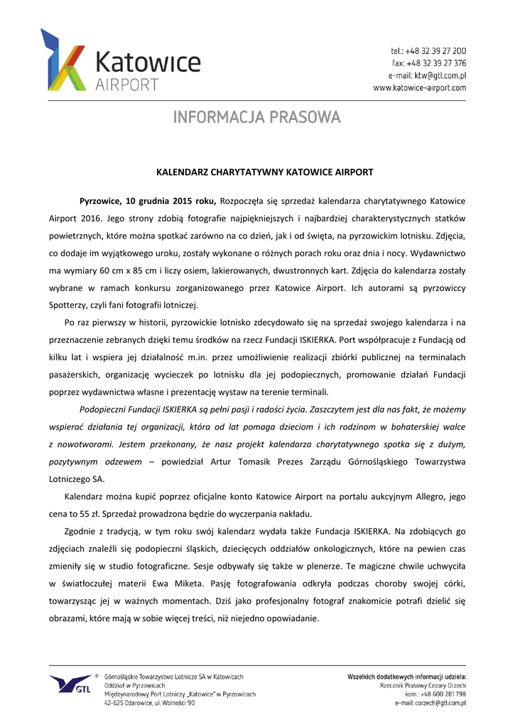 KALENDARZ CHARYTATYWNY KATOWICE AIRPORT Pyrzowice, 10 grudnia 2015 roku, Rozpoczęła się sprzedaż kalendarza charytatywnego Katowice Airport 2016. Jego strony zdobią fotografie najpiękniejszych i najbardziej charakterystycznych statków powietrznych, które można spotkać zarówno na co dzień, jak i od święta, na pyrzowickim lotnisku. Zdjęcia, co dodaje im wyjątkowego uroku, zostały wykonane o różnych porach roku oraz dnia i nocy. Wydawnictwo ma wymiary 60 cm x 85 cm i liczy osiem, lakierowanych, dwustronnych kart. Zdjęcia do kalendarza zostały wybrane w ramach konkursu zorganizowanego przez Katowice Airport. Ich autorami są pyrzowiccy Spotterzy, czyli fani fotografii lotniczej. Po raz pierwszy w historii, pyrzowickie lotnisko zdecydowało się na sprzedaż swojego kalendarza i na przeznaczenie zebranych dzięki temu środków na rzecz Fundacji ISKIERKA. Port współpracuje z Fundacją od kilku lat i wspiera jej działalność m.in. przez umożliwienie realizacji zbiórki publicznej na terminalach pasażerskich, organizację wycieczek po lotnisku dla jej podopiecznych, promowanie działań Fundacji poprzez wydawnictwa własne i prezentację wystaw na terenie terminali. Podopieczni Fundacji ISKIERKA są pełni pasji i radości życia. Zaszczytem jest dla nas fakt, że możemy wspierać działania tej organizacji, która od lat pomaga dzieciom i ich rodzinom w bohaterskiej walce z nowotworami. Jestem przekonany, że nasz projekt kalendarza charytatywnego spotka się z dużym, pozytywnym odzewem – powiedział Artur Tomasik Prezes Zarządu Górnośląskiego Towarzystwa Lotniczego SA. Kalendarz można kupić poprzez oficjalne konto Katowice Airport na portalu aukcyjnym Allegro, jego cena to 55 zł. Sprzedaż prowadzona będzie do wyczerpania nakładu. Zgodnie z tradycją, w tym roku swój kalendarz wydała także Fundacja ISKIERKA. Na zdobiących go zdjęciach znaleźli się podopieczni śląskich, dziecięcych oddziałów onkologicznych, które na pewien czas zmieniły się w studio fotograficzne. Sesje odbywały się także w plenerze. Te magiczne chwile uchwyciła w światłoczułej materii Ewa Miketa. Pasję fotografowania odkryła podczas choroby swojej córki, towarzysząc jej w ważnych momentach. Dziś jako profesjonalny fotograf znakomicie potrafi dzielić się obrazami, które mają w sobie więcej treści, niż niejedno opowiadanie. Różne formy współpracy z biznesem pozwalają czerpać z wzajemnych doświadczeń i kompetencji. Uczą mądrego pomagania, które przekłada się na konkretną pomoc potrzebującym. Jestem przekonana, że kiedy cel jest wspólny, zawsze można się spotkać w pół drogi. W tej akcji, chore dzieci i miłośników lotnictwa połączyła wyobraźnia, podążanie za pasją i radość życia. Pozornie odległe światy, ale cel wspólny. Dochód ze sprzedaży obu wydawnictw przeznaczymy bowiem na zakup sprzętu medycznego dla śląskich ośrodków onkologicznych, w których na co dzień walczą o zdrowie nasi mali marzyciele – powiedziała Jolanta Czernicka-Siwecka, Prezes Fundacji ISKIERKA Kalendarz można kupić na stronie Fundacji ISKIERKA pod adresem http://fundacjaiskierka.pl/jakpomoc/sklep/ O Fundacji ISKIERKA Od 2006 roku zajmuje się budowaniem systemów wsparcia dla dzieci z chorobą nowotworową i ich rodzin. Zespół pracowników wspierają w działaniach wolontariusze oraz partnerzy ze środowisk biznesowych, samorządowych, a także osoby ze świata nauki, sportu, sztuki, kultury i show biznesu. To ponad 500 podopiecznych fundacji (w trakcie i po leczeniu onkologicznym) i systemowe działanie. Od zakupu leków poprzez remonty dziecięcych oddziałów szpitalnych, po szkolenia dla lekarzy czy wspieranie badań naukowych /www.fundacjaiskierka.pl/ O Katowice Airport Katowice Airport jest jednym z największych lotnisk w Polsce. W 2014 roku na pyrzowickim lotnisku zostało odprawionych prawie 2,7 mln podróżnych. Port jest liderem w zakresie obsługi ruchu czarterowego i cargo wśród polskich portów regionalnych. W roku 2015 na lotnisku obsłużonych zostanie ponad 3 mln pasażerów w ruchu całkowitym, w tym ponad 1 mln w ruchu wakacyjnym. W szczycie sezonu z Katowice Airport dostępnych jest prawie 100 kierunków regularnych i czarterowych.