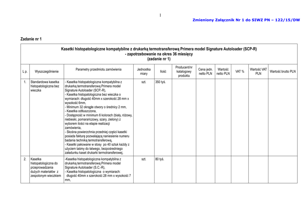 1 Zmieniony Załącznik Nr 1 do SIWZ PN – 122/15/DW Zadanie nr 1 Kasetki histopatologiczne kompatybilne z drukarką termotransferową Primera model Signature Autoloader (SCP-R) - zapotrzebowanie na okres 36 miesięcy (zadanie nr 1) L p. Wyszczególnienie Parametry przedmiotu zamówienia Jednostka miary Ilość 1. Standardowa kasetka histopatologiczna bez wieczka - Kasetka histopatologiczna kompatybilna z drukarką termotransferową Primera model Signature Autoloader (SCP.-R), - Kasetka histopatologiczna bez wieczka o wymiarach: długość 40mm x szerokość 28 mm x wysokość 6mm, - Minimum 32 okrągłe otwory o średnicy 2 mm, - Kasetka odtłuszczona, - Dostępność w minimum 6 kolorach (biały, różowy, niebieski, pomarańczowy, szary, zielony) z wyborem ilości na etapie realizacji zamówienia, - Skośna powierzchnia przedniej części kasetki posiada fakturę pozwalającą naniesienie numeru badania techniką termotransferową, - Kasetki pakowane w stosy po 40 sztuk każdy z użyciem taśmy do łatwego, bezpośredniego załadunku kaset drukarki termotransferowej, szt. 350 tyś. 2. Kasetka histopatologiczna do przeprowadzania dużych materiałów z zespolonym wieczkiem -Kasetka histopatologiczna kompatybilna z drukarką termotransferową Primera model Signature Autoloader (S.C.-R), - Kasetka histopatologiczna o wymiarach: długość 40mm x szerokość 28 mm x wysokość 7 mm, szt. 80 tyś. Producent/nr katalogowy produktu Cena jedn. netto PLN Wartość netto PLN VAT % Wartość VAT Wartość brutto PLN PLN 2 Zmieniony Załącznik Nr 1 do SIWZ PN – 122/15/DW - Na wieczku oraz podstawie min. 62 duże prostokątne otwory o wymiarach 1 x 5 mm, - Kasetka odtłuszczona, - Dostępność w minimum 6 kolorach (biały, różowy, niebieski, pomarańczowy, szary, zielony) z wyborem ilości na etapie realizacji zamówienia, - Skośna powierzchnia przedniej części kasetki posiada fakturę pozwalającą naniesienie numeru badania techniką termotransferową, - Kasetki pakowane w stosy po 40 sztuk każdy z użyciem taśmy do łatwego, bezpośredniego załadunku kaset drukarki termotransferowej, 3. Kasetka histopatologiczna do przeprowadzania małych materiałów z zespolonym wieczkiem -Kasetka histopatologiczna kompatybilna z drukarką termotransferową Primera model Signature Autoloader (S.C.-R), - Kasetka histopatologiczna o wymiarach: długość 40mm x szerokość 28 mmmx wysokość 7mm, - Na wieczku oraz podstawie małe otwory o wymiarach 1 x 1 mm, - Kasetka odtłuszczona, - Dostępność w minimum 6 kolorach (biały, różowy, niebieski, pomarańczowy, szary) z wyborem ilości na etapie realizacji zamówienia, - Skośna powierzchnia przedniej części kasetki posiada fakturę pozwalającą naniesienie numeru badania techniką termotransferową, - Kasetki pakowane w stosy po 40 sztuk każdy z użyciem taśmy do łatwego, bezpośredniego załadunku kaset drukarki termotransferowej, szt. 130 tyś. 4 Gąbka biopsyjna zabezpieczająca biopsję w kasetce histopatologicznej - wymiary: 2,5x3 cm (długość x szerokość) - grubość: 1 mm - odporna na działanie czynników chemicznych oraz temperatury do 65°C - jednorazowego użytku szt. 120 tyś. 3 Zmieniony Załącznik Nr 1 do SIWZ PN – 122/15/DW - kolor niebieski RAZEM xxxxx Zamawiający wymaga kasetek histopatologicznych kompatybilnych z posiadaną przez Zamawiającego drukarką termotransferową Primera model Signature Autoloader (SCP-R). Wartość ogółem netto: ............................................................................................. Słownie: .................................................................................................................... Wartość ogółem brutto: ............................................................................................. Słownie: ..................................................................................................................... ............................, dnia .................. ...................................................... (pieczęć i podpis) Dla zadania nr 1 Zamawiający wymaga dostarczenia próbek kasetek histopatologicznych w ilości 10 szt. dla każdego z oferowanych kolorów (min. 6 kolorów) dla poz. nr 1,2,3. 10 szt. próbek gąbek biopsyjnych dla poz. nr 4 w celu: - sprawdzenia zgodności z opisem przedmiotu zamówienia - dokonania oceny jakości wg parametrów oceny jakości, załącznik nr 8 do SIWZ. 4 Zadanie nr 2 Kasetki histopatologiczne do przeprowadzania bardzo drobnych materiałów biopsyjnych - zapotrzebowanie na okres 36 miesięcy (zadanie nr 2) L p. Wyszczególnienie 1. Kasetka histopatologiczna do przeprowadzania bardzo drobnych materiałów biopsyjnych Parametry (nr. katalogowy) Jednostka miary Liczba - Kasetka histopatologiczna do przeprowadzania drobnych materiałów biopsyjnych z wieczkiem zamykanym na zawias, - Wymiary: długość 40 mm x szerokość 28 mm x wysokość 7 mm . - Na wieczku oraz podstawie bardzo drobne otwory o wymiarach 0,3 mm . -Dwie wewnętrzne, odseparowane komory na materiał. - Kasetka odtłuszczona, - Dostępność w minimum 6 kolorach (biały, różowy, zielony, żółty, niebieski, szary) z wyborem ilości na etapie realizacji zamówienia, -Kasetki pakowane z podajnikiem po 500 szt., Szt. 70 tyś. Producent/nr katalogowy produktu Cena jedn. netto PLN RAZEM Wartość ogółem netto: ............................................................................................. Słownie: .................................................................................................................... Wartość ogółem brutto: ............................................................................................. Wartość netto PLN VAT % XXXX Wartość VAT PLN Wartość brutto PLN 5 Słownie: ..................................................................................................................... ............................, dnia .................. .............