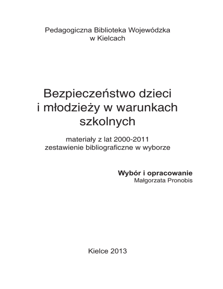 Pedagogiczna Biblioteka Wojewódzka w Kielcach Bezpieczeństwo dzieci i młodzieży w warunkach szkolnych materiały z lat 2000-2011 zestawienie bibliograficzne w wyborze Wybór i opracowanie Małgorzata Pronobis Kielce 2013 Korekta Bożena Lewandowska Redakcja techniczna opracowanie graficzne i skład komputerowy Robert Kardas Wydawca: Pedagogiczna Biblioteka Wojewódzka w Kielcach, ul. Jana Pawła II 5, 25-025 Kielce e-mail: [email protected] www.pbw.kielce.pl Przemoc, agresja, mobbing, fala – materiały ogólne 1. Adamczewska, Bożena : Geneza agresji / Bożena Adamczewska // „Edukacja i Dialog”. – 2006, nr 1, s. 21-25 [Artykuł dostępny w Internecie: http://www.eid.edu.pl/archiwum/2006,104/styczen,215/geneza_agresji,1881.html] Czytelnia Pedagogicznej Biblioteki Wojewódzkiej 2. Agresja dzieci i młodzieży : uwarunkowania indywidualne, rodzinne i szkolne / pod red. Ireny Pufal-Struzik. – Kielce : Wydawnictwo Pedagogiczne ZNP, cop. 2007. – 85, [2] s. Uniwersytet Jana Kochanowskiego: Biblioteka Główna, Czytelnia Pedagogiczna 3. Agresja i przemoc wśród dzieci i młodzieży oraz w instytucjach społeczno-opiekuńczych / red. Józef Kuźma i Zofia Szarota ; Wyższa Szkoła Pedagogiczna im. Komisji Edukacji Narodowej w Krakowie. – Kraków : „Text”, 1998. – 333 s. Sygn. 227412 Czytelnia Pedagogicznej Biblioteki Wojewódzkiej Sygn. 227221 Wypożyczalnia Pedagogicznej Biblioteki Wojewódzkiej 4. Agresja, konflikt, niska samoocena / [zespół red. Tomasz Garstka et al.]. – Warszawa : Dr Josef Raabe, 2010. – 95 s. Sygn. 248688 Czytelnia Pedagogicznej Biblioteki Wojewódzkiej 5. Agresja w szkole : spojrzenie wieloaspektowe / pod red. Andrzeja Rejznera ; Wyższa Szkoła Pedagogiczna Towarzystwa Wiedzy Po- 4 wszechnej w Warszawie. – Warszawa : Wydawnictwo WSP TWP, 2004. – 218 s. Uniwersytet Jana Kochanowskiego: Czytelnia Pedagogiczna 6. Babik, Marek : Agresja seksualna w szkole / Marek Babik // „Wychowawca”. – 2007, nr 9, s. 12-14 [Artykuł dostępny w Internecie: http://www.wychowawca.pl/miesiecznik_ nowy/2007/09-2007/07.html] Czytelnia Pedagogicznej Biblioteki Wojewódzkiej 7. Barlińska, Julia : Cyberprzestrzeń – nowa arena przemocy rówieśniczej? / Julia Barlińska // „Kwartalnik Pedagogiczny”. – 2009, nr 4, s. [53]-66 [Przemoc rówieśnicza w sieci (cyberbullying, cyberprzemoc) to przykład nowego problemu społecznego o zdecydowanie negatywnym charakterze] Czytelnia Pedagogicznej Biblioteki Wojewódzkiej 8. Baumann, Katarzyna : Agresja dobra i zła / Katarzyna Baumann // „Edukacja i Dialog”. – 2007, nr 2, s. 60-62 [Agresywne zachowanie dziecka w szkole i w domu. Artykuł dostępny w Internecie: http://www.eid.edu.pl/archiwum/2007,57/luty,88/agresja_dobra_i_ zla,267.html] Czytelnia Pedagogicznej Biblioteki Wojewódzkiej 9. Bekier, Irena : Czy ktoś mi pomoże? / Irena Bekier // „Psychologia w Szkole”. – 2004, nr 4, s. 101-111 [Ofiary agresji rówieśniczej. Co to jest wsparcie. Przykłady wypowiedzi uczniów świadczące o cierpieniu i bezradności oraz braku wiary w pomoc] Czytelnia Pedagogicznej Biblioteki Wojewódzkiej 10. Bilińska-Suchanek, Ewa : Gdy słowo boli : brak poczucia wartości a agresja w okresie dorastania / Ewa Bilińska-Suchanek // „Edukacja”. – 2005, nr 2, s. 5-14 [Podstawowe czynniki wpływające na zachowania agresywne : brak akceptacji, zrozumienia, uznania, zaspokojenia potrzeby poczucia własnej wartości. Niepowodzenia w szkole i w grupie rówieśniczej, brak wsparcia ze strony rodziców, nauczycieli i kolegów rozwijają poczucie mniejszej wartości, która przeradza się w agresję] Czytelnia Pedagogicznej Biblioteki Wojewódzkiej 11. Błasiak, Julita : Zjawisko agresji w szkole / Julita Błasiak // „Meritum”. – 2010, nr 4, s. 50-54 Czytelnia Pedagogicznej Biblioteki Wojewódzkiej 5 12. Bojarska, Lucyna : Sposób na bezpieczną szkołę / Lucyna Bojarska // „Niebieska Linia”. – 2006, nr 5, s. 3-7 [Artykuł zawiera rozważania na temat przemocy w szkole ze szczególnym uwzględnieniem zjawiska fali. Artykuł dostępny w Internecie: http://www.pismo.niebieskalinia.pl/index.php?id=352] Czytelnia Pedagogicznej Biblioteki Wojewódzkiej 13. Brown, Kevin : Zastraszanie – co na to rodzice? / Kevin Brown. – Katowice : „Credo”, 2003. – 157, [2] s. Uniwersytet Jana Kochanowskiego: Czytelnia Pedagogiczna 14. Buczek, Zbigniew : Agresja i hałas w szkole / Zbigniew Buczek // „Lider”. – 2004, nr 9, s. 14 Czytelnia Pedagogicznej Biblioteki Wojewódzkiej 15. Budny, Wioletta : Kto uczy agresji? : agresja w szkole. [Cz.] 1 / Wioletta Budny // „Przegląd Oświatowy”. – 2007, nr 15, s. 13-14 [Agresja werbalna – omówienie badań przeprowadzonych w szkole podstawowej. Poczucie bezpieczeństwa w rodzinie] 16. Budny, Wioletta : Kto uczy agresji? : agresja w szkole. [Cz.] 2 / Wioletta Budny // „Przegląd Oświatowy”. – 2007, nr 16, s. 13-14 17. Bunda, Martyna : Trzech na Czarka / Martyna Bunda // „Polityka”. – 2006, nr 49, s. 92-[95] [Podstawowe przyczyny agresji w szkole] Czytelnia Pedagogicznej Biblioteki Wojewódzkiej 18. Chorab, Monika : Dręczyciel i ofiara – dwie strony świata przemocy / Monika Chorab // „Opieka, Wychowanie, Terapia”. – 2009, nr 1/2, s. [5]-7 [Sytuacje przemocy i prześladowania w klasie szkolnej – mobbing uczniowski. Style zachowań i cechy osobowości dręczycieli i ich ofiar. Przyczyny zjawiska] Czytelnia Pedagogicznej Biblioteki Wojewódzkiej 19. Chorab, Monika : Kiedy w klasie szkolnej pojawia się mobbing uczniowski / Monika Chorab // „Dyrektor Szkoły”. – 2009, nr 11, s. 4042 [Czym jest mobbing uczniowski. Cechy i formy mobbingu. Mobbing a bullying i „fala”. Rola nauczyciela i szkoły w walce z mobbingiem uczniowskim] Czytelnia Pedagogicznej Biblioteki Wojewódzkiej 6 20. Czemierowska-Koruba, Ewa : Niemoc karmi przemoc / Ewa Czemierowska-Koruba ; rozm. przepr. Przemysław Wilczyński // „Tygodnik Powszechny”. – 2010, nr 