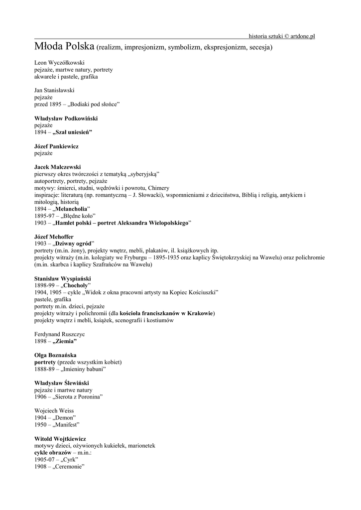 historia sztuki © artdone.pl Młoda Polska (realizm, impresjonizm, symbolizm, ekspresjonizm, secesja) Leon Wyczółkowski pejzaże, martwe natury, portrety akwarele i pastele, grafika Jan Stanisławski pejzaże przed 1895 – „Bodiaki pod słońce” Władysław Podkowiński pejzaże 1894 – „Szał uniesień” Józef Pankiewicz pejzaże Jacek Malczewski pierwszy okres twórczości z tematyką „syberyjską” autoportrety, portrety, pejzaże motywy: śmierci, studni, wędrówki i powrotu, Chimery inspiracje: literaturą (np. romantyczną – J. Słowacki), wspomnieniami z dzieciństwa, Biblią i religią, antykiem i mitologią, historią 1894 – „Melancholia” 1895-97 – „Błędne koło” 1903 – „Hamlet polski – portret Aleksandra Wielopolskiego” Józef Mehoffer 1903 – „Dziwny ogród” portrety (m.in. żony), projekty wnętrz, mebli, plakatów, il. książkowych itp. projekty witraży (m.in. kolegiaty we Fryburgu – 1895-1935 oraz kaplicy Świętokrzyskiej na Wawelu) oraz polichromie (m.in. skarbca i kaplicy Szafrańców na Wawelu) Stanisław Wyspiański 1898-99 – „Chochoły” 1904, 1905 – cykle „Widok z okna pracowni artysty na Kopiec Kościuszki” pastele, grafika portrety m.in. dzieci, pejzaże projekty witraży i polichromii (dla kościoła franciszkanów w Krakowie) projekty wnętrz i mebli, książek, scenografii i kostiumów Ferdynand Ruszczyc 1898 – „Ziemia” Olga Boznańska portrety (przede wszystkim kobiet) 1888-89 – „Imieniny babuni” Władysław Ślewiński pejzaże i martwe natury 1906 – „Sierota z Poronina” Wojciech Weiss 1904 – „Demon” 1950 – „Manifest” Witold Wojtkiewicz motywy dzieci, ożywionych kukiełek, marionetek cykle obrazów – m.in.: 1905-07 – „Cyrk” 1908 – „Ceremonie”