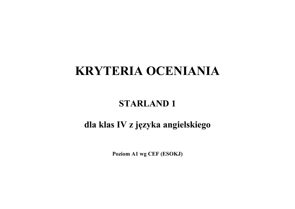 KRYTERIA OCENIANIA STARLAND 1 dla klas IV z języka angielskiego Poziom A1 wg CEF (ESOKJ) WYMOGI EDUKACYJNE NA POSZCZEGÓLNE OCENY Z JĘZYKA ANGIELSKIEGO DLA KLASY IV SZKOŁY PODSTAWOWEJ NR 4 IM. ARMII „POZNAŃ” W POZNANIU KRYTERIA OCENIANIA – STARLAND 1 Wymagania ogólne i szczegółowe – zgodnie z nową podstawą programową od 2009 r. OCENA DOPUSZCZAJĄCA DOSTATECZNA DOBRA BARDZO DOBRA UCZEŃ: Module 0 – Starter Uczeń posługuje się bardzo podstawowym zasobem środków językowych: leksykalnych, gramatycznych, ortograficznych oraz fonetycznych, umożliwiających realizację pozostałych wymagań ogólnych w zakresie tematów: CZŁOWIEK, SZKOŁA I. Znajomość środków Zna kilka podstawowych Zna i stosuje połowę poznanych Zna i stosuje większość Zna i stosuje wszystkie poznane językowych wyrazów i zwrotów z Modułu 0 – wyrazów i zwrotów z Modułu 0 – poznanych wyrazów i zwrotów z wyrazy i zwroty z Modułu 0 – liczebniki główne, nazwy liczebniki główne, nazwy Modułu 0 – liczebniki główne, liczebniki główne, nazwy kolorów, zwroty służące do kolorów, zwroty służące do nazwy kolorów, zwroty służące kolorów, zwroty służące do powitania i pożegnania, polecenia powitania i pożegnania, polecenia do powitania i pożegnania, powitania i pożegnania, polecenia klasowe. klasowe. polecenia klasowe. klasowe. Częściowo zna zasadę użycia przedimka nieokreślonego a/ an i, stosując go, popełnia błędy. Zna zasadę użycia przedimka nieokreślonego a/ an i częściowo poprawnie go stosuje. Zna zasadę użycia przedimka nieokreślonego a/ an i w większości poprawnie go stosuje. Zna zasadę użycia przedimka nieokreślonego a/ an i poprawnie go stosuje. Z pomocą nauczyciela częściowo poprawnie potrafi liczyć od 1 do 100. Z pomocą nauczyciela częściowo poprawnie potrafi liczyć od 1 do 100 i zapisać niektóre liczebniki. Potrafi samodzielnie liczyć w zakresie do 100, zna pisownię liczebników od 1 do 100. Uczeń: 6.1. przedstawia się. 6.2. podaje swój wiek i miejsce zamieszkania. 6.5. prosi o informacje. Z pomocą nauczyciela potrafi częściowo poprawnie przeliterować swoje imię i nazwisko, przedstawić się, podać swoje dane osobowe (imię i nazwisko, adres, wiek itp.), przywitać się i pożegnać. Częściowo poprawnie potrafi przeliterować swoje imię i nazwisko, podać swoje dane osobowe (imię, nazwisko, wiek, adres, nr telefonu itp.), przedstawić się i poprosić kogoś o przedstawienie się oraz przywitać się i pożegnać. Uczeń: 5.1. opisuje przedmioty. Z pomocą nauczyciela potrafi częściowo poprawnie napisać, jakiego koloru są dane przedmioty. Z pomocą nauczyciela potrafi napisać, jakiego koloru są dane przedmioty. Potrafi w większości poprawnie liczyć w zakresie do 100, częściowo zna pisownię liczebników od 1 do 100. Potrafi poprawnie przeliterować swoje imię i nazwisko. W większości poprawnie potrafi podać swoje dane osobowe (imię, nazwisko, wiek, adres, nr telefonu itp.) i rozmawiać o tych danych, przedstawić się i poprosić kogoś o przedstawienie się oraz przywitać się i pożegnać. Potrafi napisać, jakiego koloru są dane przedmioty. Potrafi swobodnie i poprawnie przeliterować swoje imię i nazwisko, podać swoje dane osobowe (imię, nazwisko, wiek, adres, nr telefonu itp.) i rozmawiać o tych danych, przedstawić się i poprosić kogoś o przedstawienie się oraz przywitać się i pożegnać. Potrafi swobodnie i poprawnie napisać, jakiego koloru są dane przedmioty. 2 Wymagania ogólne i szczegółowe – zgodnie z nową podstawą programową od 2009 r. OCENA DOPUSZCZAJĄCA DOSTATECZNA DOBRA BARDZO DOBRA UCZEŃ: Module 1 – School days Uczeń posługuje się bardzo podstawowym zasobem środków językowych: leksykalnych, gramatycznych, ortograficznych oraz fonetycznych, umożliwiających realizację pozostałych wymagań ogólnych w zakresie tematów: SZKOŁA, PODRÓŻOWANIE I TURYSTYKA, SPORT Zna kilka podstawowych Zna i stosuje połowę poznanych Zna i stosuje większość Zna i stosuje wszystkie poznane UNITS 1a – 1c: I. Znajomość środków wyrazów i zwrotów z Modułu 1 – wyrazów i zwrotów z Modułu 1 – poznanych wyrazów i zwrotów z wyrazy i zwroty z Modułu 1 – językowych. przedmioty szkolne, nazwy przedmioty szkolne, nazwy Modułu 1 – przedmioty szkolne, przedmioty szkolne, nazwy państw i narodowości, dyscypliny państw i narodowości, dyscypliny nazwy państw i narodowości, państw i narodowości, dyscypliny sportowe. sportowe. dyscypliny sportowe. sportowe. Uczeń: 2.3. i 3.1. rozumie ogólny sens tekstu słuchanego i czytanego. 3.2. wyszukuje proste informacje szczegółowe w tekście czytanym. Uczeń: 8.1. przekazuje ustnie informacje uzyskane z tekstu czytanego. Z pomocą nauczyciela potrafi częściowo poprawnie odmienić czasownik to be i uzupełnić zdania jego odpowiednią formą. Potrafi odmienić czasownik to be oraz uzupełnić zdania jego odpowiednią formą. Poprawnie stosuje formy czasownika to be w zdaniach twierdzących. W większości poprawnie stosuje formy czasownika to be w mowie i piśmie w zdaniach twierdzących, przeczących i pytających. Poprawnie stosuje formy czasownika to be w mowie i piśmie w zdaniach twierdzących, przeczących i pytających. Zna niektóre zaimki osobowe w funkcji podmiotu i dopełnienia. Prawidłowo stosuje formy I oraz me. Zna zaimki osobowe w funkcji podmiotu i dopełnienia. Częściowo prawidłowo stosuje je w zdaniach. Zna zaimki osobowe w funkcji podmiotu i dopełnienia. W większości prawidłowo stosuje je w mowie i piśmie. Zna i poprawnie stosuje zaimki osobowe w funkcji podmiotu i dopełnienia w mowie i piśmie. Zna zaimki pytające who, what, where i how old. Z pomocą nauczyciela częściowo potrafi utworzyć pytania. Rozumie w niewielkim stopniu teksty i nagrania (przedstawianie się osób, szkoła sportowa). Z pomocą nauczyciela odpowiada na bardzo proste pytania. Zna zaimki pytaj
