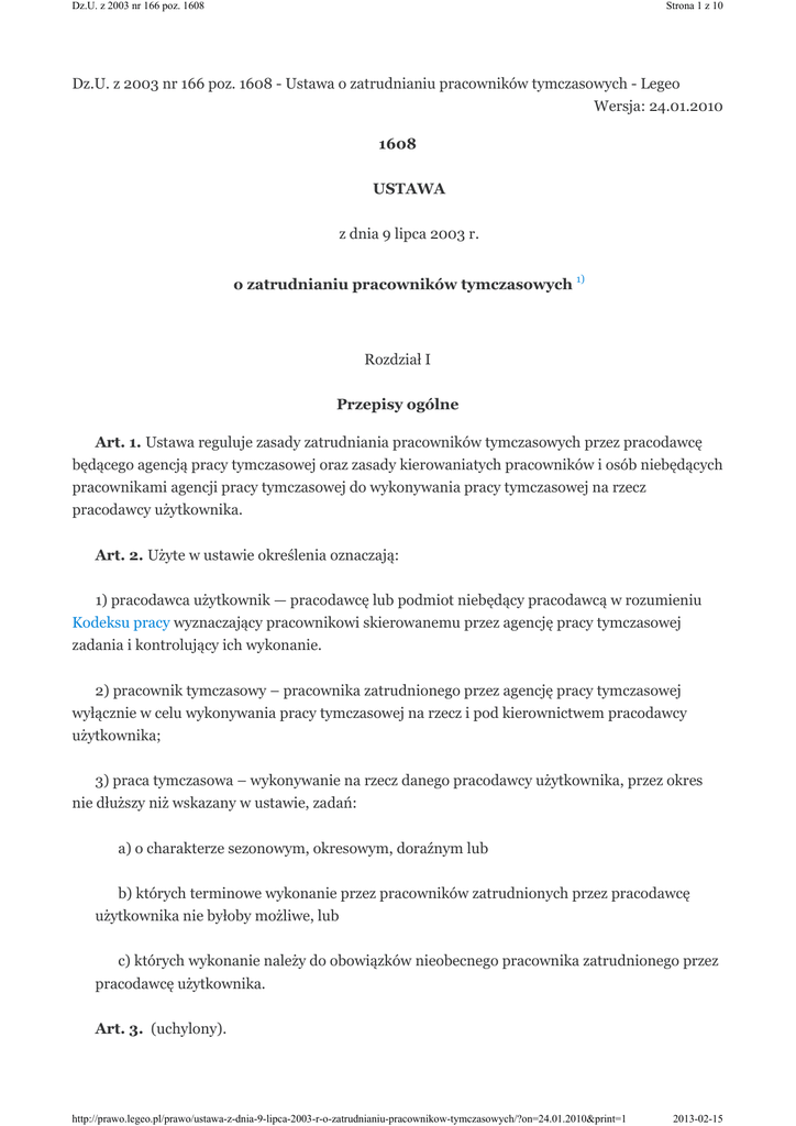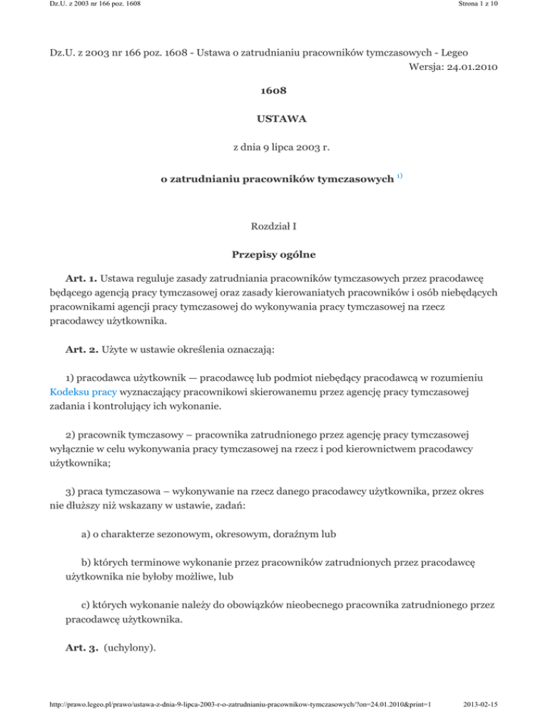 Dz.U. z 2003 nr 166 poz. 1608 Strona 1 z 10 Dz.U. z 2003 nr 166 poz. 1608 - Ustawa o zatrudnianiu pracowników tymczasowych - Legeo Wersja: 24.01.2010 1608 USTAWA z dnia 9 lipca 2003 r. o zatrudnianiu pracowników tymczasowych 1) Rozdział I Przepisy ogólne Art. 1. Ustawa reguluje zasady zatrudniania pracowników tymczasowych przez pracodawcę będącego agencją pracy tymczasowej oraz zasady kierowaniatych pracowników i osób niebędących pracownikami agencji pracy tymczasowej do wykonywania pracy tymczasowej na rzecz pracodawcy użytkownika. Art. 2. Użyte w ustawie określenia oznaczają: 1) pracodawca użytkownik — pracodawcę lub podmiot niebędący pracodawcą w rozumieniu Kodeksu pracy wyznaczający pracownikowi skierowanemu przez agencję pracy tymczasowej zadania i kontrolujący ich wykonanie. 2) pracownik tymczasowy – pracownika zatrudnionego przez agencję pracy tymczasowej wyłącznie w celu wykonywania pracy tymczasowej na rzecz i pod kierownictwem pracodawcy użytkownika; 3) praca tymczasowa – wykonywanie na rzecz danego pracodawcy użytkownika, przez okres nie dłuższy niż wskazany w ustawie, zadań: a) o charakterze sezonowym, okresowym, doraźnym lub b) których terminowe wykonanie przez pracowników zatrudnionych przez pracodawcę użytkownika nie byłoby możliwe, lub c) których wykonanie należy do obowiązków nieobecnego pracownika zatrudnionego przez pracodawcę użytkownika. Art. 3. (uchylony). http://prawo.legeo.pl/prawo/ustawa-z-dnia-9-lipca-2003-r-o-zatrudnianiu-pracownikow-tymczasowych/?on=24.01.2010&print=1 2013-02-15 Dz.U. z 2003 nr 166 poz. 1608 Strona 2 z 10 Art. 4. Pracodawca nie może być pracodawcą użytkownikiem w stosunku do pracowników pozostających z nim w stosunku pracy. Art. 5. W zakresie nieuregulowanym odmiennie przepisami ustawy i przepisami odrębnymi do agencji pracy tymczasowej, pracownika tymczasowego i pracodawcy użytkownika stosuje się przepisy prawa pracy dotyczące odpowiednio pracodawcy i pracownika, z uwzględnieniem art. 6. Art. 6. Do pracowników tymczasowych nie stosuje się przepisów ustawy z dnia 13 marca 2003 r. o szczególnych zasadach rozwiązywania z pracownikami stosunków pracy z przyczyn niedotyczących pracowników. Rozdział II Zasady zatrudniania pracowników tymczasowych i kierowania tych pracowników do wykonywania pracy tymczasowej Art. 7. Agencja pracy tymczasowej zatrudnia pracowników tymczasowych na podstawie umowy o pracę na czas określony lub umowy o pracę na czas wykonania określonej pracy. Art. 8. Pracownikowi tymczasowemu nie może być powierzone wykonywanie na rzecz pracodawcy użytkownika pracy: 1) szczególnie niebezpiecznej w rozumieniu przepisów wydanych na podstawie art. 23715Kodeksu pracy; 2) na stanowisku pracy, na którym jest zatrudniony pracownik pracodawcy użytkownika, w okresie uczestniczenia tego pracownika w strajku; 3) na stanowisku pracy, na którym, w okresie ostatnich 3 miesięcy poprzedzających przewidywany termin rozpoczęcia wykonywania pracy tymczasowej przez pracownika tymczasowego, był zatrudniony pracownik pracodawcy użytkownika, z którym został rozwiązany stosunek pracy z przyczyn niedotyczących pracowników. Art. 9. 1. W celu zawarcia umowy o pracę między agencją pracy tymczasowej a pracownikiem tymczasowym pracodawca użytkownik uzgadnia z tą agencją na piśmie: 1) rodzaj pracy, która ma być powierzona pracownikowi tymczasowemu; 2) wymagania kwalifikacyjne konieczne do wykonywania pracy, która ma być powierzona pracownikowi tymczasowemu; 3) przewidywany okres wykonywania pracy tymczasowej; http://prawo.legeo.pl/prawo/ustawa-z-dnia-9-lipca-2003-r-o-zatrudnianiu-pracownikow-tymczasowych/?on=24.01.2010&print=1 2013-02-15 Dz.U. z 2003 nr 166 poz. 1608 Strona 3 z 10 4) wymiar czasu pracy pracownika tymczasowego; 5) miejsce wykonywania pracy tymczasowej. 2. Pracodawca użytkownik informuje agencję pracy tymczasowej na piśmie o: 1) wynagrodzeniu za pracę, która ma być powierzona pracownikowi tymczasowemu, określonym w przepisach o wynagrodzeniu obowiązujących u pracodawcy użytkownika; 2) warunkach wykonywania pracy tymczasowej w zakresie dotyczącym bezpieczeństwa i higieny pracy. 2a. Pracodawca użytkownik dostarcza pracownikowi tymczasowemu odzież i obuwie robocze oraz środki ochrony indywidualnej, zapewnia napoje i posiłki profilaktyczne, przeprowadza szkolenia w zakresie bezpieczeństwa i higieny pracy, ustala okoliczności i przyczyny wypadku przy pracy, przeprowadza ocenę ryzyka zawodowego oraz informuje o tym ryzyku. 2b. Do sposobu i terminów przeprowadzania szkoleń w zakresie bezpieczeństwa i higieny pracy przepisy Kodeksu pracy stosuje się odpowiednio. 3. Przed zawarciem umowy o pracę między agencją pracy tymczasowej a pracownikiem tymczasowym agencja pracy tymczasowej i pracodawca użytkownik uzgadniają na piśmie: 1) zakres informacji dotyczących przebiegu pracy tymczasowej, które mają wpływ na wysokość wynagrodzenia za pracę pracownika tymczasowego, oraz sposób i termin przekazywania tych informacji agencji pracy tymczasowej w celu prawidłowego obliczania wynagrodzenia za pracę tego pracownika; 2) zakres przejęcia przez pracodawcę użytkownika obowiązków pracodawcy dotyczących bezpieczeństwa i higieny pracy innych niż określone w ust. 2a; 3) zakres przejęcia przez pracodawcę użytkownika obowiązku pracodawcy dotyczącego wypłacania należności na pokrycie kosztów związanych z podróżą służbową. Art. 10. 1. Agencja pracy tymczasowej i pracodawca użytkownik mogą uzgodnić wykorzystanie przez pracownika tymczasowego urlopu wypoczynkowego, w całości lub w części, w okresie wykonywania pracy tymczasowej na rzecz tego pracodawcy użytkownika, ustalając zarazem tryb udzielenia tego urlopu. 2. Jeżeli okres wykonywania pracy na rzecz danego pracodawcy użytkownika obejmuje 6 miesięcy lub okres dłuższy, pracodawca użytkownik jest obowiązany umożliwić pracownikowi tymczasowemu w