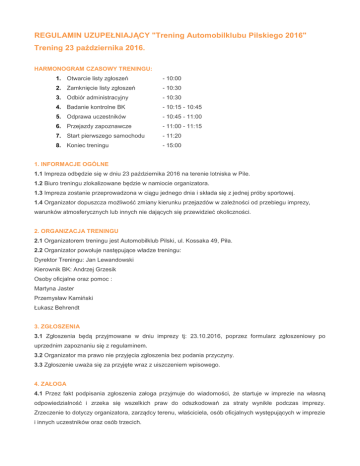 REGULAMIN UZUPEŁNIAJĄCY "Trening Automobilklubu Pilskiego 2016" Trening 23 października 2016. HARMONOGRAM CZASOWY TRENINGU: 1. Otwarcie listy zgłoszeń - 10:00 2. Zamknięcie listy zgłoszeń - 10:30 3. Odbiór administracyjny - 10:30 4. Badanie kontrolne BK - 10:15 - 10:45 5. Odprawa uczestników - 10:45 - 11:00 6. Przejazdy zapoznawcze - 11:00 - 11:15 7. Start pierwszego samochodu - 11:20 8. Koniec treningu - 15:00 1. INFORMACJE OGÓLNE 1.1 Impreza odbędzie się w dniu 23 października 2016 na terenie lotniska w Pile. 1.2 Biuro treningu zlokalizowane będzie w namiocie organizatora. 1.3 Impreza zostanie przeprowadzona w ciągu jednego dnia i składa się z jednej próby sportowej. 1.4 Organizator dopuszcza możliwość zmiany kierunku przejazdów w zależności od przebiegu imprezy, warunków atmosferycznych lub innych nie dających się przewidzieć okoliczności. 2. ORGANIZACJA TRENINGU 2.1 Organizatorem treningu jest Automobilklub Pilski, ul. Kossaka 49, Piła. 2.2 Organizator powołuje następujące władze treningu: Dyrektor Treningu: Jan Lewandowski Kierownik BK: Andrzej Grzesik Osoby oficjalne oraz pomoc : Martyna Jaster Przemysław Kamiński Łukasz Behrendt 3. ZGŁOSZENIA 3.1 Zgłoszenia będą przyjmowane w dniu imprezy tj: 23.10.2016, poprzez formularz zgłoszeniowy po uprzednim zapoznaniu się z regulaminem. 3.2 Organizator ma prawo nie przyjęcia zgłoszenia bez podania przyczyny. 3.3 Zgłoszenie uważa się za przyjęte wraz z uiszczeniem wpisowego. 4. ZAŁOGA 4.1 Przez fakt podpisania zgłoszenia załoga przyjmuje do wiadomości, że startuje w imprezie na własną odpowiedzialność i zrzeka się wszelkich praw do odszkodowań za straty wynikłe podczas imprezy. Zrzeczenie to dotyczy organizatora, zarządcy terenu, właściciela, osób oficjalnych występujących w imprezie i innych uczestników oraz osób trzecich. 4.2 Pilot musi mieć ukończone 17 lat. 4.3 Pilot nie może prowadzić samochodu podczas trwania treningu. W przypadku stwierdzenia prowadzenia samochodu przez pilota, załoga zostanie w trybie natychmiastowym wykluczona z treningu. 4.4 Dopuszcza się przejazd maksymalnie dwóch uczestników jednym pojazdem na podstawie osobnego zgłoszenia. 4.5 Jednej osobie przysługuje prawo do jednego zgłoszenia w charakterze kierowcy. 4.6 Organizator określa maksymalną ilość samochodów biorących udział w imprezie. 4.7 Udział dodatkowych samochodów możliwy jest wyłącznie za specjalną zgodą dyrektora treningu. 5. SAMOCHODY 5.1 Organizator dopuszcza do startu samochody zmodyfikowane na potrzeby jazdy sportowej, wyposażone m. in. w klatkę bezpieczeństwa, fotele kubełkowe, pasy sportowe itp. 6. UBEZPIECZENIE 6.1 Kierowcy uczestniczący w imprezie muszą posiadać obowiązkowe ubezpieczenie OC. Zaleca się posiadanie ubezpieczenia NNW i dodatkowego ubezpieczenia obejmującego jazdę sportową. 7. NUMERY STARTOWE 7.1 Numery startowe dostarczone przez organizatora, kierowca ma obowiązek umieścić na tylnym lewym i tylnym prawym bocznym oknie samochodu. Brak numerów podczas trwania imprezy spowoduje karę do wykluczenia włącznie. 8. ODBIÓR ADMINISTRACYJNY 8.1 Biuro treningu zlokalizowane będzie w namiocie organizatora. 8.2 Uczestnicy treningu zobowiązani są do okazania następujących dokumentów: a) podpisane oświadczenie uczestnika Trening Automobilklubu Pilskiego 2016 b) wypełniony formularz karty Badania Kontrolnego c) prawo jazdy kierowcy d) ważny dowód rejestracyjny samochodu e) dowód ubezpieczenia OC samochodu f) pisemna zgoda właściciela samochodu (dotyczy przypadków korzystania z samochodu przez osobę nie będącą właścicielem) 9. BADANIE KONTROLNE 9.1 Badanie kontrolne zostanie przeprowadzone w dniu 23.10.2016 w godz. 10:15 – 10:45 . 9.2 Wymaga się, aby uczestnicy podczas badania kontrolnego posiadali wydrukowaną kartą BK uzupełnioną danymi osobowymi oraz danymi pojazdu wymaganymi w w/w druku (druk dostępny na stronie www.automobilklubpilski.pl/). 9.3 Organizator zastrzega sobie prawo przeprowadzenia dodatkowego badania kontrolnego w każdym momencie trwania treningu. 10. ODPRAWA UCZESTNIKÓW 10.1 Odprawa uczestników zostanie przeprowadzona w namiocie organizatora o godz. 10:45. 11. CHARAKTERYSTYKA TRENINGU 11.1 Trening ma charakter zamknięty dostępny dla osób spełniających wymagania niniejszego regulaminu. 11.2 W treningu uczestnik może startować sam lub z pilotem. 11.3 Dokonywanie napraw tylko w miejscu wyznaczonym. 11.4 Nawierzchnia trasy próby asfalt, beton. 11.5 Odbycie próby w zapiętych pasach bezpieczeństwa, zapiętych kaskach ochronnych, z włączonymi światłami. 11.6 Poza próbą sprawnościową obowiązują przepisy ruchu drogowego z ograniczeniem prędkości do 40 km/h na całym terenie lotniska i drogach dojazdowych. 13. PROCEDURA STARTU 13.1 Start do każdej próby sportowej będzie poprzedzany sygnałem i komunikatem organizatora. 13.2 Start do próby sportowej sygnalizowany będzie przez sędziego startu. 14. SYSTEM KAR 14.1 Wykluczenie z treningu a) Stwierdzone prowadzenie pojazdu przez pilota (lub innej osoby) na próbie sportowej. b) Wykonywanie niebezpiecznych manewrów podczas zapoznania z trasą (drift, wyprzedzanie, opóźnianie kolumny samochodów itp.). c) Wykonywanie podczas treningu manewrów pozostających bez związku z celem rywalizacji, np. "driftowanie", "kręcenie bączków" itp. d) Opuszczenie terenu treningu w trakcie trwania treningu bez powiadomienia organizatora. e) Niesportowe zachowania. f) Wykonanie dwóch przejazdów pod rząd bez zatrzymania. g) Zamierzony przejazd niezgodny z trasą odcinka. 15. KARY FINANSOWE 15.1 W przypadku uszkodzenia infrastruktury Lotniska w Pile. 16. NAGRODY 16.1 Nie przewiduje się nagród, gdyż impreza ma charakter treningu. 17. POSTANOWIENIA KOŃCOWE 17.1 Organizator zastrzega sobie prawo do właściwej interpretacji niniejszego regulaminu, wydawania instrukcji dodatkowych oraz komunikatów stanowiących integralną część regulami