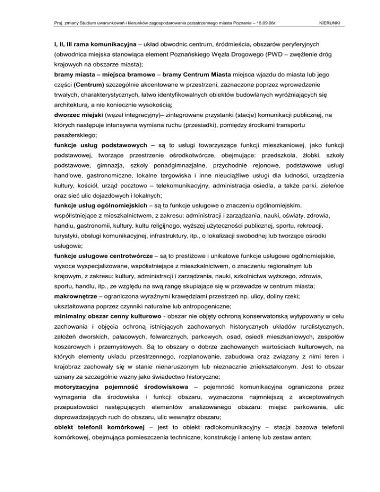 Proj. zmiany Studium uwarunkowań i kierunków zagospodarowania przestrzennego miasta Poznania – 15.09.06r. KIERUNKI I, II, III rama komunikacyjna – układ obwodnic centrum, śródmieścia, obszarów peryferyjnych (obwodnica miejska stanowiąca element Poznańskiego Węzła Drogowego (PWD – zwęźlenie dróg krajowych na obszarze miasta); bramy miasta – miejsca bramowe – bramy Centrum Miasta miejsca wjazdu do miasta lub jego części (Centrum) szczególnie akcentowane w przestrzeni; zaznaczone poprzez wprowadzenie trwałych, charakterystycznych, łatwo identyfikowalnych obiektów budowlanych wyróżniających się architekturą, a nie koniecznie wysokością; dworzec miejski (węzeł integracyjny)– zintegrowane przystanki (stacje) komunikacji publicznej, na których następuje intensywna wymiana ruchu (przesiadki), pomiędzy środkami transportu pasażerskiego; funkcje usług podstawowych – są to usługi towarzyszące funkcji mieszkaniowej, jako funkcji podstawowej, tworzące przestrzenie ośrodkotwórcze, obejmujące: przedszkola, żłobki, szkoły podstawowe, gimnazja, szkoły ponadgimnazjalne, przychodnie rejonowe, podstawowe usługi handlowe, gastronomiczne, lokalne targowiska i inne nieuciążliwe usługi dla ludności, urządzenia kultury, kościół, urząd pocztowo – telekomunikacyjny, administracja osiedla, a także parki, zieleńce oraz sieć ulic dojazdowych i lokalnych; funkcje usług ogólnomiejskich – są to funkcje usługowe o znaczeniu ogólnomiejskim, współistniejące z mieszkalnictwem, z zakresu: administracji i zarządzania, nauki, oświaty, zdrowia, handlu, gastronomii, kultury, kultu religijnego, wyższej użyteczności publicznej, sportu, rekreacji, turystyki, obsługi komunikacyjnej, infrastruktury, itp., o lokalizacji swobodnej lub tworzące ośrodki usługowe; funkcje usługowe centrotwórcze – są to prestiżowe i unikatowe funkcje usługowe ogólnomiejskie, wysoce wyspecjalizowane, współistniejące z mieszkalnictwem, o znaczeniu regionalnym lub krajowym, z zakresu: kultury, administracji i zarządzania, nauki, szkolnictwa wyższego, zdrowia, sportu, handlu, itp., ze względu na swą rangę skupiające się w przewadze w centrum miasta; makrownętrze – ograniczona wyraźnymi krawędziami przestrzeń np. ulicy, doliny rzeki; ukształtowana poprzez czynniki naturalne lub antropogeniczne; minimalny obszar cenny kulturowo - obszar nie objęty ochroną konserwatorską wytypowany w celu zachowania i objęcia ochroną istniejących zachowanych historycznych układów ruralistycznych, założeń dworskich, pałacowych, folwarcznych, parkowych, osad, osiedli mieszkaniowych, zespołów koszarowych i przemysłowych. Są to obszary o dobrze zachowanych wartościach kulturowych, na których elementy układu przestrzennego, rozplanowanie, zabudowa oraz związany z nimi teren i krajobraz zachowały się w stanie nienaruszonym lub nieznacznie zniekształconym. Jest to obszar uznany za szczególnie ważny jako świadectwo historyczne; motoryzacyjna pojemność środowiskowa – pojemność komunikacyjna ograniczona przez wymagania dla środowiska i funkcji obszaru, wyznaczona najmniejszą z akceptowalnych przepustowości następujących elementów analizowanego obszaru: miejsc parkowania, ulic doprowadzających ruch do obszaru, ulic wewnątrz obszaru; obiekt telefonii komórkowej – jest to obiekt radiokomunikacyjny – stacja bazowa telefonii komórkowej, obejmująca pomieszczenia techniczne, konstrukcję i antenę lub zestaw anten; Proj. zmiany Studium uwarunkowań i kierunków zagospodarowania przestrzennego miasta Poznania – 15.09.06r. KIERUNKI Park&Ride (P&R - zaparkuj samochód / jedź komunikacją publiczną) – parking zlokalizowany w pobliżu peryferyjnych przystanków sprawnego transportu publicznego; pawimment – organizacja wnętrz obszarów centralnych, zwłaszcza zabytkowych, polega na kształtowaniu nawierzchni i wyposażenia ulicy w sposób podporządkowany innym funkcjom niż płynność ruchu, np.: ochrona konserwatorska, bezpieczeństwo pieszych, informacji; plac postojowy – jest to jednopoziomowy parking naziemny dla pojazdów, na którym znajduje się co najmniej 10 miejsc postojowych; powierzchnia ekspozycji urządzenia - całkowita powierzchnia przeznaczona do ekspozycji reklamy (powierzchnia reklamowa) albo informacji (powierzchnia informacyjna) w ramach jednego urządzenia; pricinkt – rejon miasta z organizacją ruchu zapewniającą dostęp do obszaru wyłącznie z ulic zewnętrznych, z ograniczeniem możliwości przejazdów do innych obszarów i wykluczeniem tranzytu; przestrzeń ośrodkotwórcza – to obszar o lokalnym znaczeniu w skali miasta tworzący wraz z obszarami przestrzeni publicznych system powiązań funkcjonalno – przestrzennych, służący zaspokajaniu potrzeb mieszkańców, poprawy ich życia i sprzyjający nawiązaniu kontaktów społecznych oraz ze względu na rolę pełnioną w przestrzeni wymagający specjalnego ukształtowania z priorytetem dla komunikacji pieszej; rdzeń wsi - jest to ukształtowany plac w centrum np.: wsi o kształcie wrzeciona lub wydłużonego prostokątnego placu (np. nawsie w dawnej wsi Spławie, w Głuszynie) bądź trójkątnego placu przy rozwidleniu dróg (np. Krzesiny); ring – układ dwóch jednokierunkowych ulic zbiorczych wpisanych w I ramę, regulujący dostęp co centrum; słup reklamowy – jest to wolno stojące urządzenie reklamowe o tradycyjnym kształcie walca pionowego lub w formie bryły do niego zbliżonej, o maksymalnej wysokości do 10 m i proporcjach średnicy podstawy do wysokości 1:3; strefa 30km/h – oznakowany obszar miasta, w którym zabrania się poruszania pojazdów z prędkością przekraczającą 30 km/h; studium sylwety miasta – analiza wysokościowa badanej przestrzeni miasta lub jego fragmentu wykonana z charakterystycznych punktów i ciągów miejskich, przedstawiające zakres ingerencji nowego elementu przestrzennego w stan istniej
