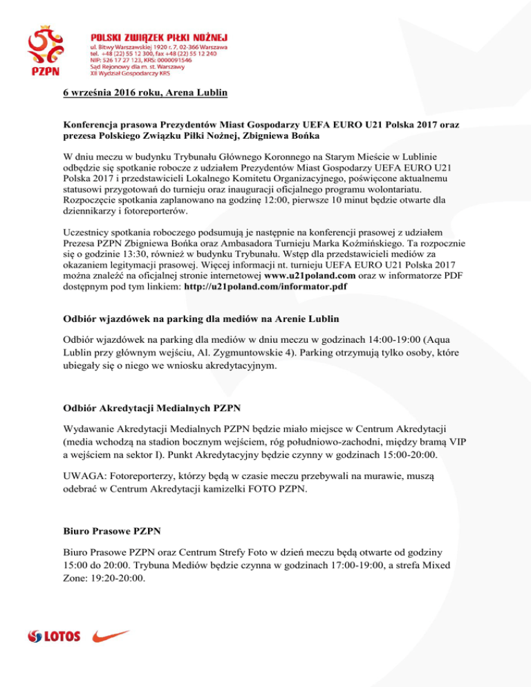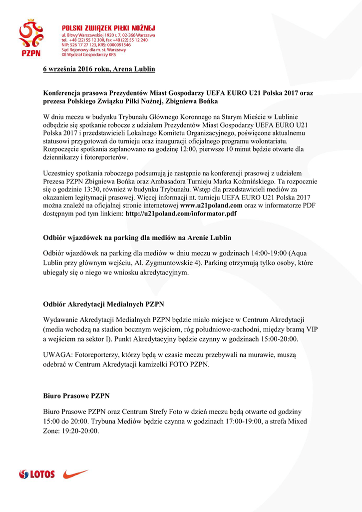 6 września 2016 roku, Arena Lublin Konferencja prasowa Prezydentów Miast Gospodarzy UEFA EURO U21 Polska 2017 oraz prezesa Polskiego Związku Piłki Nożnej, Zbigniewa Bońka W dniu meczu w budynku Trybunału Głównego Koronnego na Starym Mieście w Lublinie odbędzie się spotkanie robocze z udziałem Prezydentów Miast Gospodarzy UEFA EURO U21 Polska 2017 i przedstawicieli Lokalnego Komitetu Organizacyjnego, poświęcone aktualnemu statusowi przygotowań do turnieju oraz inauguracji oficjalnego programu wolontariatu. Rozpoczęcie spotkania zaplanowano na godzinę 12:00, pierwsze 10 minut będzie otwarte dla dziennikarzy i fotoreporterów. Uczestnicy spotkania roboczego podsumują je następnie na konferencji prasowej z udziałem Prezesa PZPN Zbigniewa Bońka oraz Ambasadora Turnieju Marka Koźmińskiego. Ta rozpocznie się o godzinie 13:30, również w budynku Trybunału. Wstęp dla przedstawicieli mediów za okazaniem legitymacji prasowej. Więcej informacji nt. turnieju UEFA EURO U21 Polska 2017 można znaleźć na oficjalnej stronie internetowej www.u21poland.com oraz w informatorze PDF dostępnym pod tym linkiem: http://u21poland.com/informator.pdf Odbiór wjazdówek na parking dla mediów na Arenie Lublin Odbiór wjazdówek na parking dla mediów w dniu meczu w godzinach 14:00-19:00 (Aqua Lublin przy głównym wejściu, Al. Zygmuntowskie 4). Parking otrzymują tylko osoby, które ubiegały się o niego we wniosku akredytacyjnym. Odbiór Akredytacji Medialnych PZPN Wydawanie Akredytacji Medialnych PZPN będzie miało miejsce w Centrum Akredytacji (media wchodzą na stadion bocznym wejściem, róg południowo-zachodni, między bramą VIP a wejściem na sektor I). Punkt Akredytacyjny będzie czynny w godzinach 15:00-20:00. UWAGA: Fotoreporterzy, którzy będą w czasie meczu przebywali na murawie, muszą odebrać w Centrum Akredytacji kamizelki FOTO PZPN. Biuro Prasowe PZPN Biuro Prasowe PZPN oraz Centrum Strefy Foto w dzień meczu będą otwarte od godziny 15:00 do 20:00. Trybuna Mediów będzie czynna w godzinach 17:00-19:00, a strefa Mixed Zone: 19:20-20:00. Depozyt Kamer i prawo do nagrywania meczu Przypominamy, że prawo do nagrywania i transmitowania meczu ma jedynie oficjalny nadawca, który ma podpisaną z Polskim Związku Piłki Nożnej umowę. W tym wypadku telewizja Polsat. Wszystkie inne stacje telewizyjne, które otrzymały akredytacje na mecz, mogą nagrywać jednie przed stadionem, w sali konferencyjnej i strefie Mixed Zone. W czasie meczu w Centrum Prasowym będzie przygotowany depozyt kamer, w którym będzie można schować kamerę na czas meczu. Prosimy z tego korzystać, bowiem nie będzie możliwe wejście z kamerą na trybuny. Pomeczowa konferencja prasowa Pomeczowa konferencja prasowa trenerów reprezentacji Polski i Węgier odbędzie się w sali konferencyjnej w Centrum Prasowym o godzinie 19:45.