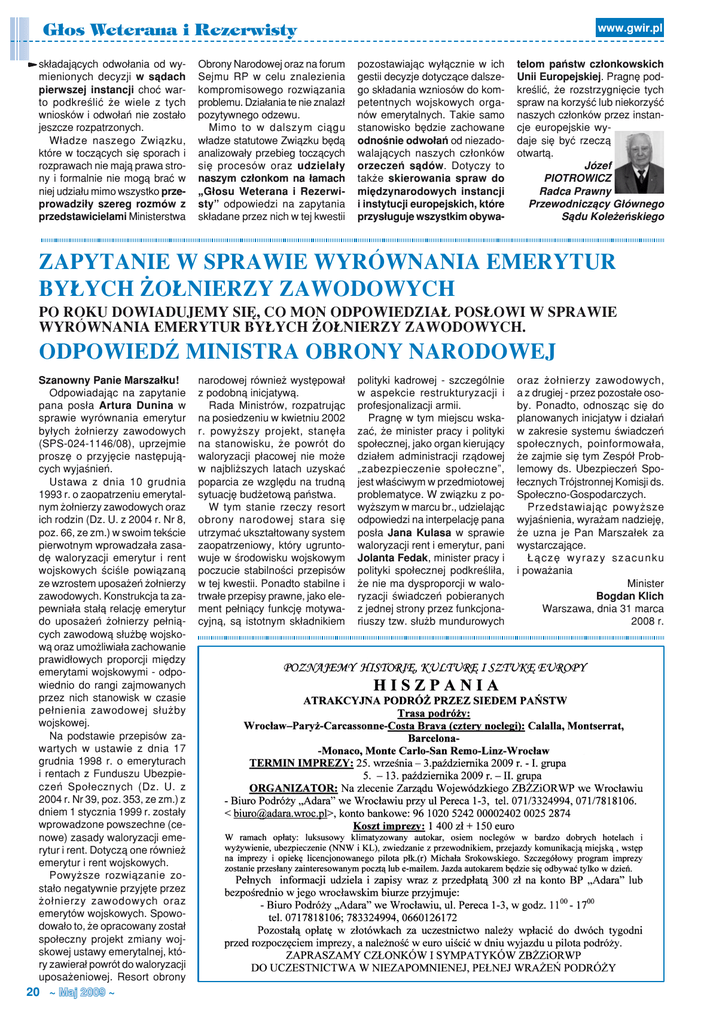 G³os Weterana i Rezerwisty składających odwołania od wymienionych decyzji w sądach pierwszej instancji choć warto podkreślić że wiele z tych wniosków i odwołań nie zostało jeszcze rozpatrzonych. Władze naszego Związku, które w toczących się sporach i rozprawach nie mają prawa strony i formalnie nie mogą brać w niej udziału mimo wszystko przeprowadziły szereg rozmów z przedstawicielami Ministerstwa Obrony Narodowej oraz na forum Sejmu RP w celu znalezienia kompromisowego rozwiązania problemu. Działania te nie znalazł pozytywnego odzewu. Mimo to w dalszym ciągu władze statutowe Związku będą analizowały przebieg toczących się procesów oraz udzielały naszym członkom na łamach „Głosu Weterana i Rezerwisty” odpowiedzi na zapytania składane przez nich w tej kwestii www.gwir.pl pozostawiając wyłącznie w ich gestii decyzje dotyczące dalszego składania wzniosów do kompetentnych wojskowych organów emerytalnych. Takie samo stanowisko będzie zachowane odnośnie odwołań od niezadowalających naszych członków orzeczeń sądów. Dotyczy to także skierowania spraw do międzynarodowych instancji i instytucji europejskich, które przysługuje wszystkim obywa- telom państw członkowskich Unii Europejskiej. Pragnę podkreślić, że rozstrzygnięcie tych spraw na korzyść lub niekorzyść naszych członków przez instancje europejskie wydaje się być rzeczą otwartą. Józef PIOTROWICZ Radca Prawny Przewodniczący Głównego Sądu Koleżeńskiego Zapytanie w sprawie wyrównania emerytur byłych żołnierzy zawodowych Po roku dowiadujemy się, co MON odpowiedział posłowi w sprawie wyrównania emerytur byłych żołnierzy zawodowych. Odpowiedź ministra obrony narodowej Szanowny Panie Marszałku! Odpowiadając na zapytanie pana posła Artura Dunina w sprawie wyrównania emerytur byłych żołnierzy zawodowych (SPS-024-1146/08), uprzejmie proszę o przyjęcie następujących wyjaśnień. Ustawa z dnia 10 grudnia 1993 r. o zaopatrzeniu emerytalnym żołnierzy zawodowych oraz ich rodzin (Dz. U. z 2004 r. Nr 8, poz. 66, ze zm.) w swoim tekście pierwotnym wprowadzała zasadę waloryzacji emerytur i rent wojskowych ściśle powiązaną ze wzrostem uposażeń żołnierzy zawodowych. Konstrukcja ta zapewniała stałą relację emerytur do uposażeń żołnierzy pełniących zawodową służbę wojskową oraz umożliwiała zachowanie prawidłowych proporcji między emerytami wojskowymi - odpowiednio do rangi zajmowanych przez nich stanowisk w czasie pełnienia zawodowej służby wojskowej. Na podstawie przepisów zawartych w ustawie z dnia 17 grudnia 1998 r. o emeryturach i rentach z Funduszu Ubezpieczeń Społecznych (Dz. U. z 2004 r. Nr 39, poz. 353, ze zm.) z dniem 1 stycznia 1999 r. zostały wprowadzone powszechne (cenowe) zasady waloryzacji emerytur i rent. Dotyczą one również emerytur i rent wojskowych. Powyższe rozwiązanie zostało negatywnie przyjęte przez żołnierzy zawodowych oraz emerytów wojskowych. Spowodowało to, że opracowany został społeczny projekt zmiany wojskowej ustawy emerytalnej, który zawierał powrót do waloryzacji uposażeniowej. Resort obrony 20 ~ Maj 2009 ~ narodowej również występował z podobną inicjatywą. Rada Ministrów, rozpatrując na posiedzeniu w kwietniu 2002 r. powyższy projekt, stanęła na stanowisku, że powrót do waloryzacji płacowej nie może w najbliższych latach uzyskać poparcia ze względu na trudną sytuację budżetową państwa. W tym stanie rzeczy resort obrony narodowej stara się utrzymać ukształtowany system zaopatrzeniowy, który ugruntowuje w środowisku wojskowym poczucie stabilności przepisów w tej kwestii. Ponadto stabilne i trwałe przepisy prawne, jako element pełniący funkcję motywacyjną, są istotnym składnikiem polityki kadrowej - szczególnie w aspekcie restrukturyzacji i profesjonalizacji armii. Pragnę w tym miejscu wskazać, że minister pracy i polityki społecznej, jako organ kierujący działem administracji rządowej „zabezpieczenie społeczne”, jest właściwym w przedmiotowej problematyce. W związku z powyższym w marcu br., udzielając odpowiedzi na interpelację pana posła Jana Kulasa w sprawie waloryzacji rent i emerytur, pani Jolanta Fedak, minister pracy i polityki społecznej podkreśliła, że nie ma dysproporcji w waloryzacji świadczeń pobieranych z jednej strony przez funkcjonariuszy tzw. służb mundurowych oraz żołnierzy zawodowych, a z drugiej - przez pozostałe osoby. Ponadto, odnosząc się do planowanych inicjatyw i działań w zakresie systemu świadczeń społecznych, poinformowała, że zajmie się tym Zespół Problemowy ds. Ubezpieczeń Społecznych Trójstronnej Komisji ds. Społeczno-Gospodarczych. Przedstawiając powyższe wyjaśnienia, wyrażam nadzieję, że uzna je Pan Marszałek za wystarczające. Łączę wyrazy szacunku i poważania Minister Bogdan Klich Warszawa, dnia 31 marca 2008 r.