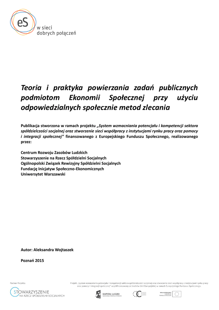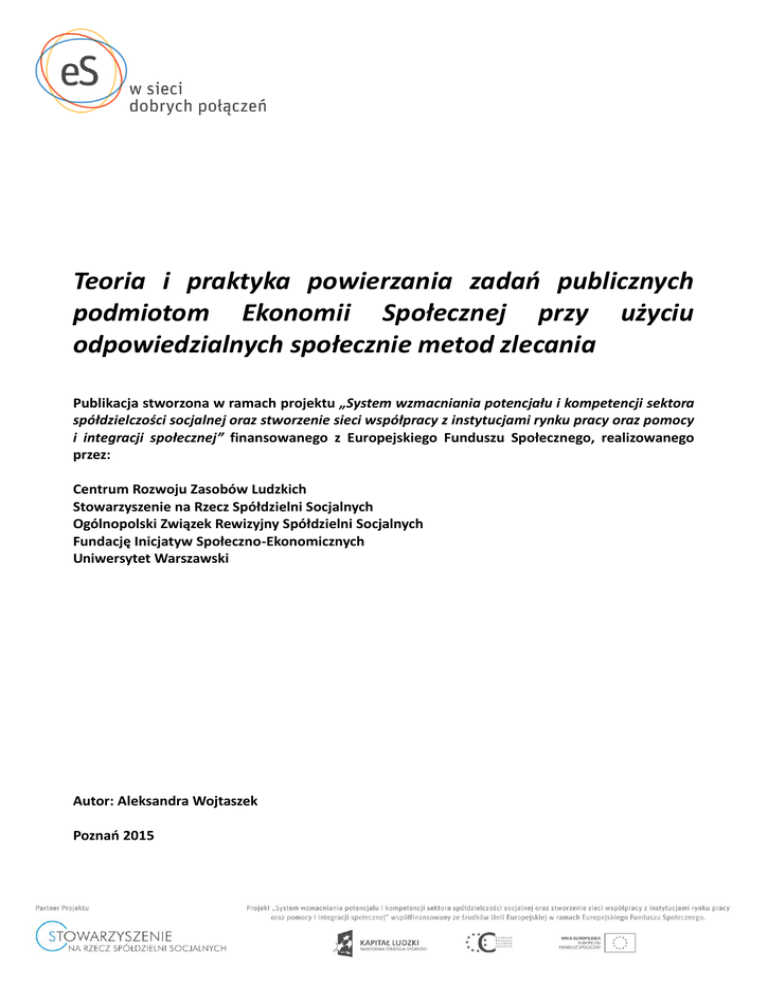 1 1 Teoria i praktyka powierzania zadań publicznych podmiotom Ekonomii Społecznej przy użyciu odpowiedzialnych społecznie metod zlecania Publikacja stworzona w ramach projektu „System wzmacniania potencjału i kompetencji sektora spółdzielczości socjalnej oraz stworzenie sieci współpracy z instytucjami rynku pracy oraz pomocy i integracji społecznej” finansowanego z Europejskiego Funduszu Społecznego, realizowanego przez: Centrum Rozwoju Zasobów Ludzkich Stowarzyszenie na Rzecz Spółdzielni Socjalnych Ogólnopolski Związek Rewizyjny Spółdzielni Socjalnych Fundację Inicjatyw Społeczno-Ekonomicznych Uniwersytet Warszawski Autor: Aleksandra Wojtaszek Poznań 2015 1 2 2 Spis Treści Wstęp ................................................................................................................................................... 3 I. Unijne oraz międzynarodowe akty prawne regulujące kwestię zlecania zadań publicznych ...... 4 II. Ustawodawstwo trzech krajów unijnych – Anglii, Francji, Hiszpanii – dotyczące zlecania zadań publicznych. ............................................................................................................................... 9 III. Dobre praktyki zlecania zadań publicznych podmiotom Ekonomii Społecznej przy użyciu odpowiedzialnych społecznie metod na przykładzie trzech krajów unijnych: Anglii, Francji i Hiszpanii. ........................................................................................................................................... 21 IV. Porównanie ustawodawstwa i polskiej praktyki działania dotyczących zlecania zadań publicznych z ustawodawstwem i doświadczeniami Anglii, Francji i Hiszpanii wraz z rekomendacjami dla interesariuszy zamówień publicznych w Polsce ............................................... 45 Bibliografia ........................................................................................................................................ 52 Załączniki ........................................................................................................................................... 54 2 3 3 Wstęp Niniejsza publikacja napisana w ramach projektu „System wzmacniania potencjału i kompetencji sektora spółdzielczości socjalnej oraz stworzenie sieci współpracy z instytucjami rynku pracy oraz pomocy i integracji społecznej” finansowanego z Europejskiego Funduszu Społecznego, ma na celu przedstawienie dobrych praktyk zlecania zadań publicznych podmiotom ekonomii społecznej w trzech krajach członkowskich Unii Europejskiej – Francji, Hiszpanii oraz Wielkiej Brytanii1- oraz porównanie tych praktyk z doświadczeniami polskimi w tym obszarze. Opis tychże praktyk poprzedzony został analizą przepisów międzynarodowych oraz unijnych, obowiązujących trzy wspomniane kraje oraz Polskę, dotyczących zamówień publicznych. Następnie, dla lepszego zrozumienia przytaczanych przykładów powierzania zadań publicznych podmiotom ekonomii społecznej, przedstawione zostały krajowe, angielskie, francuskie i hiszpańskie, przepisy regulujące podział zadań publicznych pomiędzy różne organy administracji samorządowej, a także te organizujące zlecanie zadań publicznych oraz inne akty prawne promujące odpowiedzialne społecznie postawy w tym obszarze. Publikacja byłaby niepełna, gdyby skupić się tylko i wyłącznie na przedstawieniu dobrych praktyk zagranicznych, stąd w kolejnych rozdziałach, czytelnik będzie miał okazję szybko przypomnieć sobie najważniejsze przepisy regulujące tę kwestię w Polsce. Biorąc pod uwagę fakt, iż głównym celem niniejszej publikacji jest przedstawienie najlepszych praktyk z zakresu odpowiedzialnych społecznie zamówień publicznych, które warto by wdrożyć w Polsce, w ostatnim rozdziale autorka przytacza wachlarz możliwych do użycia w przetargach publicznych klauzul społecznych. Rekomendacje dla organów publicznych zlecających swoje zadania, podmiotów ekonomii społecznej, ustawodawcy oraz otoczenia ekonomii społecznej w Polsce stanowią podsumowanie niniejszej publikacji, która służyć ma wszystkim tym podmiotom dla rozwijania współpracy międzysektorowej z podmiotami ekonomii społecznej oraz wspólnego wypracowywania strategii włączenia społecznego grup defaworyzowanych na rynku pracy. 1 Jako podstawę rozważań niniejszej publikacji wybrano te trzy kraje z racji ich starań na rzecz rozwoju odpowiedzialnych społecznie zamówień publicznych oraz dobrych doświadczeń w tym obszarze. Celowo w opracowaniu pominięto Włochy, gdyż większość publikacji poświęconych ekonomii społecznej oraz dobrym praktykom przedstawia przykłady z Włoch. Wśród samych publikacji Stowarzyszenia na Rzecz Spółdzielni Socjalnych można znaleźć wiele poświęconych tej tematyce: http://www.spoldzielnie.org/cat,6 3 4 4 I. Unijne oraz międzynarodowe akty prawne regulujące kwestię zlecania zadań publicznych Kwestia wydatkowania pieniędzy publicznych na realizację zadań powierzonych lokalnej administracji regulowana jest przez liczne dokumenty o zasięgu międzynarodowym, europejskim oraz krajowym. Spora liczba aktów prawnych nie dziwi, zważywszy na to, iż zadania te obejmują szeroką gamę dostaw, usług i robót budowlanych świadczonych na rzecz lokalnej społeczności, reprezentowanej przez różnorakie organy administracji samorządowej, która w każdym kraju jest zorganizowana w inny sposób. Dla czterech omawianych w niniejszym opracowaniu krajów – Anglii, Francji, Hiszpanii i Polski – najważniejszymi dokumentami międzynarodowymi oraz unijnymi odnoszącymi się do procesu zlecania zadań publicznych są: Dyrektywa Parlamentu Europejskiego i Rady 2014/24/UE z dnia 26 lutego 2014 r. w sprawie zamówień publicznych2 Zrewidowane Porozumienie GPA3 Światowej Organizacji Handlu z 30 marca 2012 r. Konwencja nr 94 Międzynarodowej Organizacji Pracy dotycząca postanowień o pra